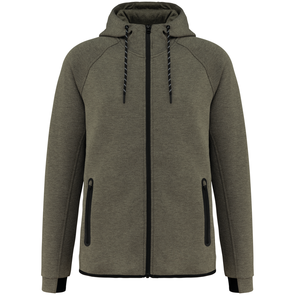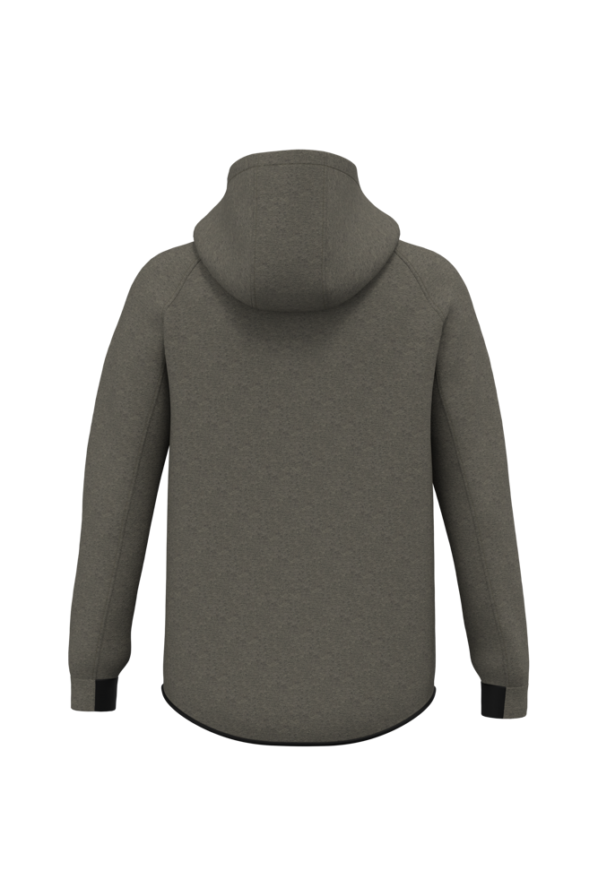 94% poliestere/ 6% elastan (79% poliestere/15% viscosa/ 6% elastan per i colori melange). Materiale ultra comodo. Chiusura con zip. 2 tasche conzip sul davanti e finitura termosaldata. Cappuccio con fodera jersey 65% poliestere/ 35% viscosa con coulisse bicolore e finitura puntale in plastica. Fondo manica stretto con una parte elastica a contrasto. Fondo capo con finitura a sbieco a contrasto. Black su tutti i colori e Dark Grey sull'erica di Ash Heather (anche le chiusure).