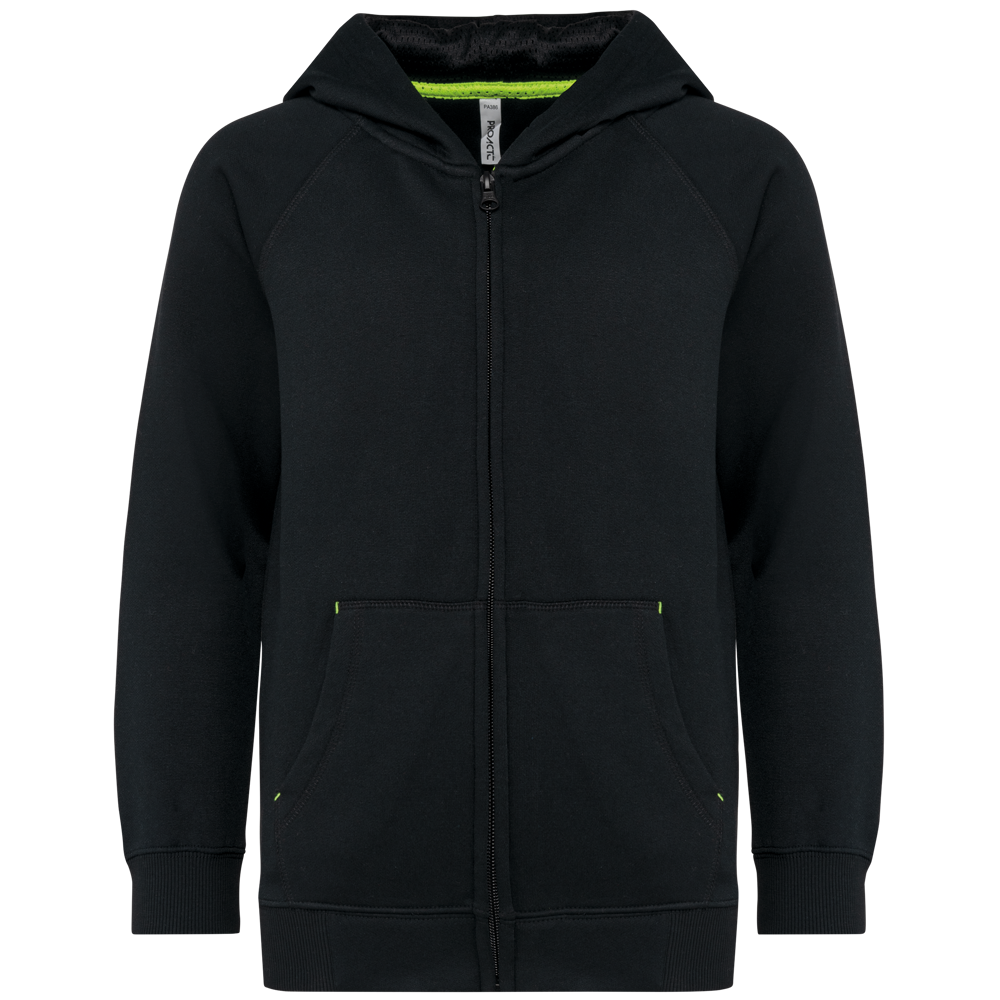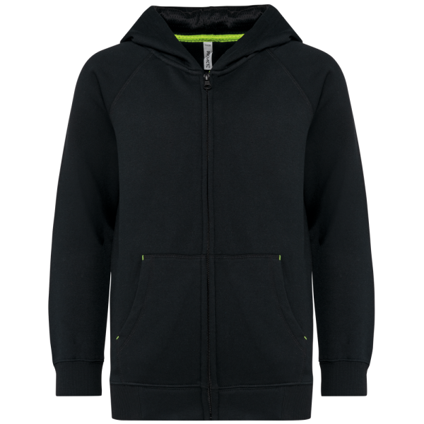 65% poliestere/ 35% cotone. Felpa garzata. Cotone pettinato. Filato Vortex. Taglio dritto. Maniche raglan. Chiusura a zip in nylon. Cappuccio foderato in rete tono su tono. Nastrino di rinforzo all'interno del cappuccio e cuciture di rinforzo sulle tasche in colori fluorescenti. Tasche a canguro con 1 tasca fluorescente per cellulare. Polsini e fondo capo a costine doppio spessore 2x2. Finitura a mezzaluna nella parte posteriore del collo che facilita la personalizzazione dall'interno. Etichetta con il nome del marchio staccabile.