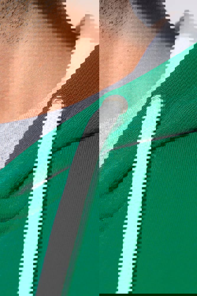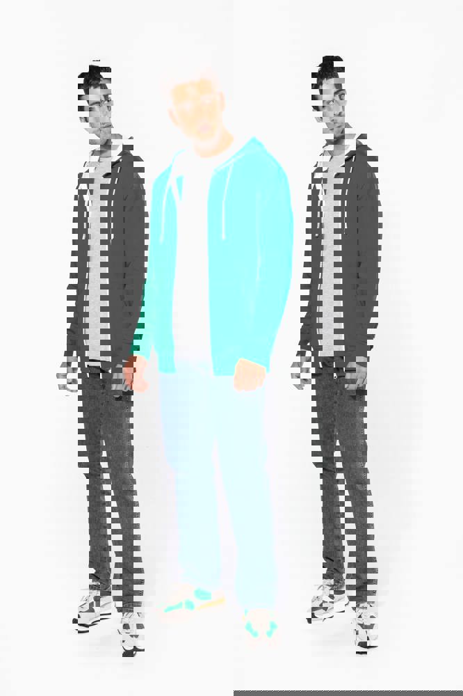 80% cotone / 20% poliestere. Cotone pettinato. Felpa garzata. Tasca a marsupio con accesso per auricolari. Fondo manica e fondo capo a costine. Cappuccio a contrasto foderato, con coulisse. Zip a contrasto.