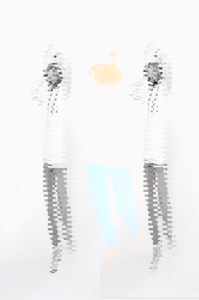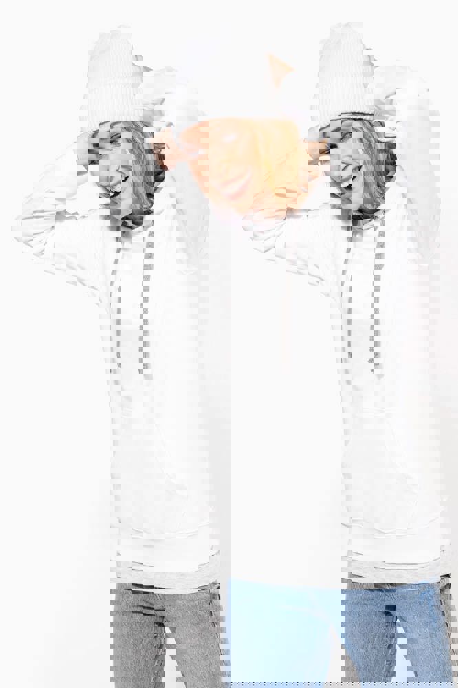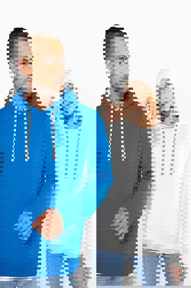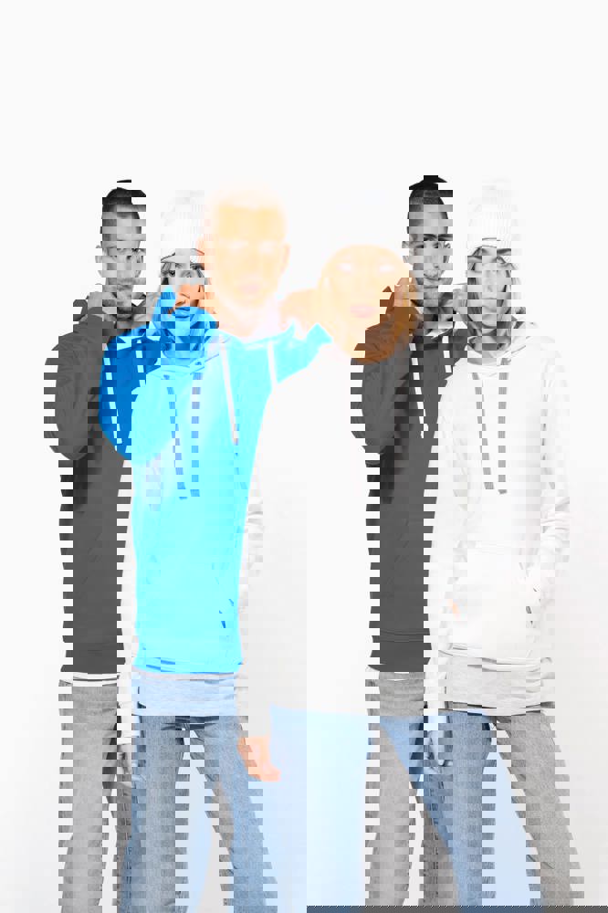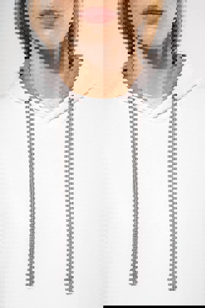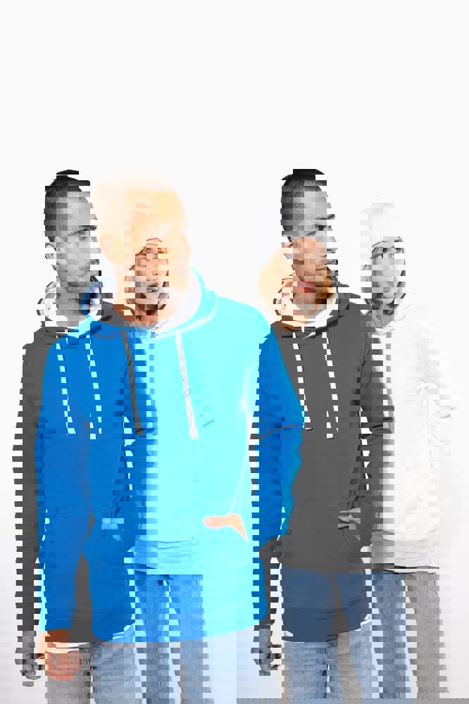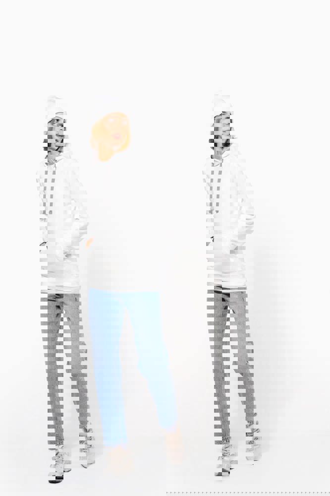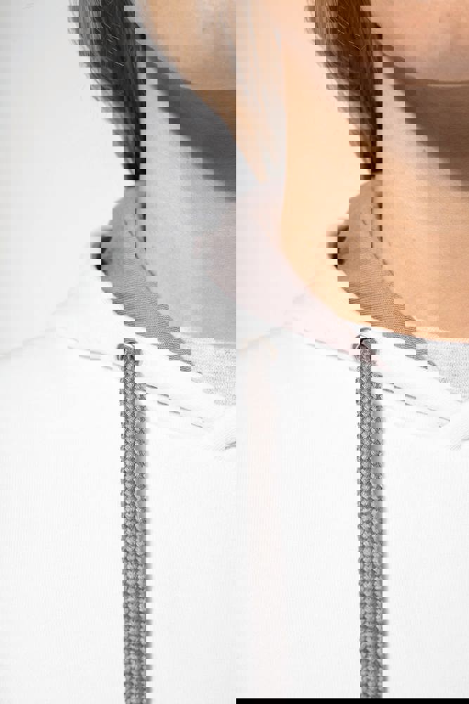80% cotone / 20% poliestere. Cotone pettinato. Felpa garzata. Tasca a marsupio con accesso per auricolari. Polsini e girovita in costina. Cappuccio foderato in contrasto di colore con coulisse.