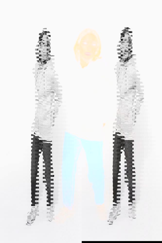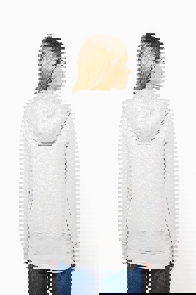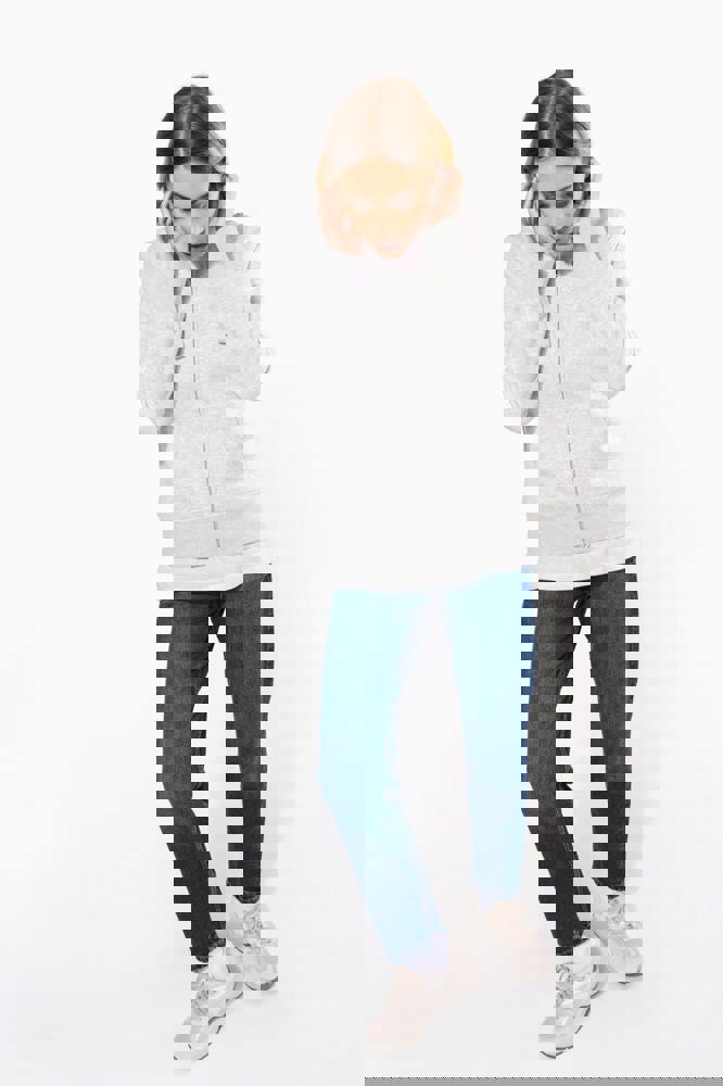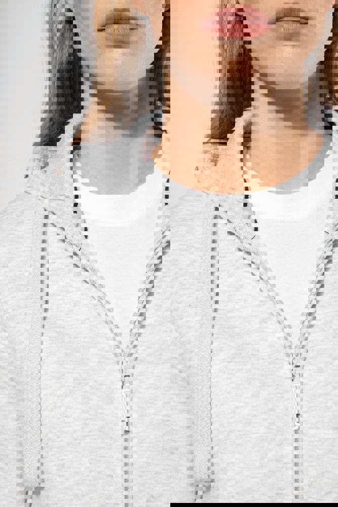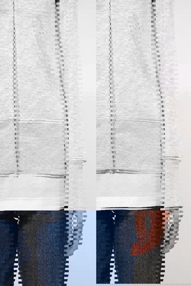 80% cotone / 20% poliestere (Ash Heather : 79% cotone / 20% poliestere / 1% viscosa). Superficie esterna 100% cotone pettinato. Felpa garzata. Nastrino di rinforzo a contrasto al collo (Navy per le tinte Oxford Grey e Ash Heather : Oxford Grey per tutti gli altri colori). Cappuccio foderato a nido d'ape. Tasche a canguro. Fondo manica e fondo capo a costine. Zip.
