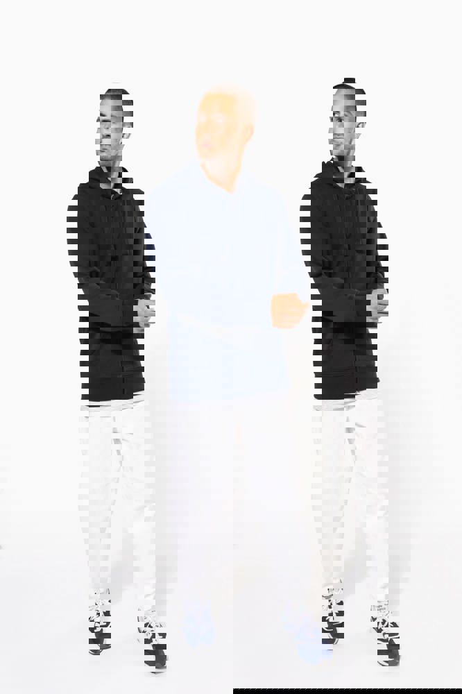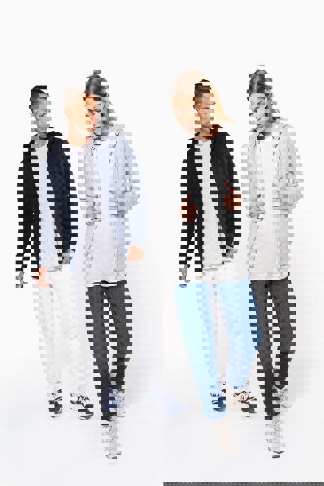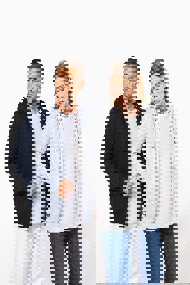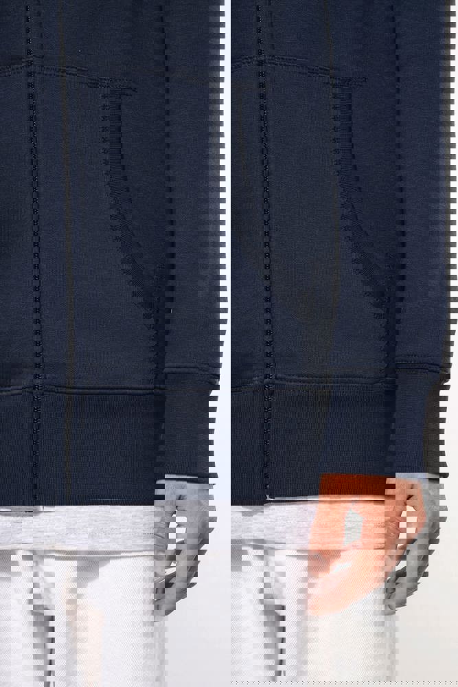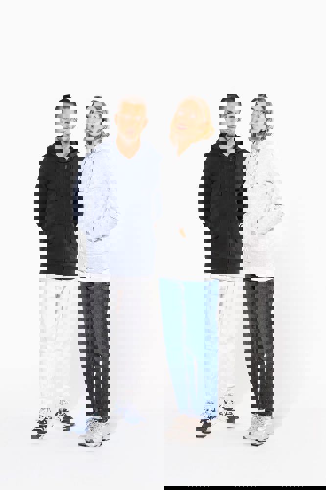 80% cotone / 20% poliestere (Ash Heather : 79% cotone / 20% poliestere / 1% viscosa). Cotone pettinato. Superficie esterna 100% cotone. Felpa garzata. Nastrino di rinforzo al collo in contrasto di colore (Contrasto in colore Oxford Grey per tutte le varianti colore, escluso per la variante Oxford Grey e Ash Heather dove il contrasto è nel colore Navy). Cappuccio foderato con cordoncino. Tasca a marsupio. Costine sulla tasca, polsini e girovita. Zip.