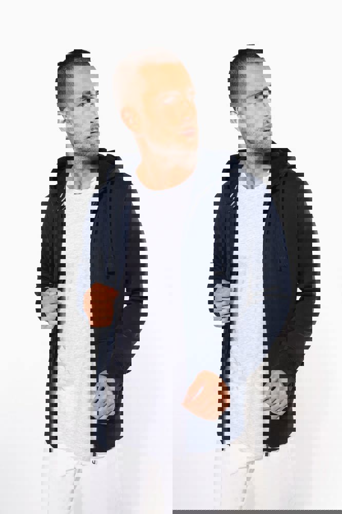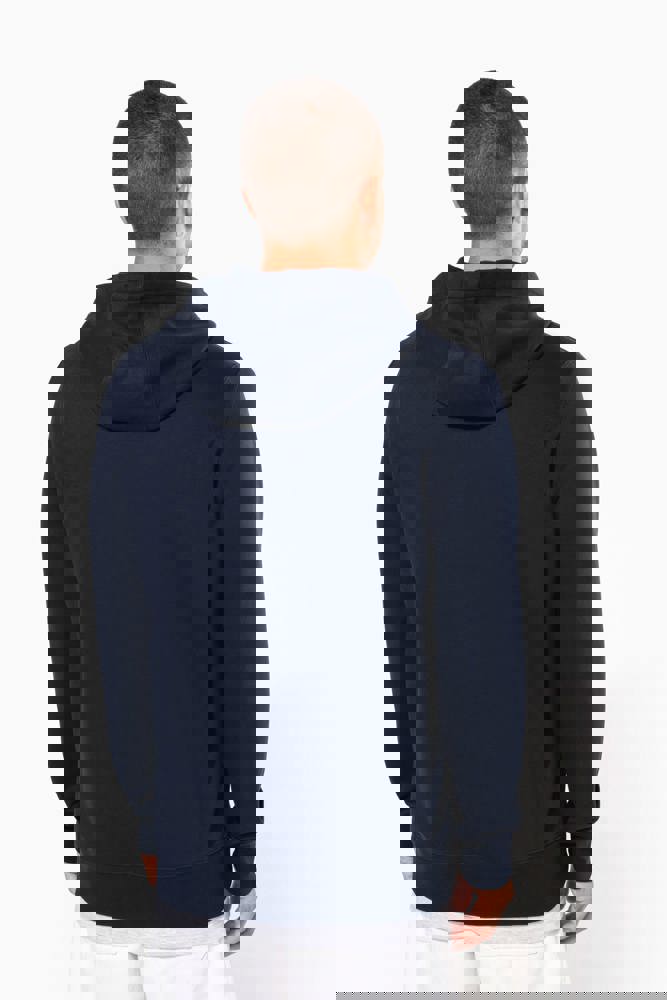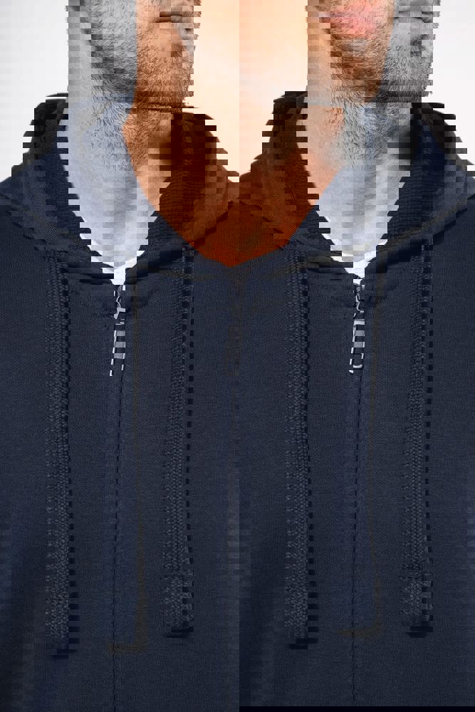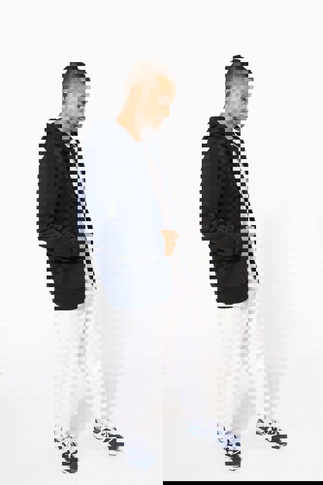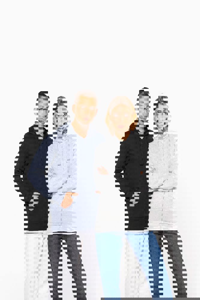 80% cotone / 20% poliestere (Ash Heather : 79% cotone / 20% poliestere / 1% viscosa). Cotone pettinato. Superficie esterna 100% cotone. Felpa garzata. Nastrino di rinforzo al collo in contrasto di colore (Contrasto in colore Oxford Grey per tutte le varianti colore, escluso per la variante Oxford Grey e Ash Heather dove il contrasto è nel colore Navy). Cappuccio foderato con cordoncino. Tasca a marsupio. Costine sulla tasca, polsini e girovita. Zip.