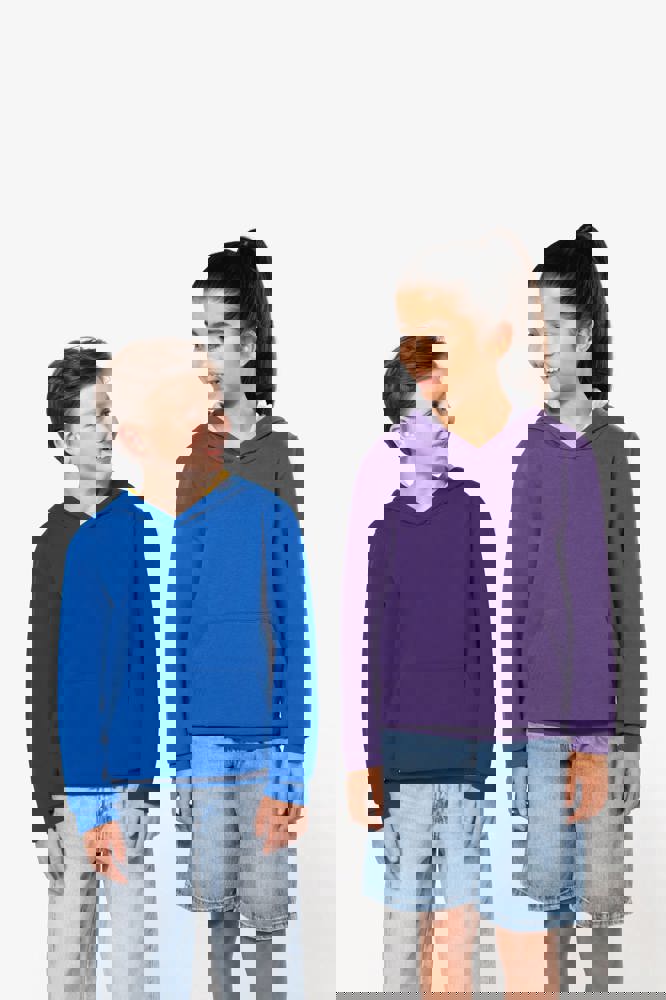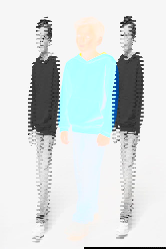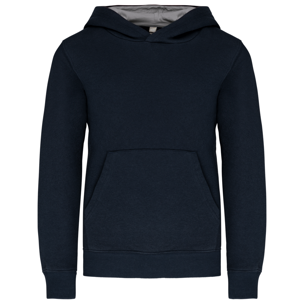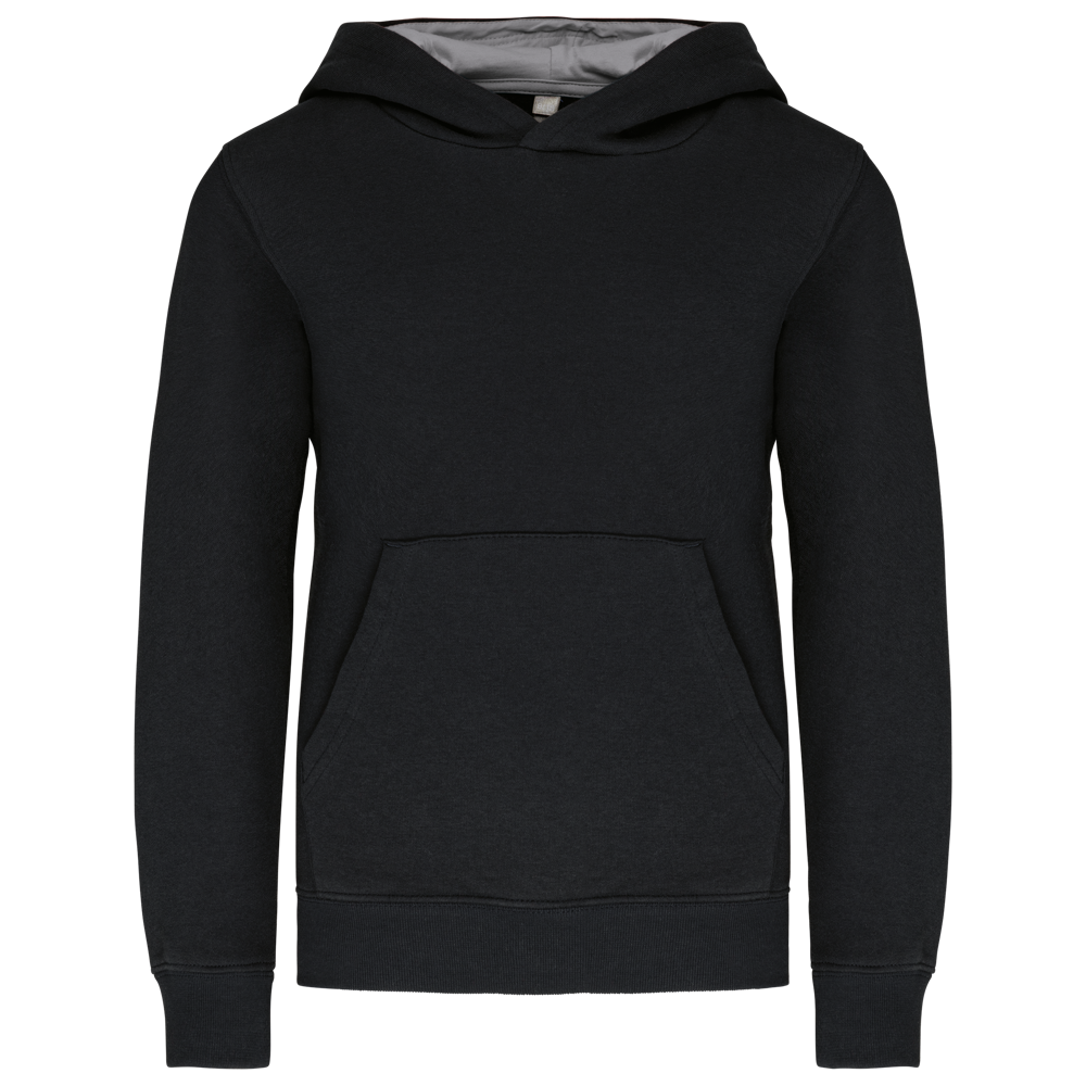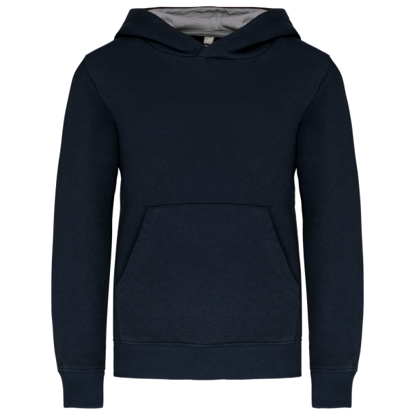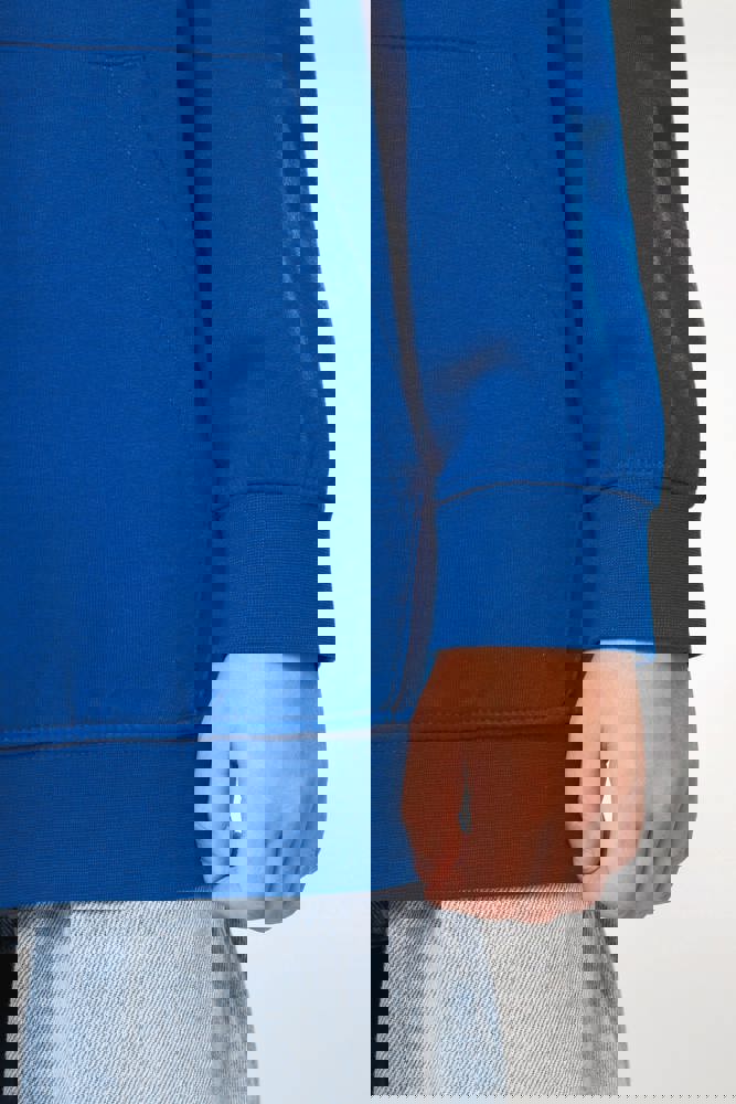 80% cotone / 20% poliestere. Cotone pettinato. Felpa garzata. Tasca a marsupio con accesso per auricolari. Polsini e girovita in costina. Cappuccio a contrasto foderato.