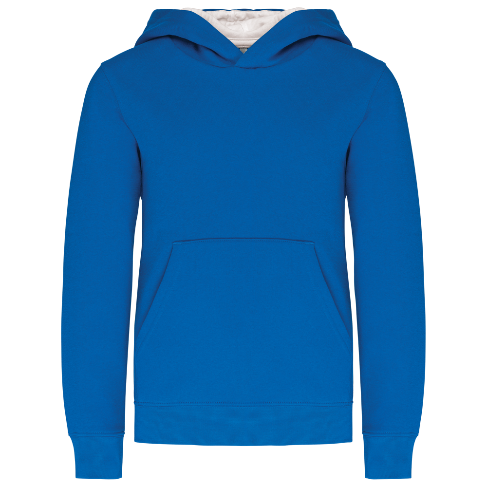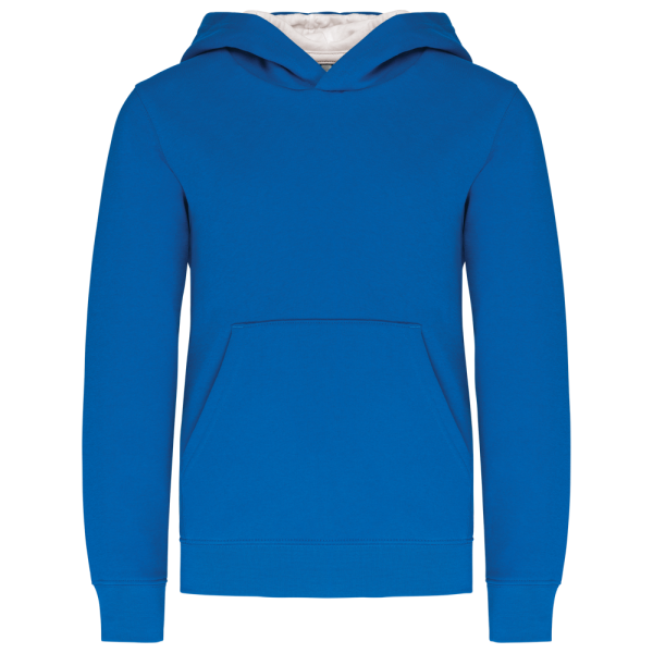 80% cotone / 20% poliestere. Cotone pettinato. Felpa garzata. Tasca a marsupio con accesso per auricolari. Polsini e girovita in costina. Cappuccio a contrasto foderato.
