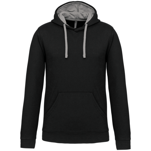 80% cotone / 20% poliestere. Cotone pettinato. Felpa garzata. Tasca a marsupio con accesso per auricolari. Polsini e girovita in costina. Cappuccio foderato in contrasto di colore con coulisse.