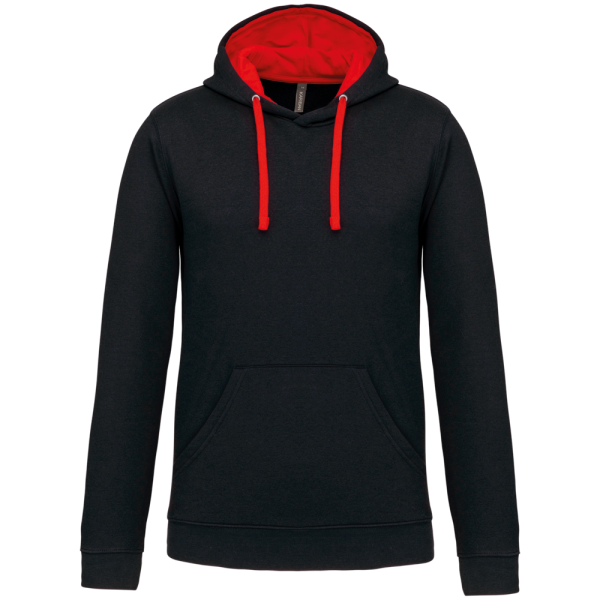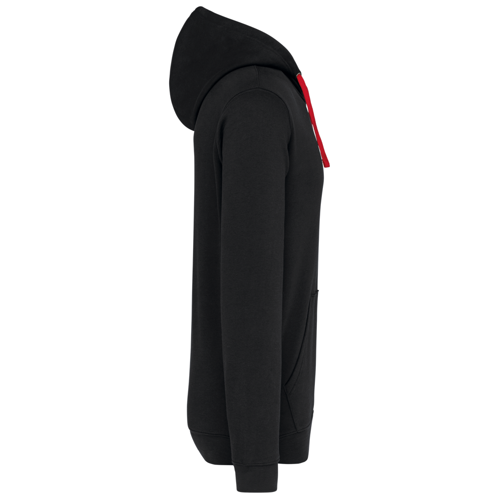 80% cotone / 20% poliestere. Cotone pettinato. Felpa garzata. Tasca a marsupio con accesso per auricolari. Polsini e girovita in costina. Cappuccio foderato in contrasto di colore con coulisse.
