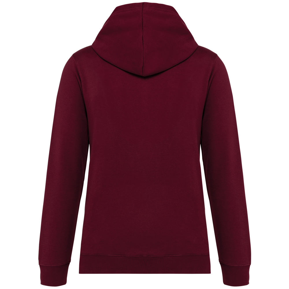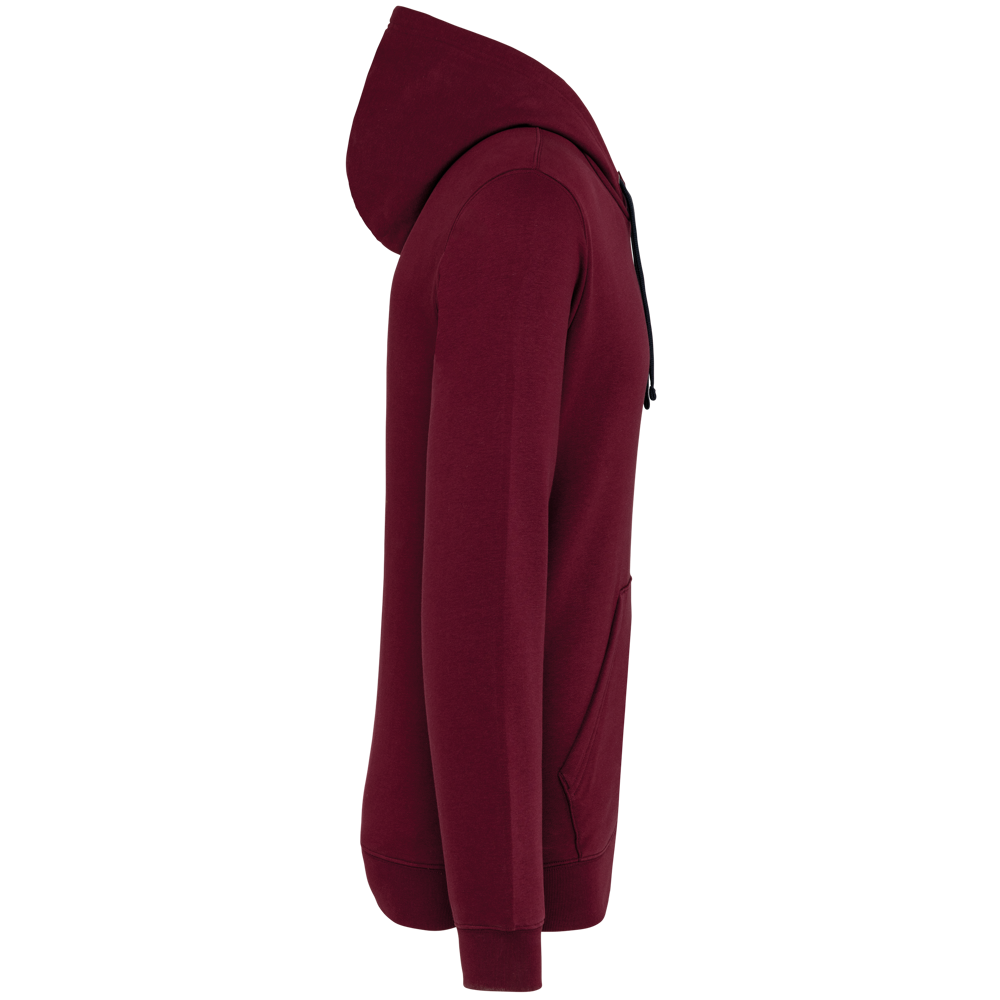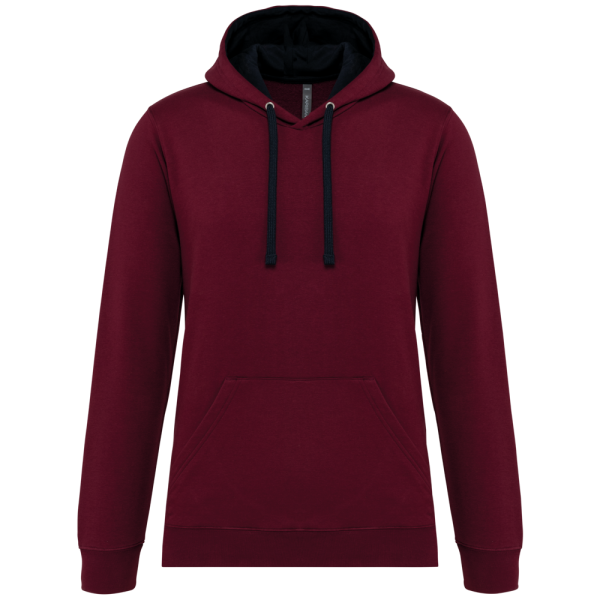 80% cotone / 20% poliestere. Cotone pettinato. Felpa garzata. Tasca a marsupio con accesso per auricolari. Polsini e girovita in costina. Cappuccio foderato in contrasto di colore con coulisse.