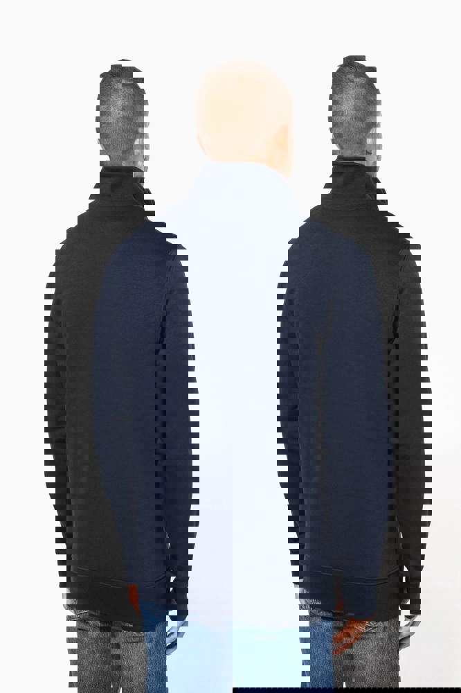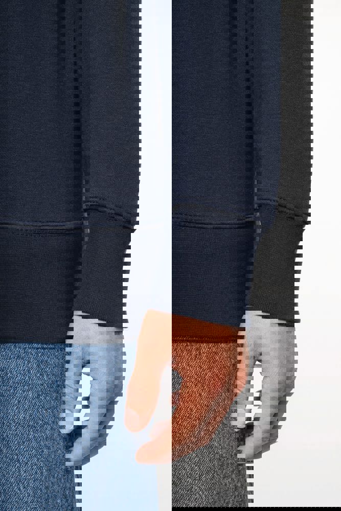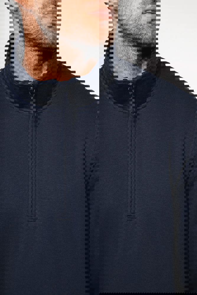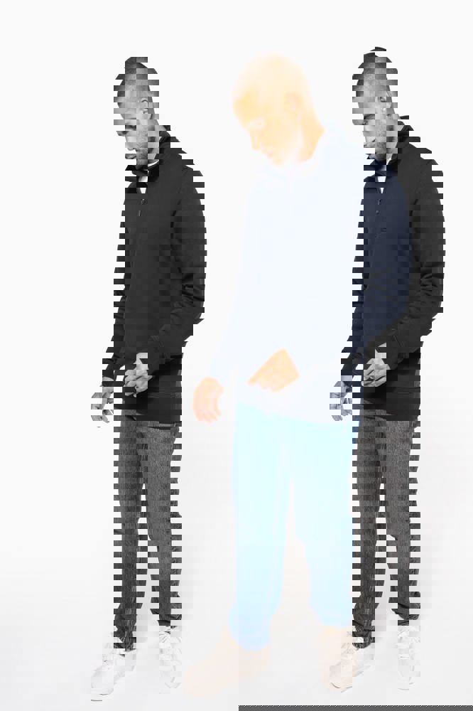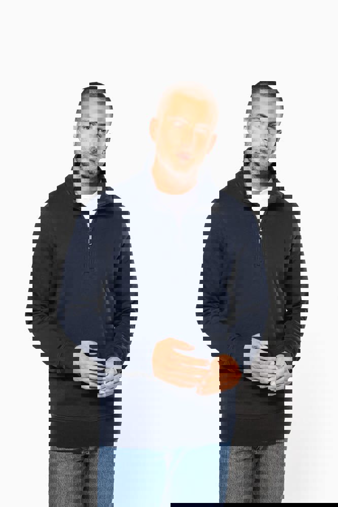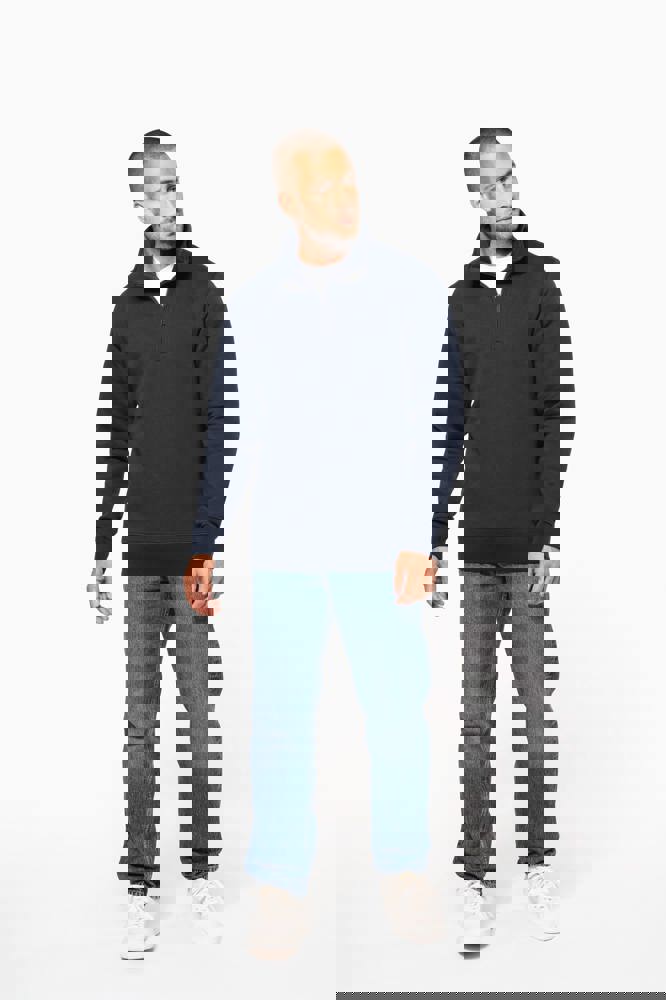 80% cotone / 20% poliestere (Ash Heather : 79% cotone / 20% poliestere / 1% viscosa). Superficie esterna 100% cotone. Trattamento LSF (Low Shrinkage Fleece: felpa preristretta). Felpa garzata a 3 fili in cotone pettinato. Maniche a giro. 1/4 zip in plastica tono su tono. Nastrino di rinforzo a contrasto sul collo (Contrasto in colore Oxford Grey per tutte le varianti colore, escluso per la variante Oxford Grey e Ash Heather dove il contrasto è nel colore Navy). Polsini e fondo capo a costine.