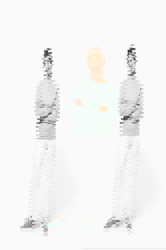 Colori Snow Grey, Sage e Lemon Yellow : 80% cotone biologico /20% poliestere riciclato. Colori Black, French Navy Heather, Grey Heather, Mossy Green, Navy, Ocean Blue Heather, Red, Storm Grey and Wine Heather : 80% cotone biologico /20% poliestere. Pile non spazzolato (French Terry). LST (Low Shrinkage Terry). Vestibilità alla moda. Collo, orlo e polsini a costine. Fettuccia a spina di pesce all'interno collo ed inserto con punto a V. Nessuna etichetta del marchio, solo un'etichetta della taglia per facilitare la personalizzazione.