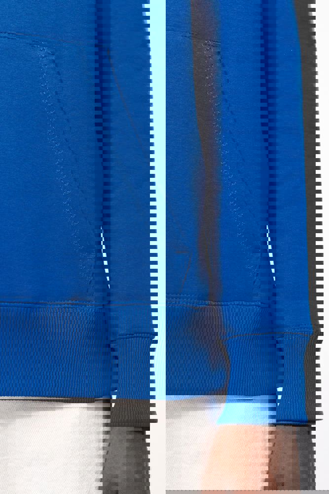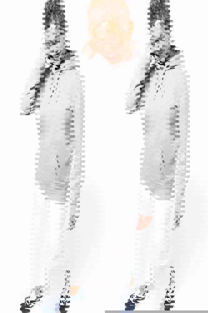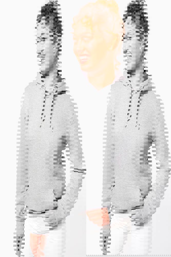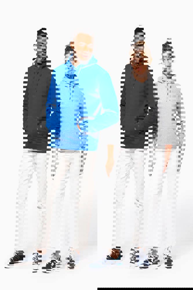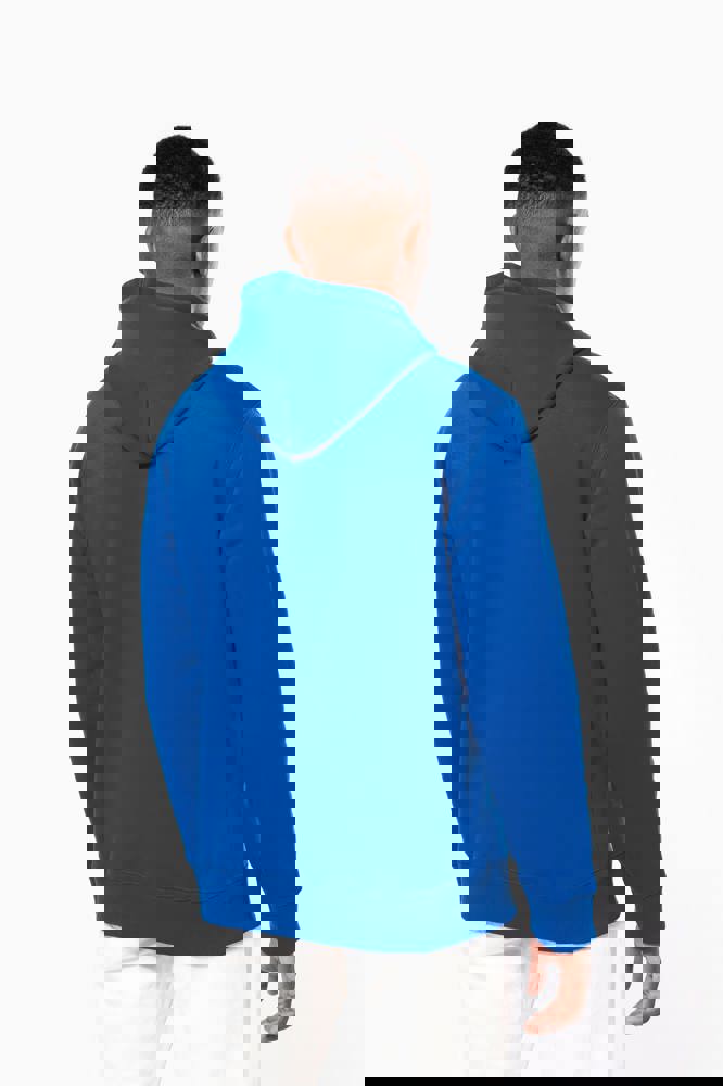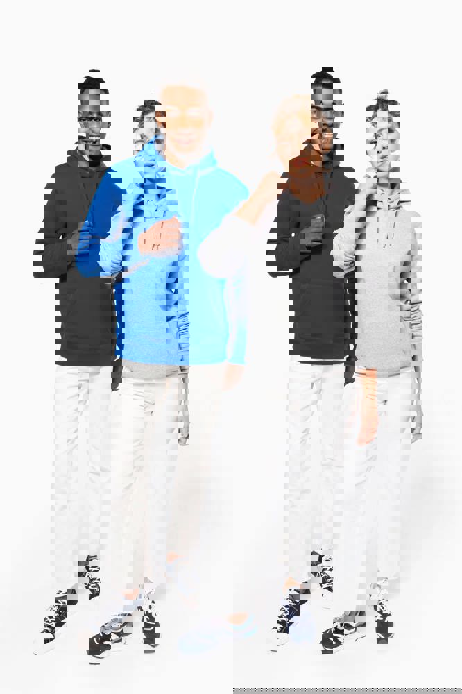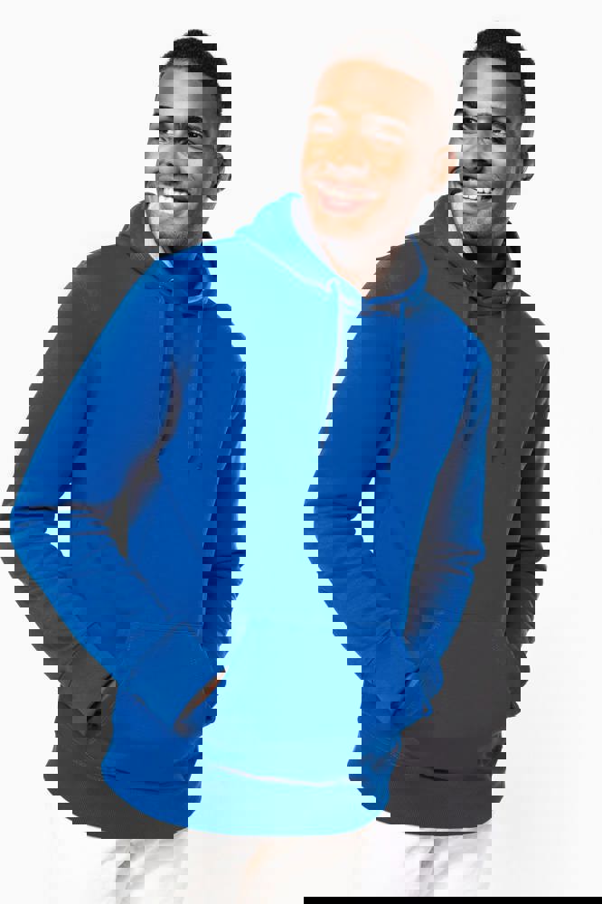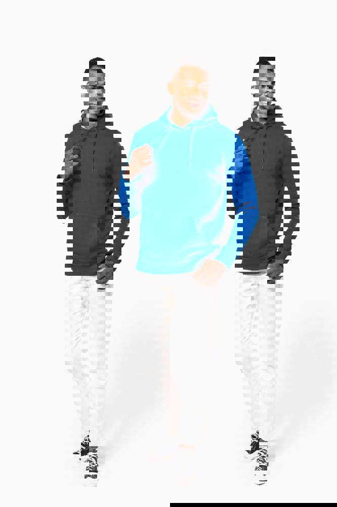 80% cotone / 20% poliestere. Cotone pettinato. Felpa garzata a basso restringimento. Lavaggio al silicone. Nastrino di rinforzo in contrasto al collo. Interno cappuccio in contrasto. Tasca frontale a marsupio. Polsini e girovita in costina.