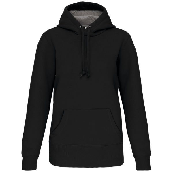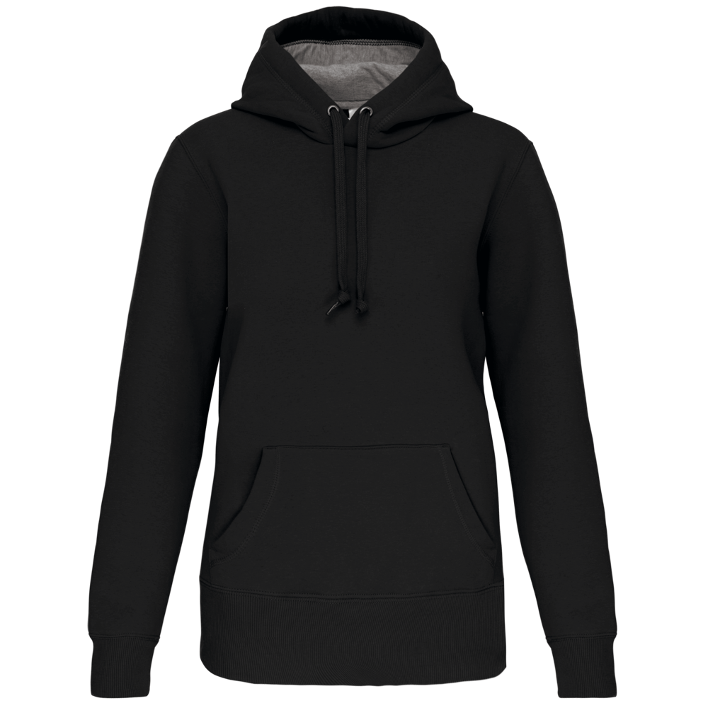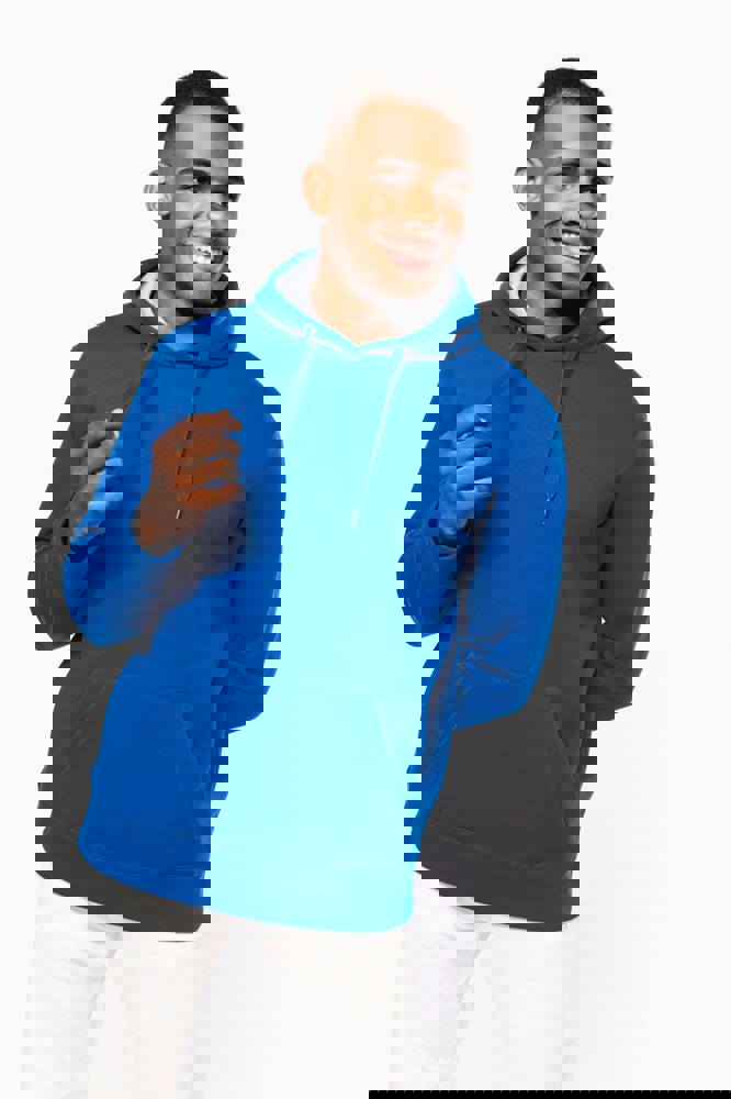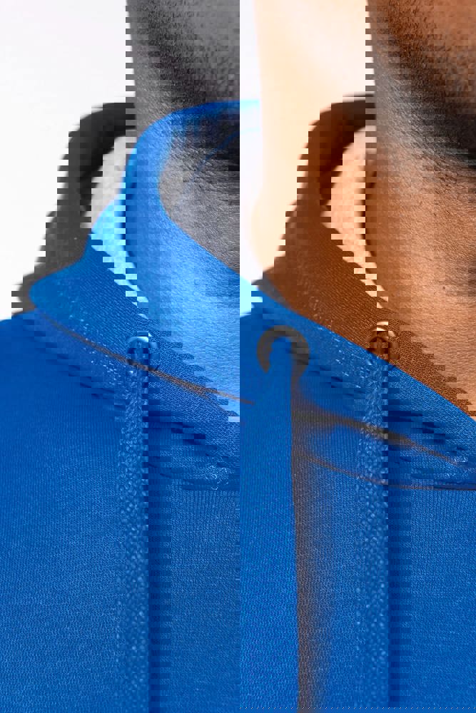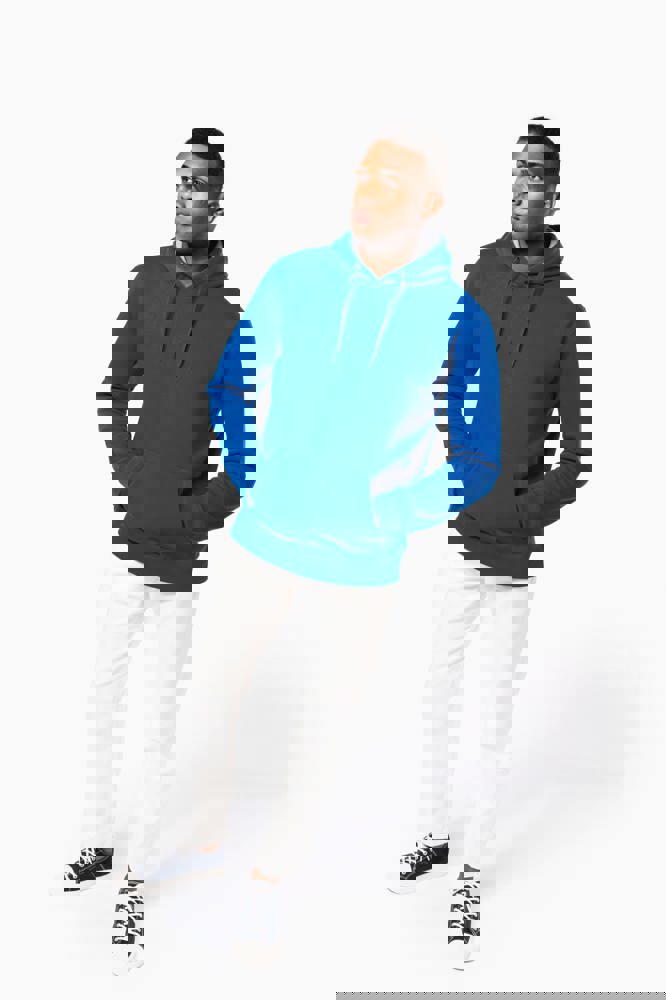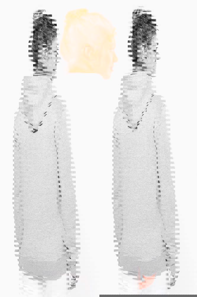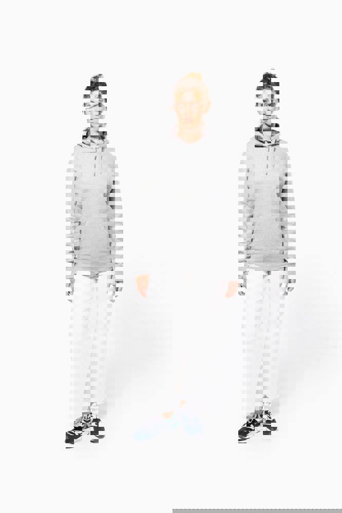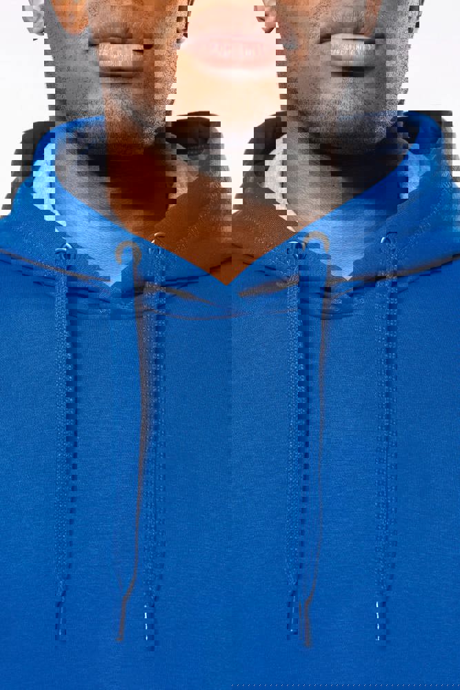 80% cotone / 20% poliestere. Cotone pettinato. Felpa garzata a basso restringimento. Lavaggio al silicone. Nastrino di rinforzo in contrasto al collo. Interno cappuccio in contrasto. Tasca frontale a marsupio. Polsini e girovita in costina.