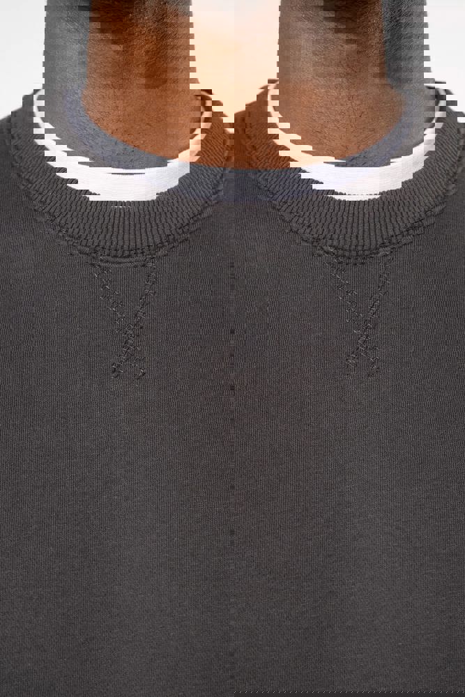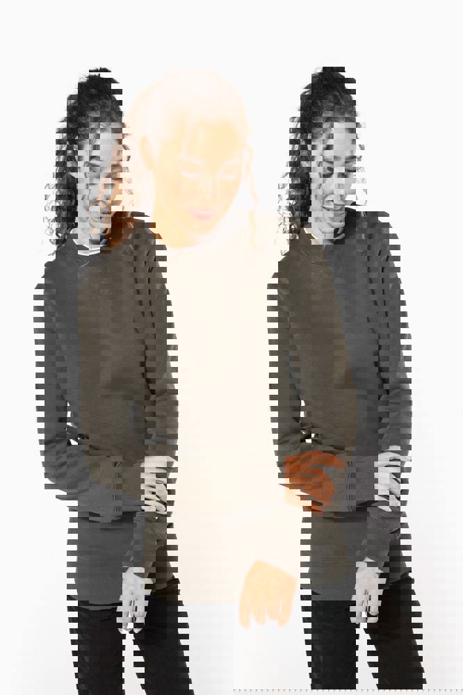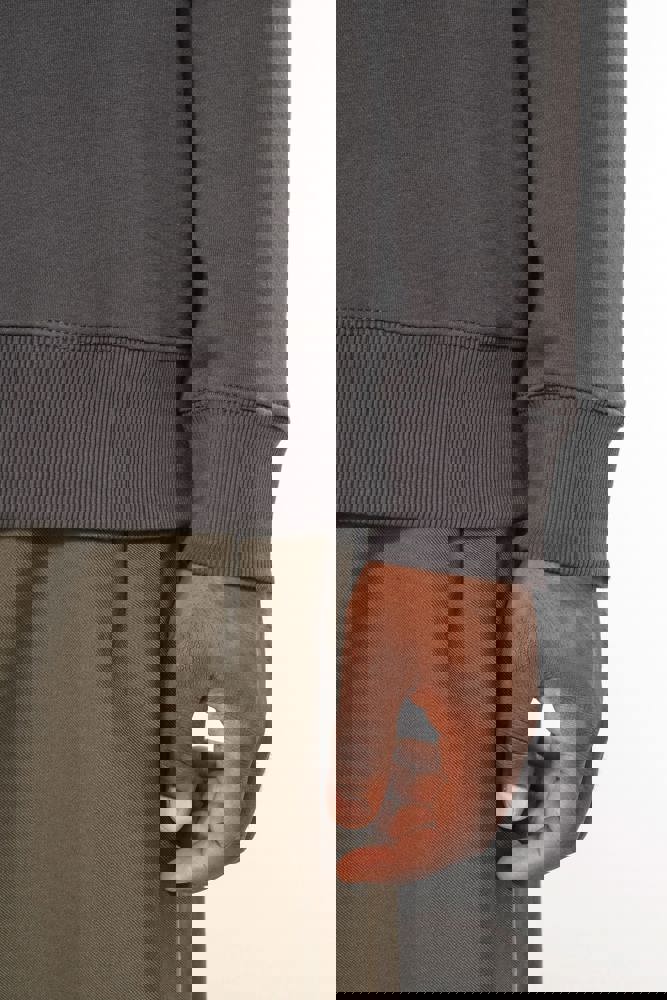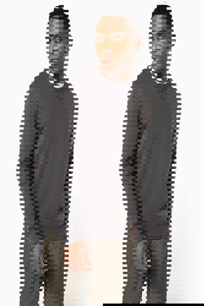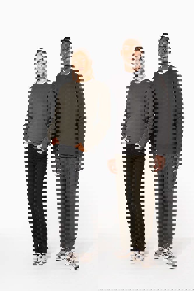 80% cotone / 20% poliestere. Cotone pettinato. Felpa garzata a basso restringimento. Lavaggio al silicone. Collo in costina e maniche Set-in. Nastrino di rinforzo al collo in contrasto di colore (Contrasto in colore Heather Grey per tutte le varianti colore, escluso per la variante Oxford Grey dove il contrasto è nel colore Middle Grey). Collo, polsini e girovita in costina.