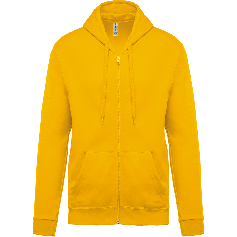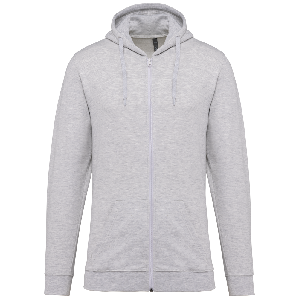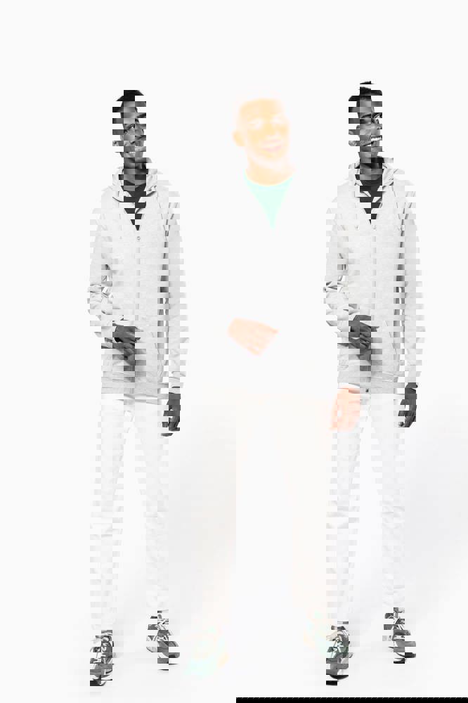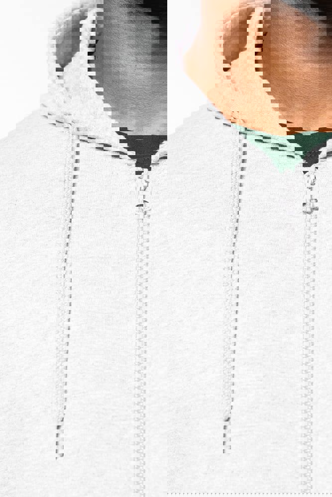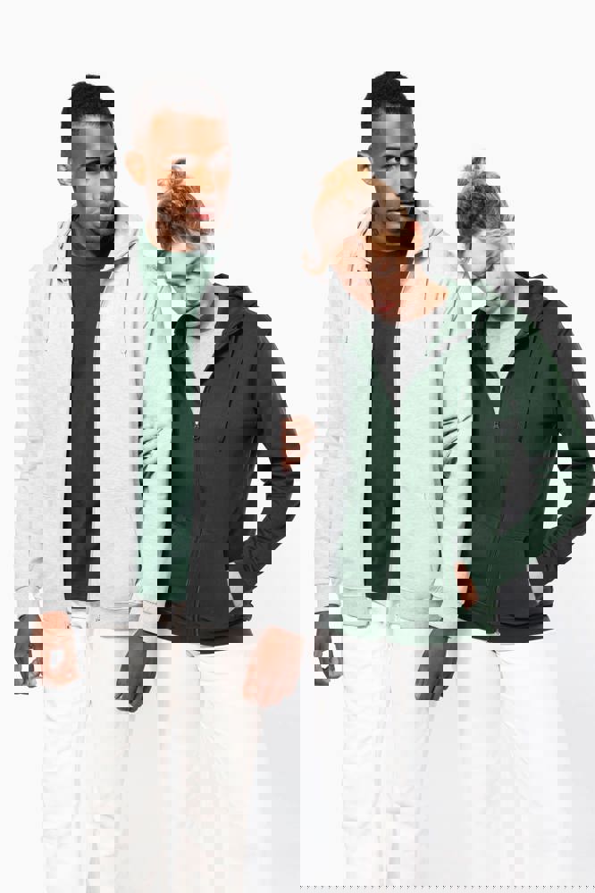 80% cotone / 20% poliestere. Cotone pettinato. Felpa garzata. Maniche a giro. Zip in nylon. Cappuccio foderato con coulisse tono su tono. Tasche a canguro. Fondo manica e fondo capo a costine.
