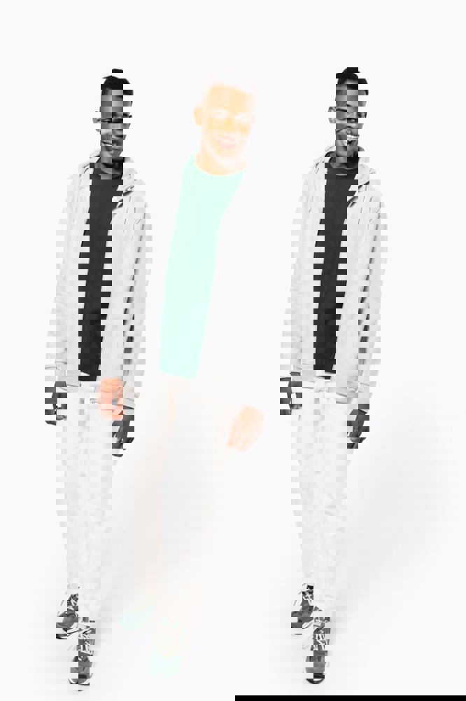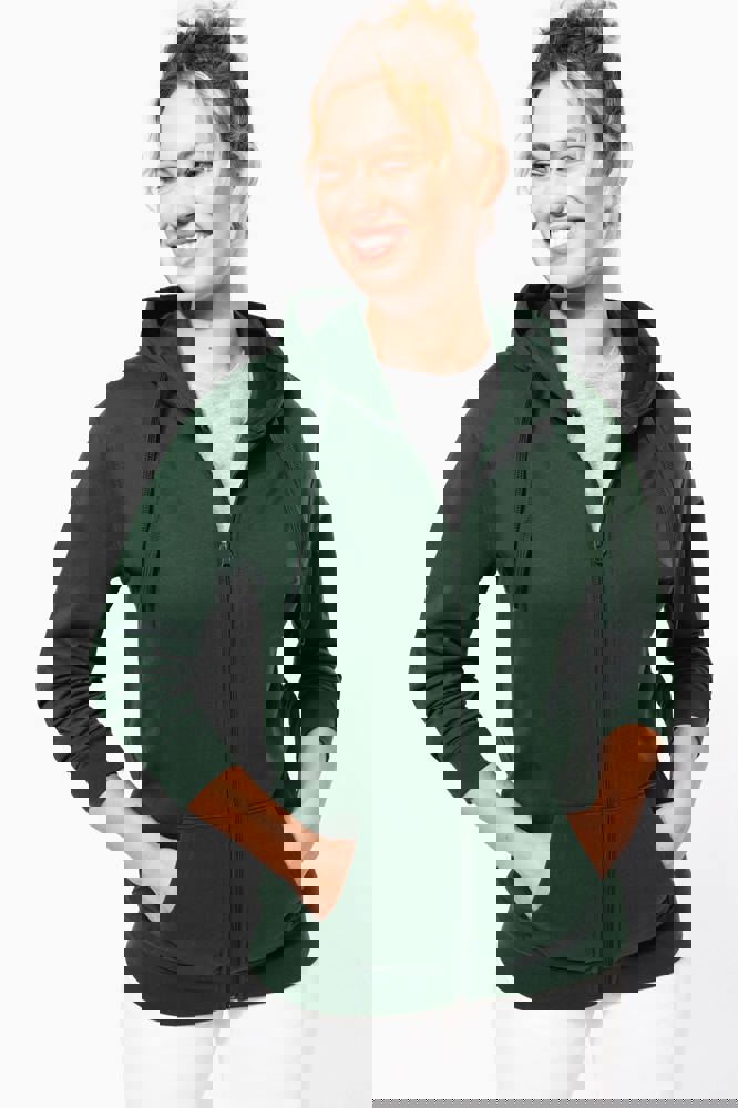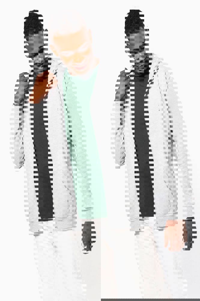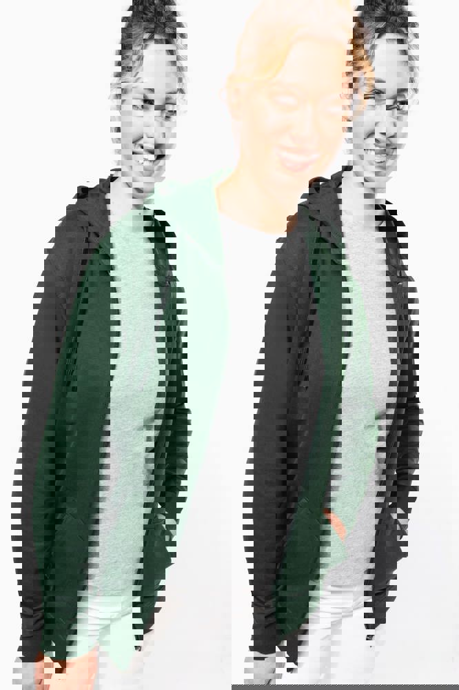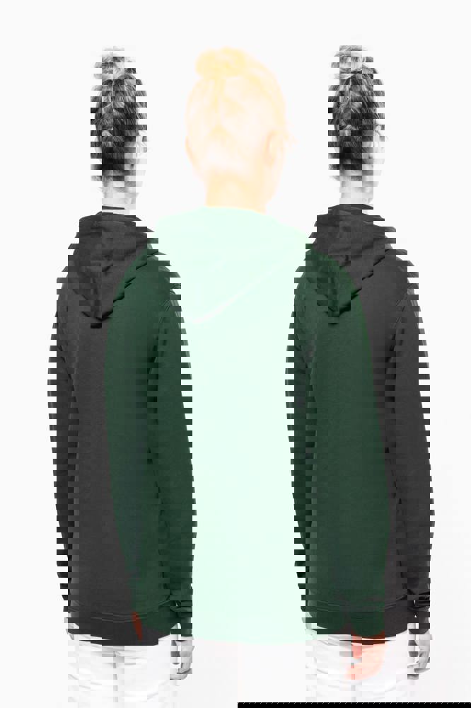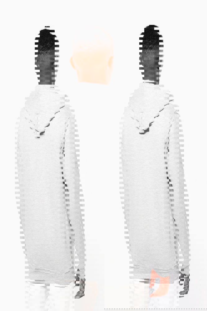 80% cotone / 20% poliestere. Cotone pettinato. Felpa garzata. Maniche a giro. Zip in nylon. Cappuccio foderato con coulisse tono su tono. Tasche a canguro. Fondo manica e fondo capo a costine.