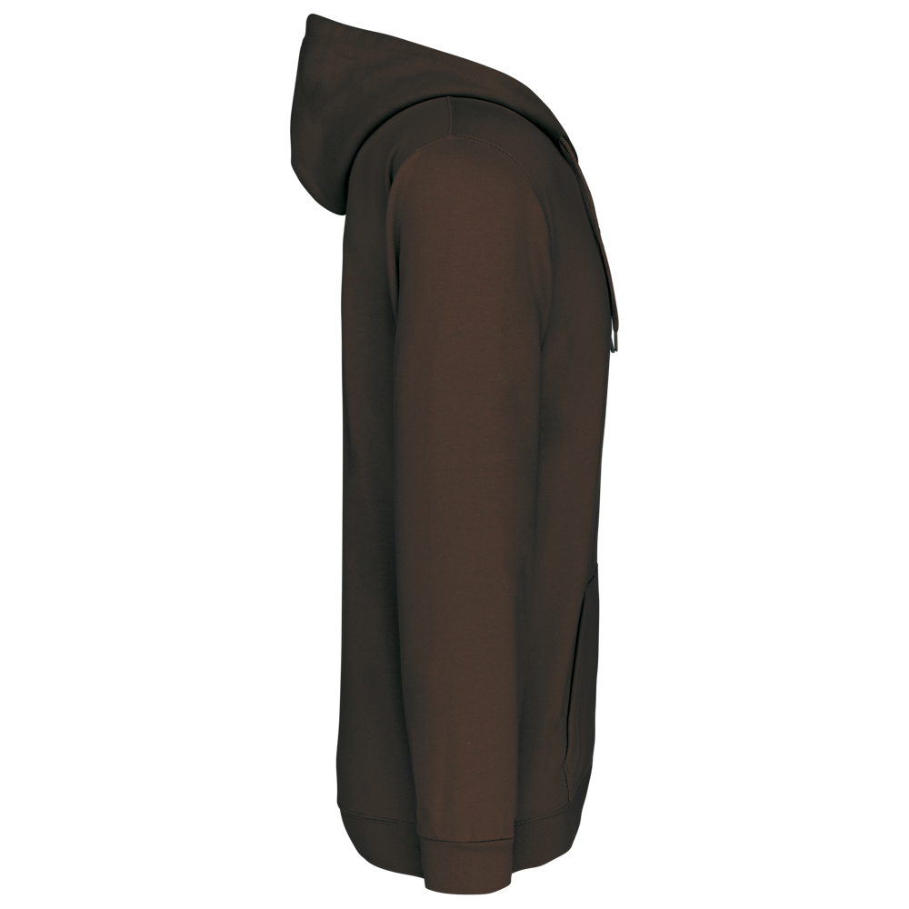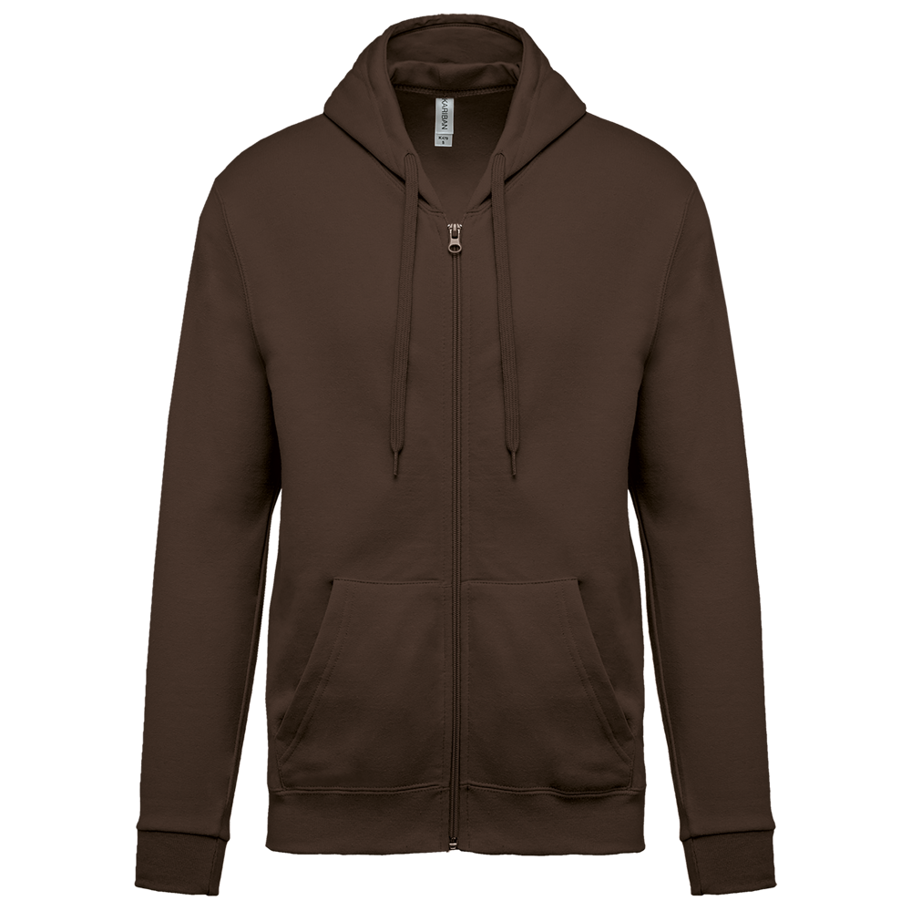 80% cotone / 20% poliestere. Cotone pettinato. Felpa garzata. Maniche a giro. Zip in nylon. Cappuccio foderato con coulisse tono su tono. Tasche a canguro. Fondo manica e fondo capo a costine.