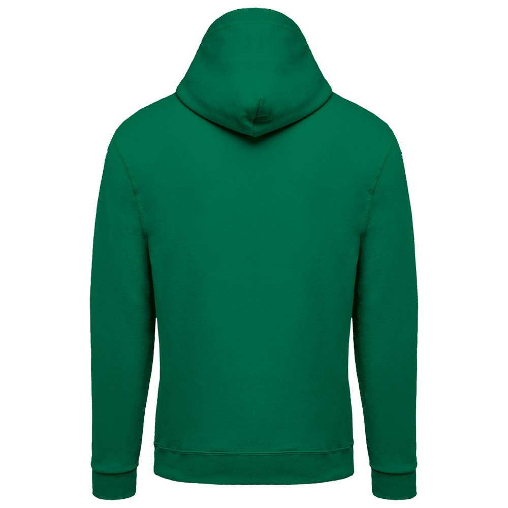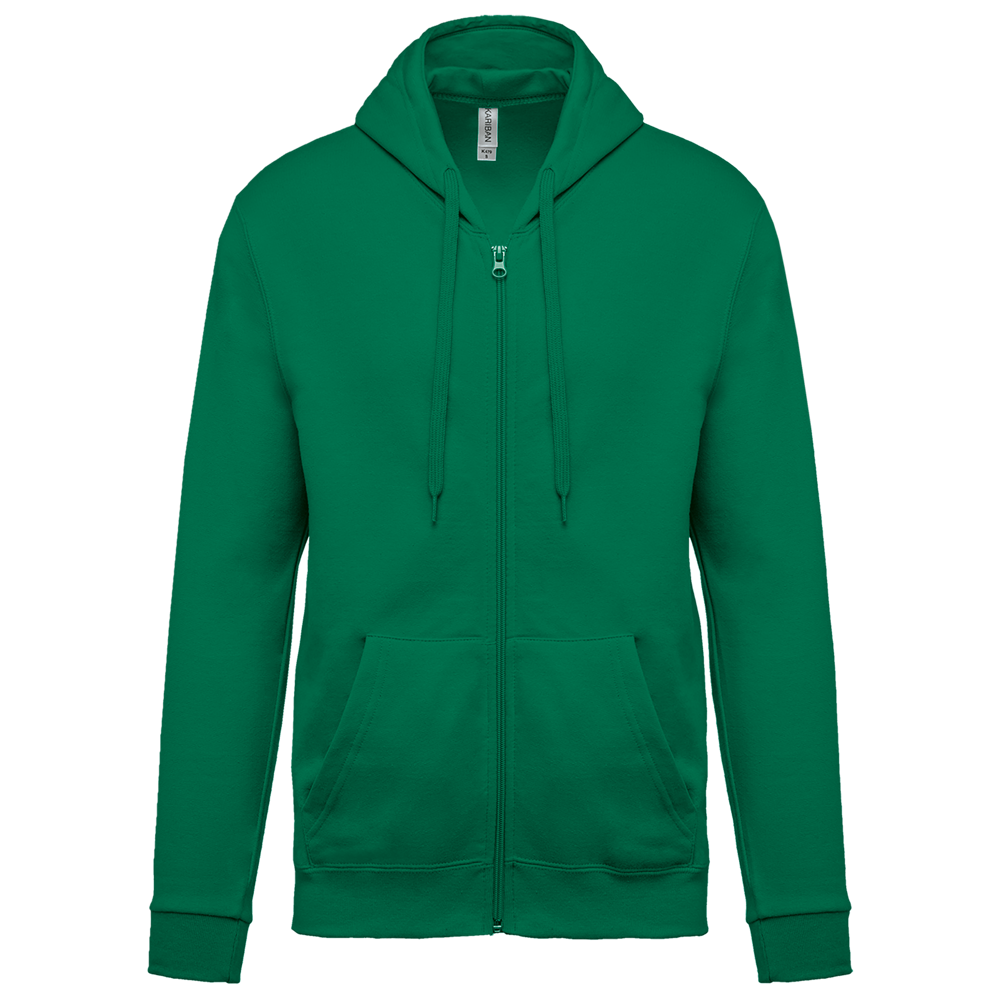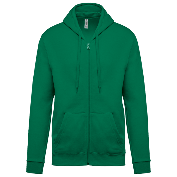 80% cotone / 20% poliestere. Cotone pettinato. Felpa garzata. Maniche a giro. Zip in nylon. Cappuccio foderato con coulisse tono su tono. Tasche a canguro. Fondo manica e fondo capo a costine.