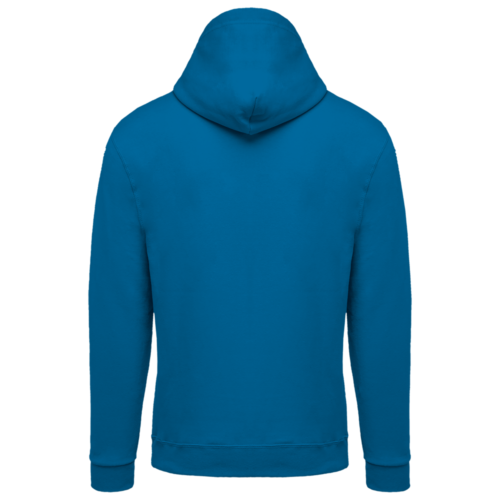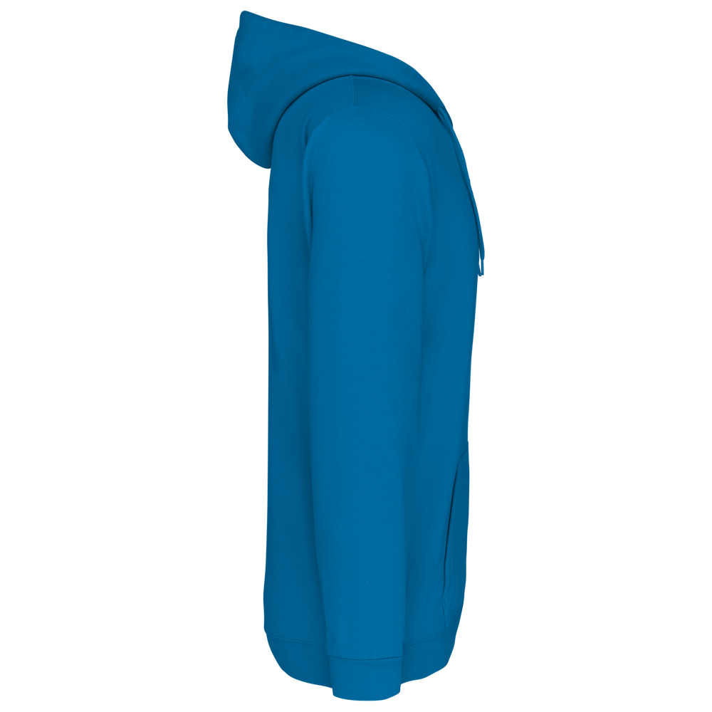 80% cotone / 20% poliestere. Cotone pettinato. Felpa garzata. Maniche a giro. Zip in nylon. Cappuccio foderato con coulisse tono su tono. Tasche a canguro. Fondo manica e fondo capo a costine.