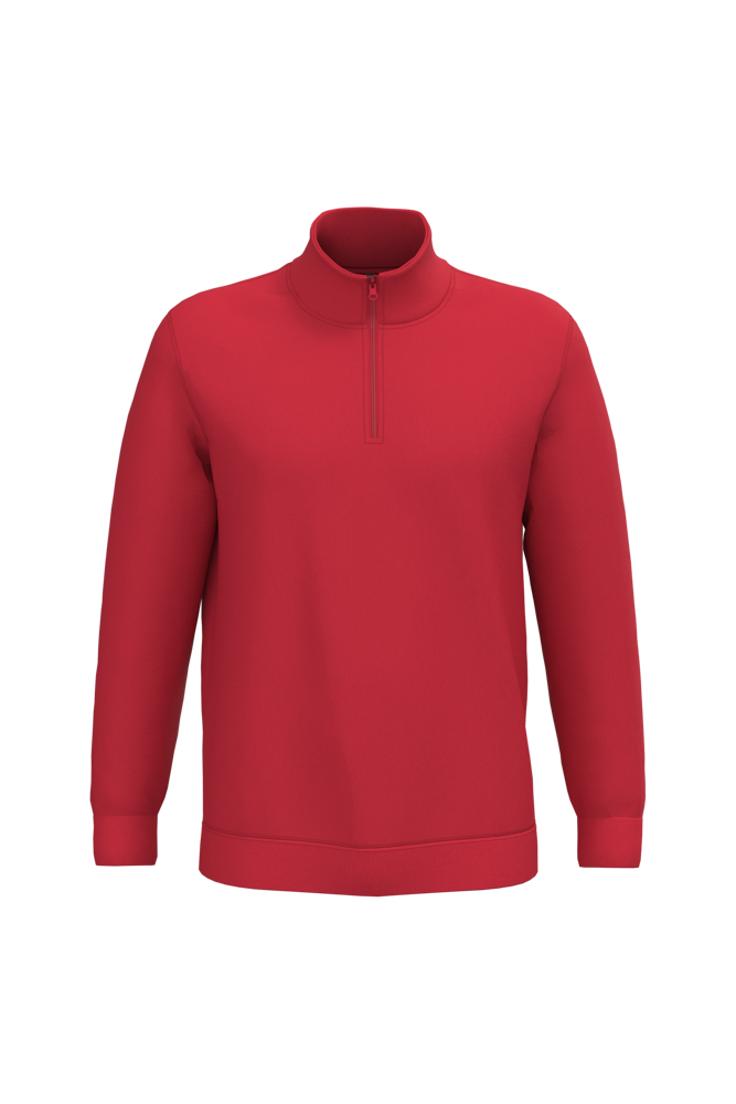 80% cotone / 20% poliestere. Cotone pettinato. Felpa garzata. Maniche a giro. Collo con zip con nastrino di rinforzo. Fondo manica e fondo capo a costine tono su tono.