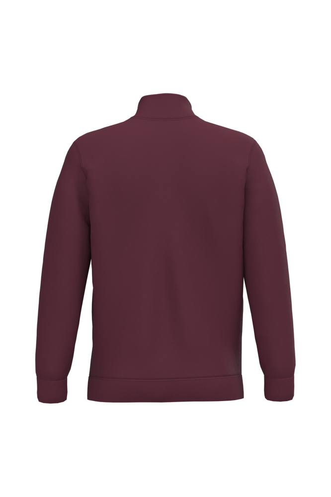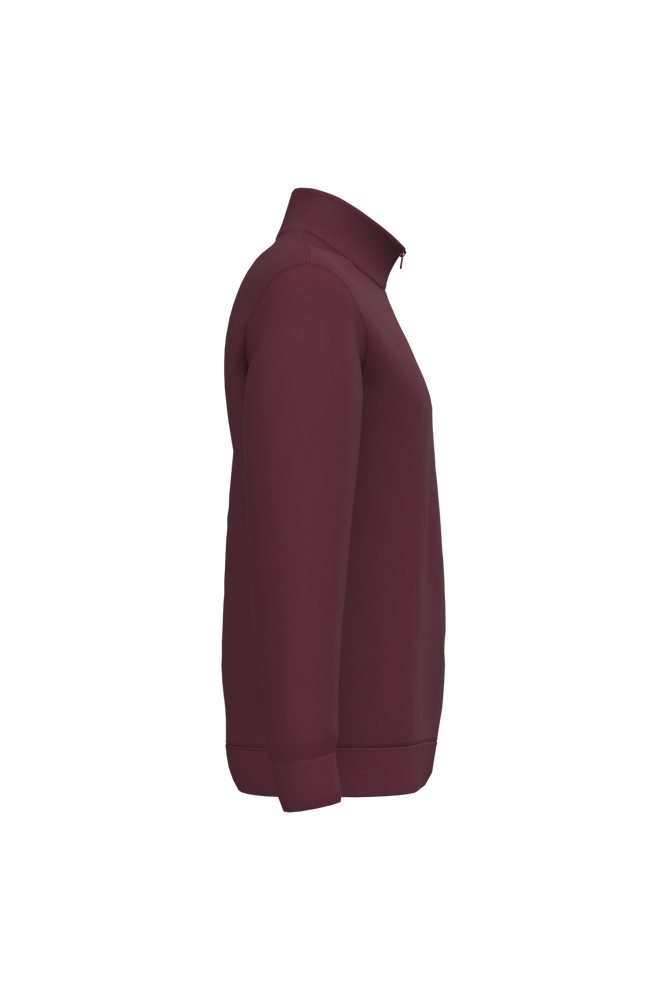 80% cotone / 20% poliestere. Cotone pettinato. Felpa garzata. Maniche a giro. Collo con zip con nastrino di rinforzo. Fondo manica e fondo capo a costine tono su tono.