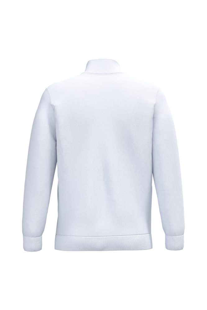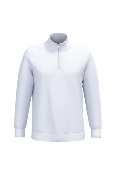 80% cotone / 20% poliestere. Cotone pettinato. Felpa garzata. Maniche a giro. Collo con zip con nastrino di rinforzo. Fondo manica e fondo capo a costine tono su tono.
