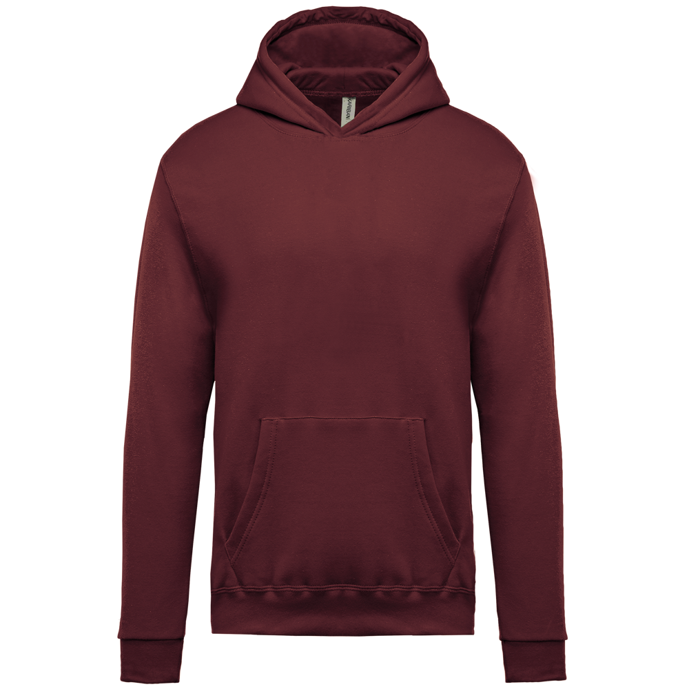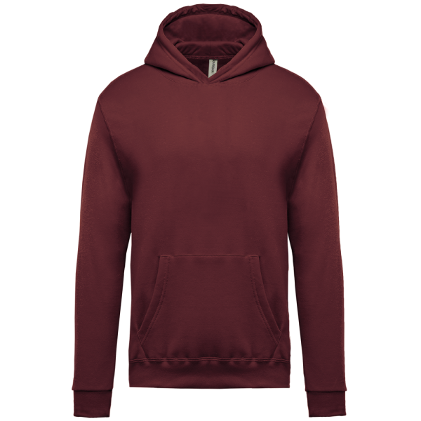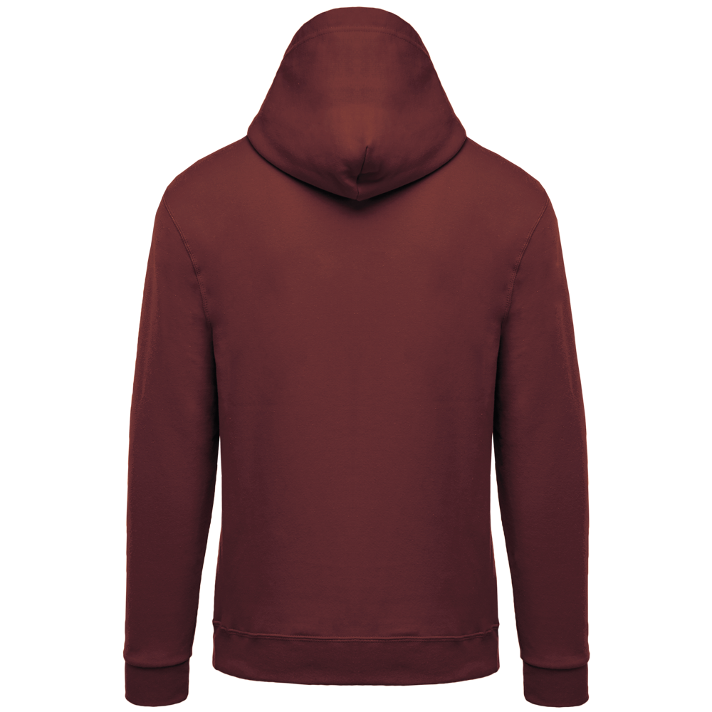 80% cotone / 20% poliestere. Cotone pettinato. Felpa garzata. Maniche a giro. Cappuccio foderato. Tasche a canguro. Fondo manica e fondo capo a costine.