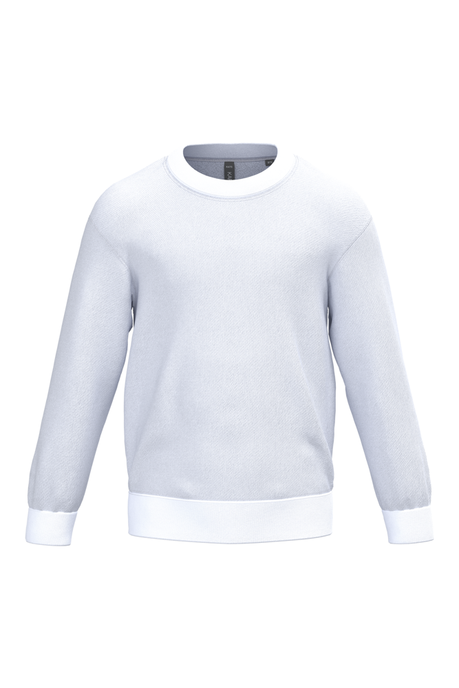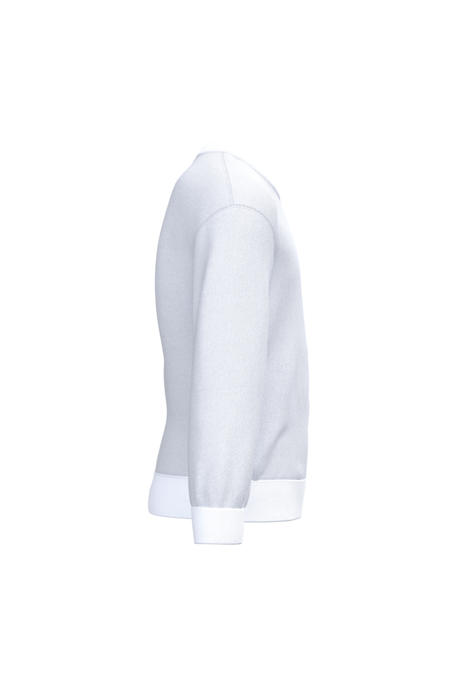 80% cotone / 20% poliestere. Cotone pettinato. Felpa garzata. Maniche a giro. Collo, fondo manica e fondo capo a costine.