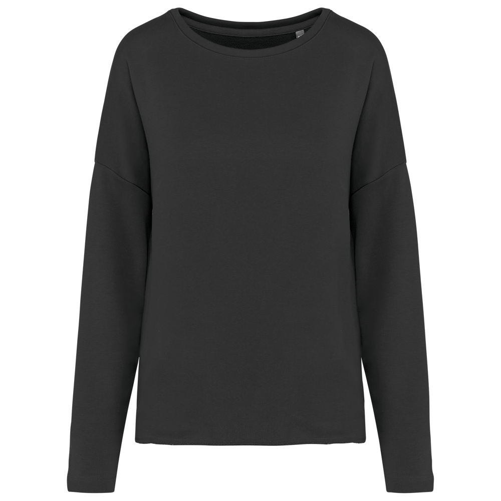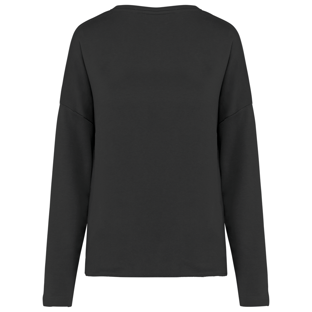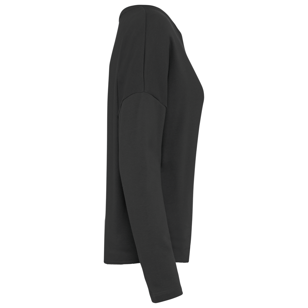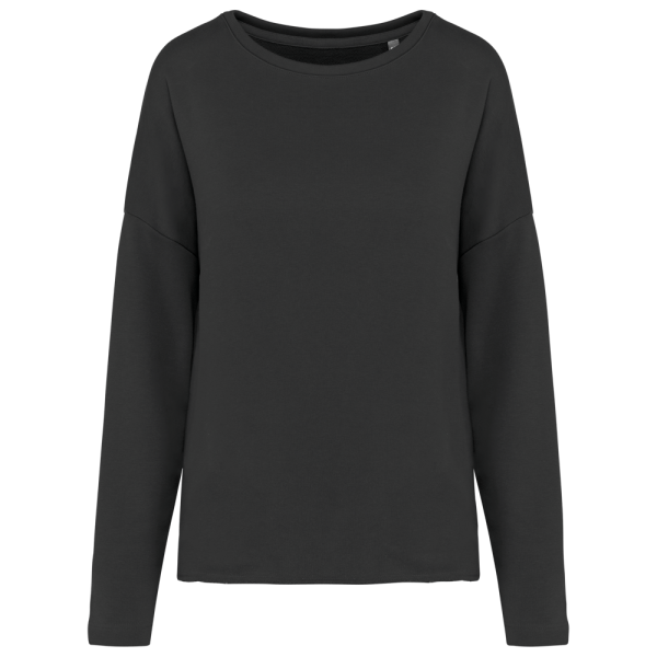 91% cotone / 9% poliestere (Light Grey Heather: 87% cotone / 9% poliestere / 4% viscosa). Felpa non garzata «French Terry». Tessuto ultra morbido. Taglio loose a vestibilità comoda con collo largo. Nastrino di rinforzo con motivo spigato. Bordi tagliati a vivo a fondo capo. Finiture a doppia impuntura a fondo manica.