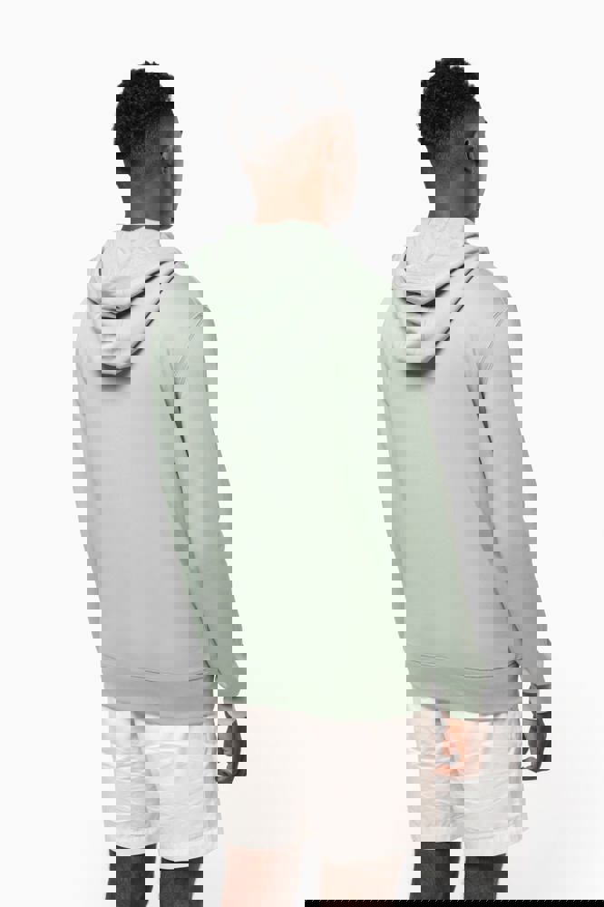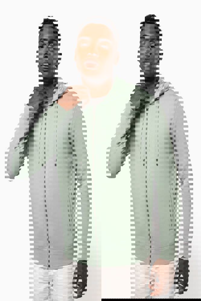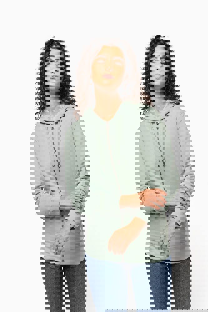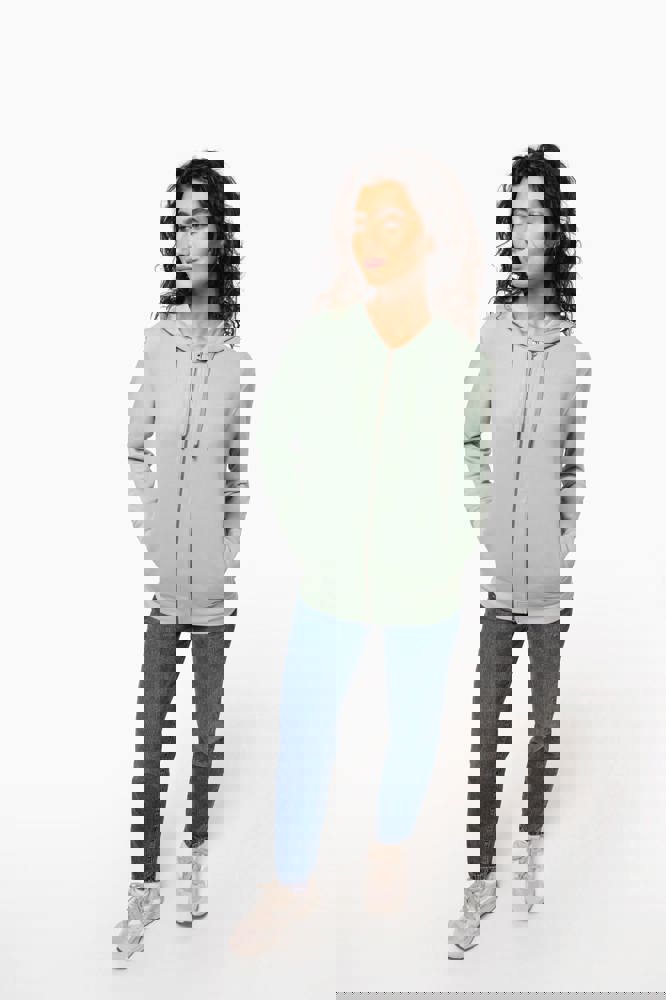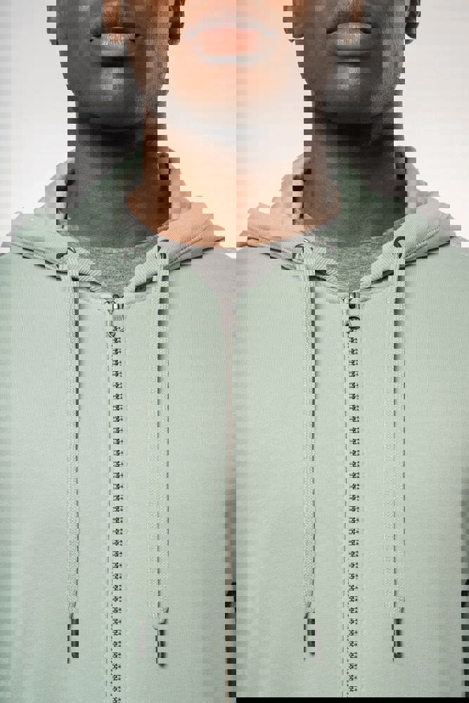 80% cotone biologico / 20% poliestere riciclato post-consumer. Oxford Grey 75% cotone biologico / 25% poliestere riciclato post-consumer. Felpa non garzata French Terry LST (Low Shrinkage Terry). Tessuto: lavaggio agli enzimi. Taglio dritto. 2 tasche a filetto sul davanti. Zip metallica. Fondo maniche, fondo capo e bordo del cappuccio a costine, cappuccio foderato e con coulisse tono su tono con puntale in metallo. Finitura a mezzaluna nella parte posteriore del collo che facilita la personalizzazione dall'interno. Nastrino di rinforzo a motivo spigato sull'interno del collo. Nessuna etichetta con il nome del marchio al collo ; solo una piccola etichetta con l'indicazione della taglia per semplificare la personalizzazione.
