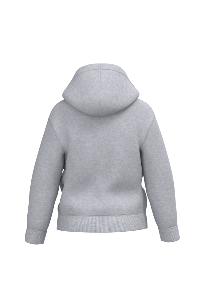 50% cotone ring-spun / 50% poliestere riciclato post-consumo. Felpa garzata. Taglio straight. Tagliato e cucito. Lavaggio agli enzimi. Costina 2x1 struttura tubolare per una migliore finitura su collo, fondo manica e fondo capo. Finitura a doppia impuntura su spalle, giromanica, fondo manica e fondo capo. Tasche a canguro. Chiusura con zip in nylon tono su tono. Cappuccio foderato in jersey. Nastrino di rinforzo in jersey tono su tono all'interno del collo. Nessuna etichetta con il nome del marchio sul collo, solo una piccola etichetta con l'indicazione della taglia per semplificare la personalizzazione.