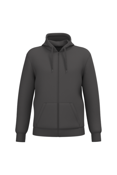 50% cotone ring spun / 50% poliestere riciclato post-consumer. Felpa garzata. Taglio straight. Modello tagliato e cucito. Costina 2x1 a struttura tubolare per una migliore finitura su collo, fondo manica e fondo capo. Tasca a canguro. Zip di chiusura in nylon. Cappuccio foderato in policotone jersey con coulisse piatta. Nastrino di rinforzo in jersey tono su tono all'interno del collo. Nessuna etichetta con il nome del marchio sul collo; solo una piccola etichetta con l'indicazione della taglia per semplificare la personalizzazione.