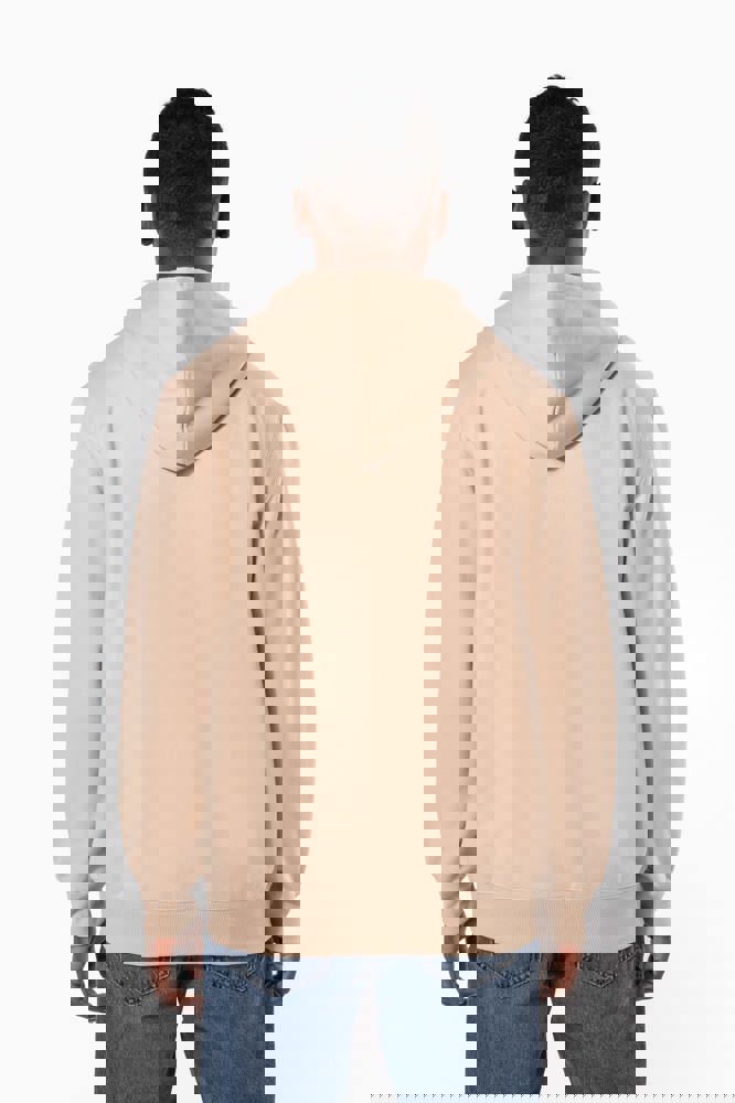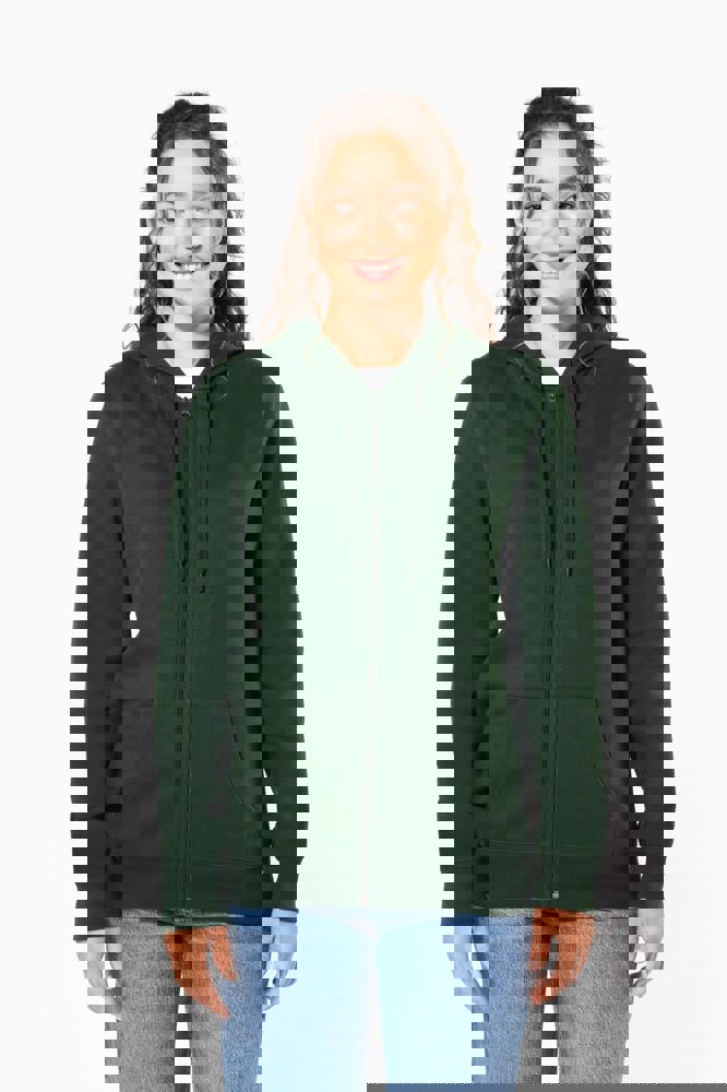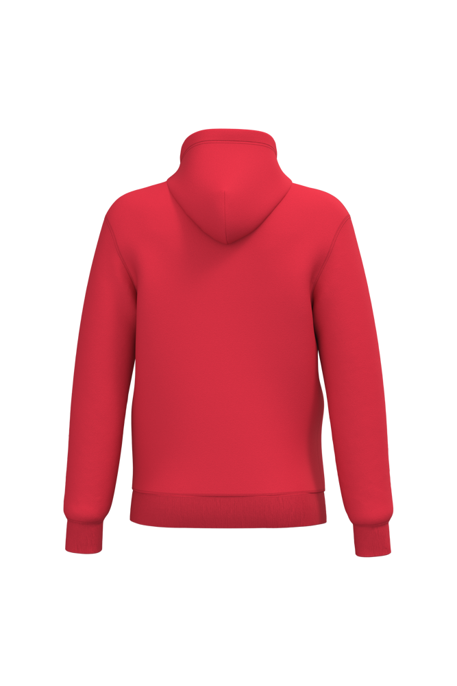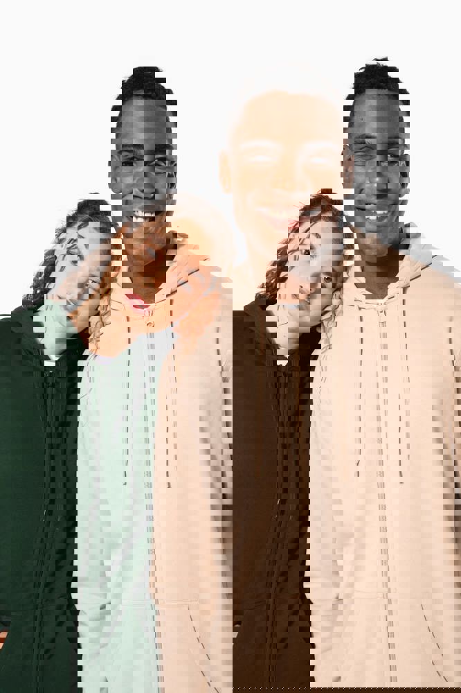 50% cotone ring spun / 50% poliestere riciclato post-consumer. Felpa garzata. Taglio straight. Modello tagliato e cucito. Costina 2x1 a struttura tubolare per una migliore finitura su collo, fondo manica e fondo capo. Tasca a canguro. Zip di chiusura in nylon. Cappuccio foderato in policotone jersey con coulisse piatta. Nastrino di rinforzo in jersey tono su tono all'interno del collo. Nessuna etichetta con il nome del marchio sul collo; solo una piccola etichetta con l'indicazione della taglia per semplificare la personalizzazione.