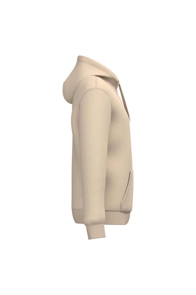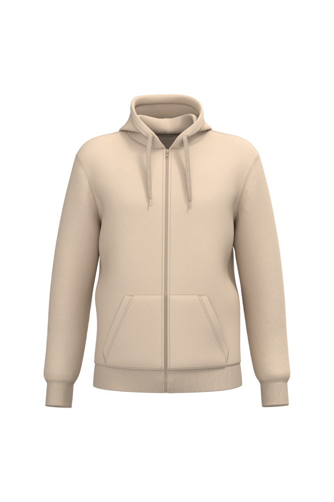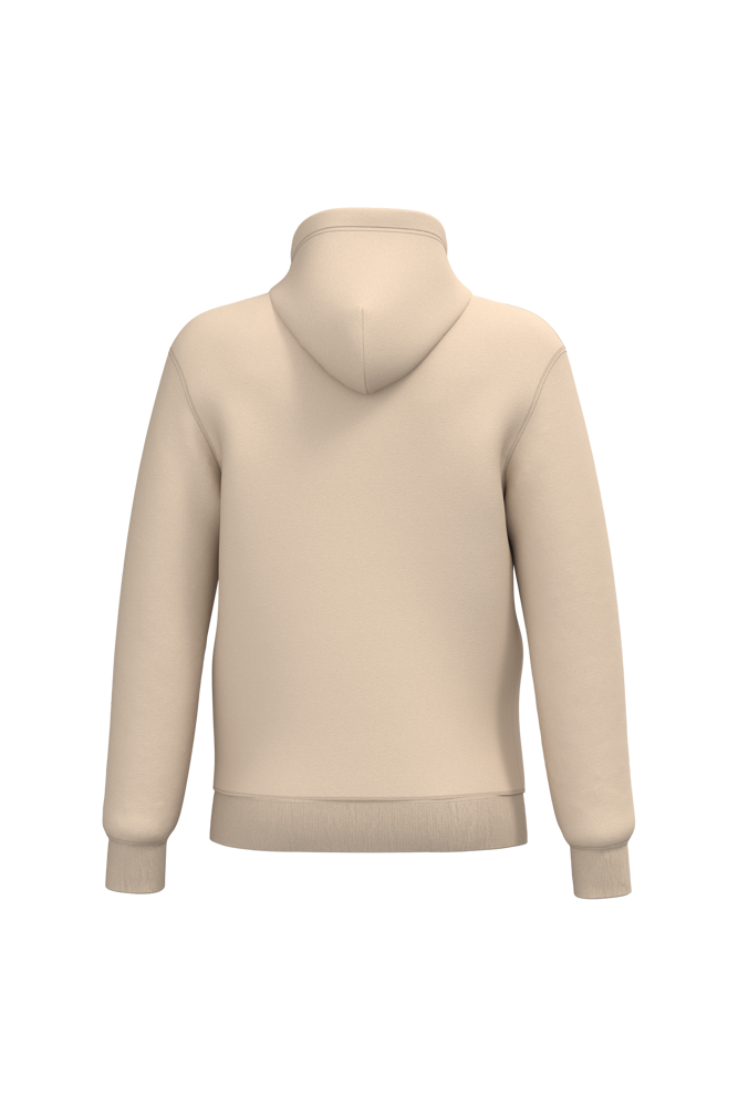 50% cotone ring spun / 50% poliestere riciclato post-consumer. Felpa garzata. Taglio straight. Modello tagliato e cucito. Costina 2x1 a struttura tubolare per una migliore finitura su collo, fondo manica e fondo capo. Tasca a canguro. Zip di chiusura in nylon. Cappuccio foderato in policotone jersey con coulisse piatta. Nastrino di rinforzo in jersey tono su tono all'interno del collo. Nessuna etichetta con il nome del marchio sul collo; solo una piccola etichetta con l'indicazione della taglia per semplificare la personalizzazione.