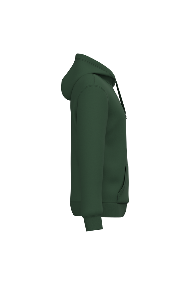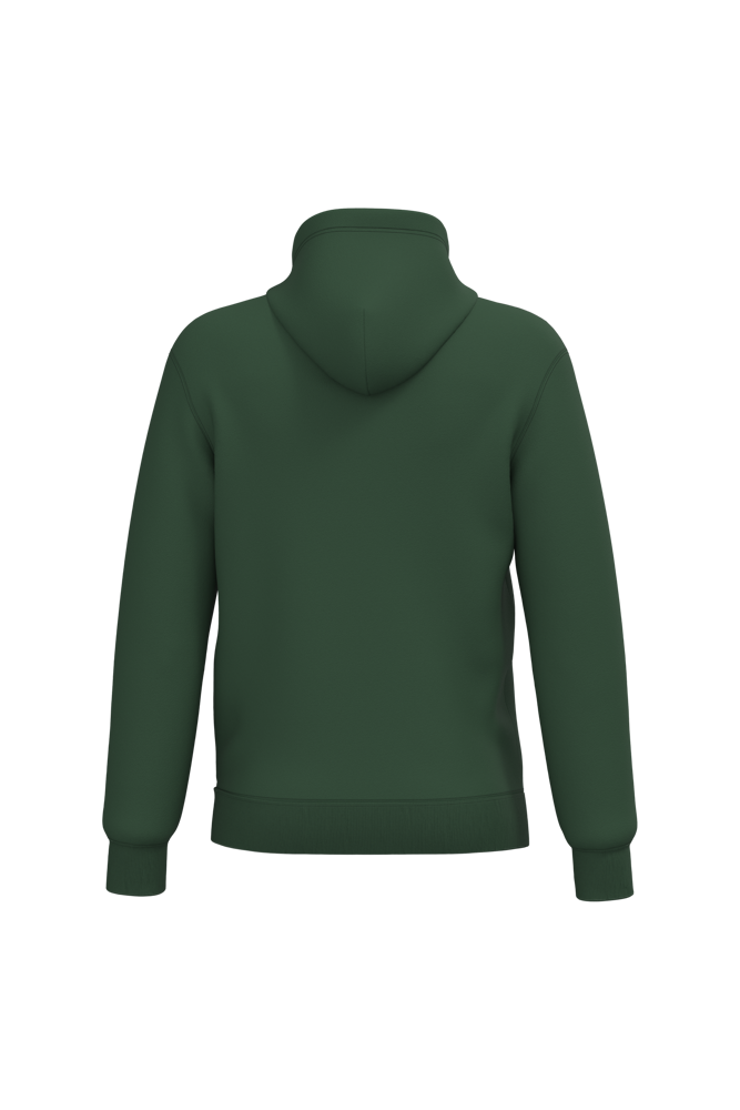 50% cotone ring spun / 50% poliestere riciclato post-consumer. Felpa garzata. Taglio straight. Modello tagliato e cucito. Costina 2x1 a struttura tubolare per una migliore finitura su collo, fondo manica e fondo capo. Tasca a canguro. Cappuccio foderato in policotone jersey con coulisse piatta. Nastrino di rinforzo in jersey tono su tono all'interno del collo. Nessuna etichetta con il nome del marchio sul collo; solo una piccola etichetta con l'indicazione della taglia per semplificare la personalizzazione.