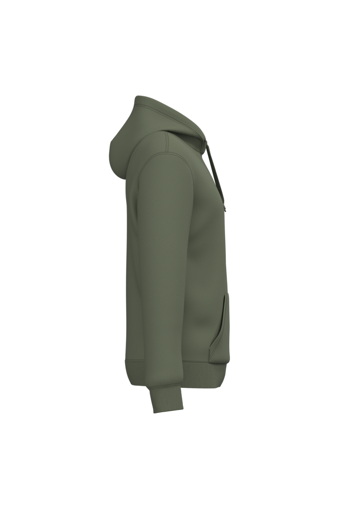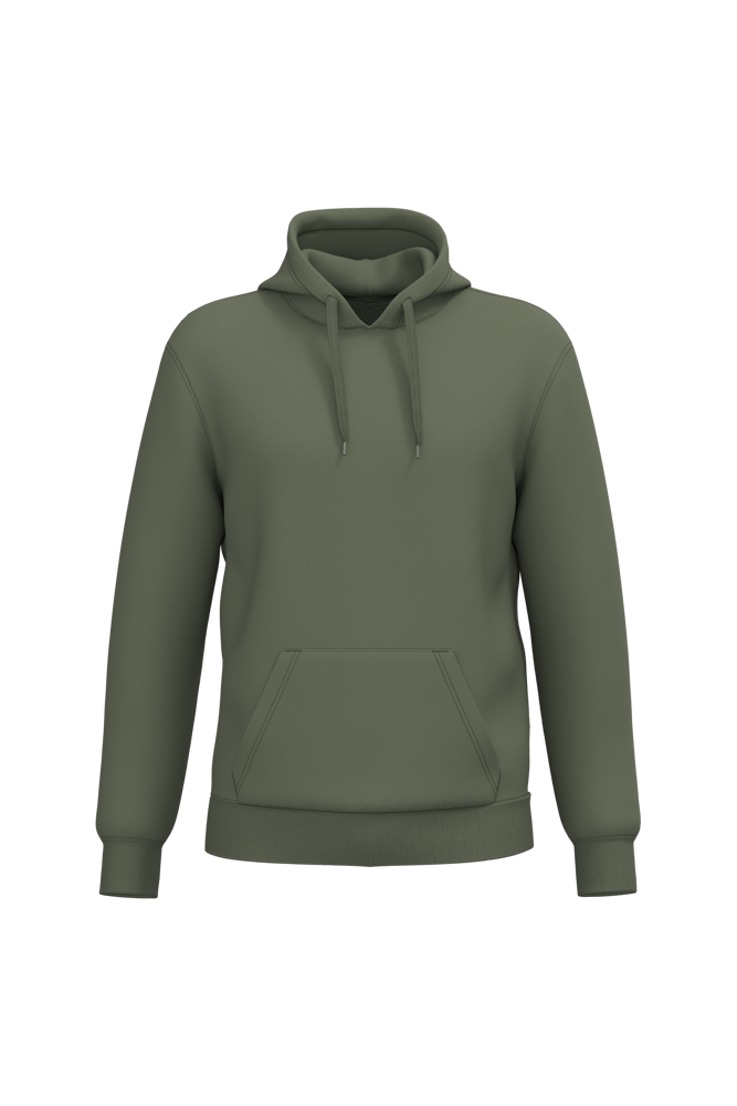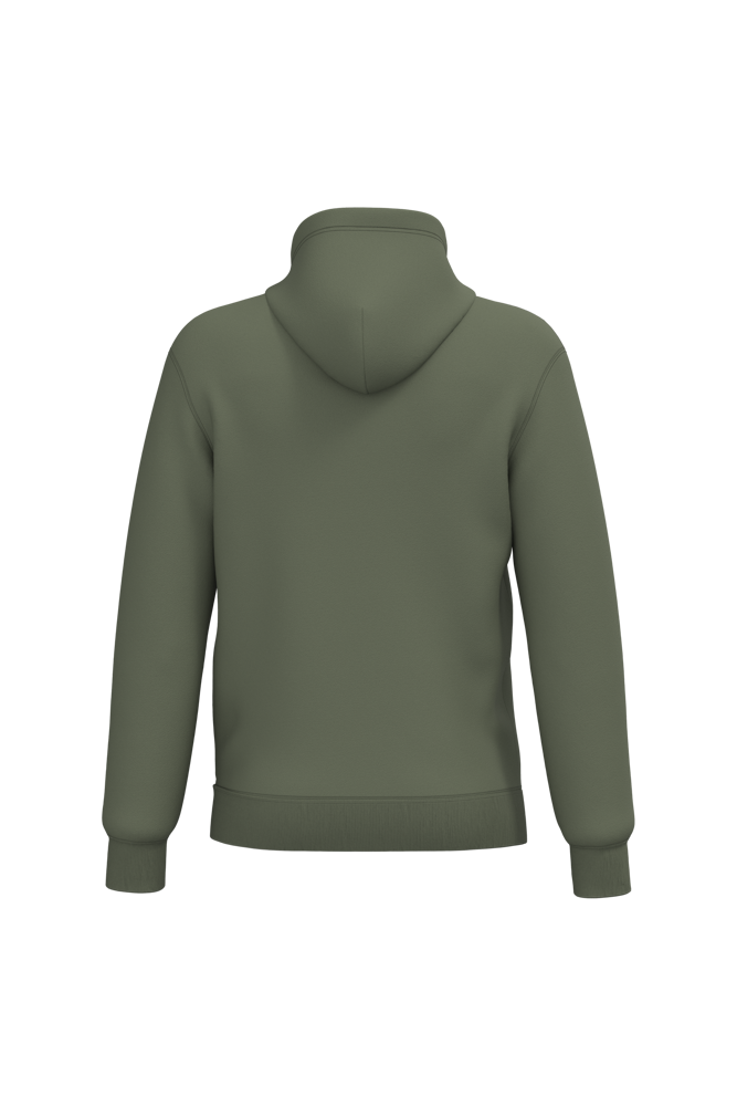 50% cotone ring spun / 50% poliestere riciclato post-consumer. Felpa garzata. Taglio straight. Modello tagliato e cucito. Costina 2x1 a struttura tubolare per una migliore finitura su collo, fondo manica e fondo capo. Tasca a canguro. Cappuccio foderato in policotone jersey con coulisse piatta. Nastrino di rinforzo in jersey tono su tono all'interno del collo. Nessuna etichetta con il nome del marchio sul collo; solo una piccola etichetta con l'indicazione della taglia per semplificare la personalizzazione.