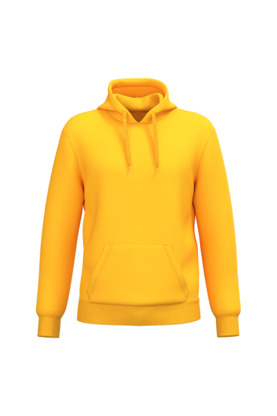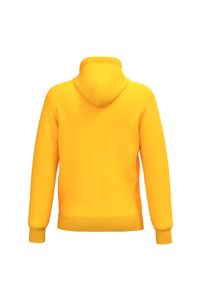 50% cotone ring spun / 50% poliestere riciclato post-consumer. Felpa garzata. Taglio straight. Modello tagliato e cucito. Costina 2x1 a struttura tubolare per una migliore finitura su collo, fondo manica e fondo capo. Tasca a canguro. Cappuccio foderato in policotone jersey con coulisse piatta. Nastrino di rinforzo in jersey tono su tono all'interno del collo. Nessuna etichetta con il nome del marchio sul collo; solo una piccola etichetta con l'indicazione della taglia per semplificare la personalizzazione.