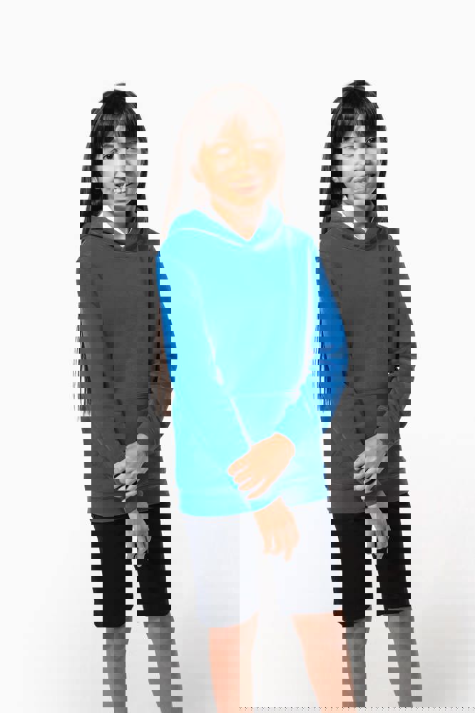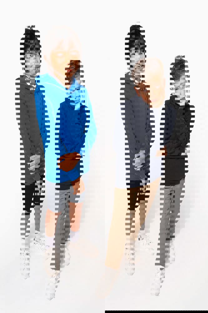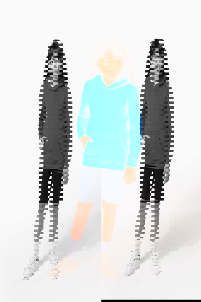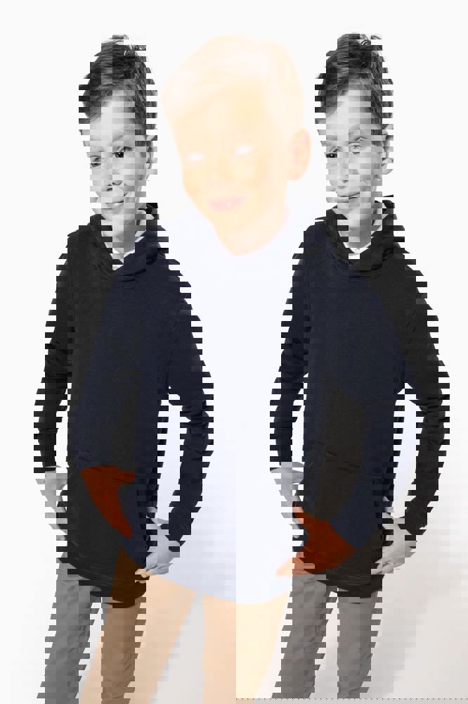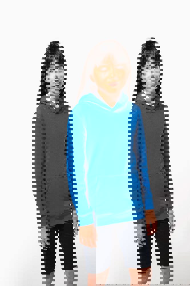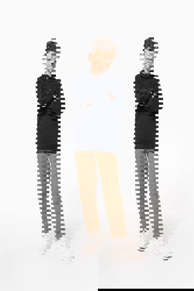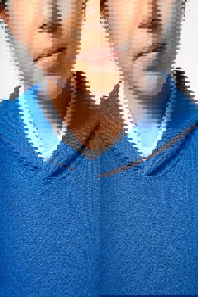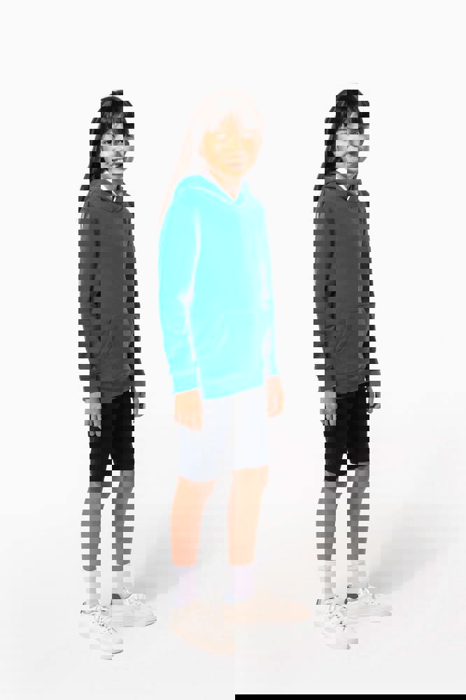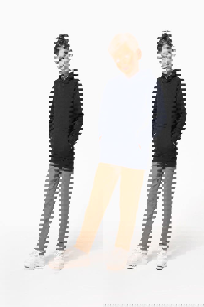 80% cotone/20% poliestere. Cotone pettinato. Felpa garzata LSF (Low Shrinkage Fleece) a 3 strati con trattamento anti-pilling. Prodotto in Portogallo. Taglio dritto. Fondo manica e orlo a costine 1x1. Cappuccio foderato in jersey di cotone. Doppia impuntura su spalle, giromanica, fondo manica e orlo. Nastrino di rinforzo in jersey abbinato all'interno del colletto. Tasca a marsupio. Lunetta sul retro. Etichetta con il nome sulla parte interna dell'indumento. Nessuna etichetta con marchio sul collo, solo una piccola etichetta con la taglia per una facile decorazione.