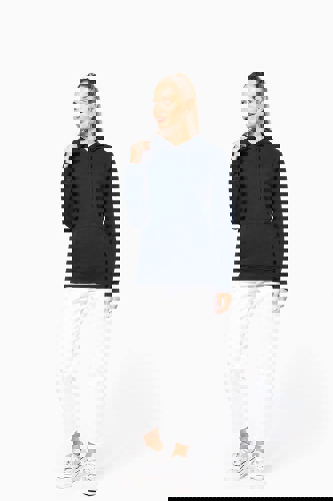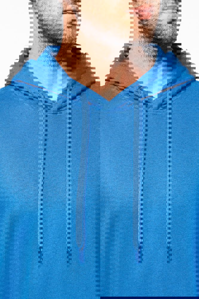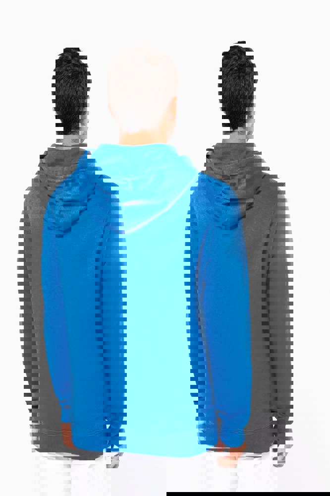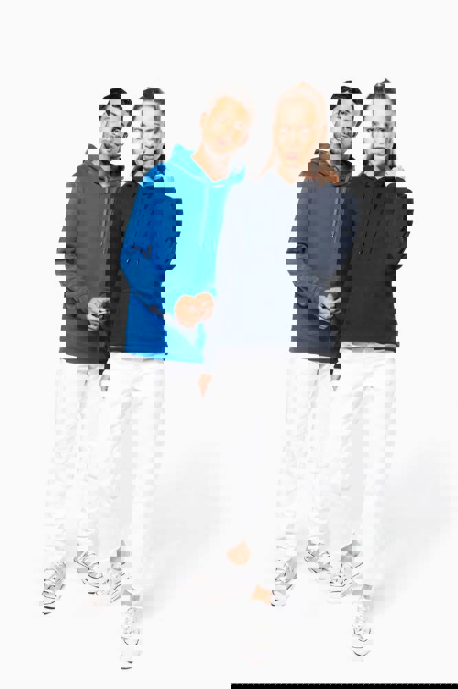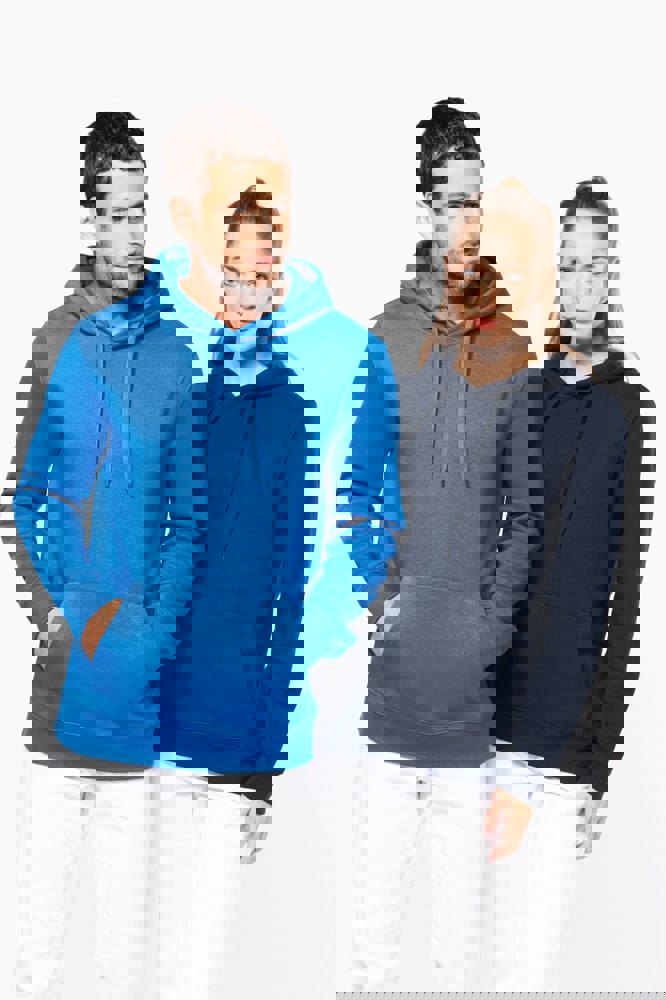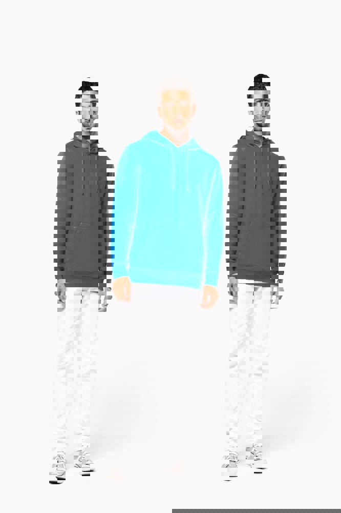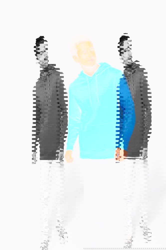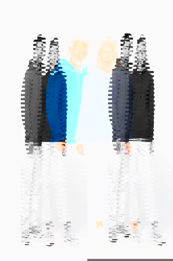 80% cotone / 20% poliestere. Tessuto in felpa garzata LSF 3 fili (Low Shrinkage Fleece) con trattamento antipilling. Capo fabbricato in Portogallo. Taglio straight. Struttura tagliata e cucita. Costina 1x1 a struttura tubolare per una migliore finitura a fondo manica e fondo capo. Tasca a canguro. Cappuccio foderato 100% in cotone jersey con coulisse piatta e occhielli ad asola. Finitura a mezzaluna all'interno del collo. Finitura a doppia impuntura a fondo manica e fondo capo. Nessuna etichetta con il nome del marchio sul collo; solo una piccola etichetta con l'indicazione della taglia per semplificare la personalizzazione.