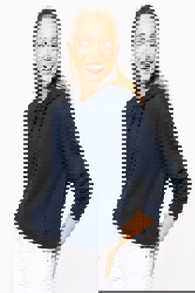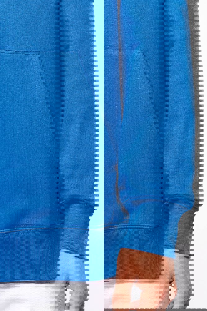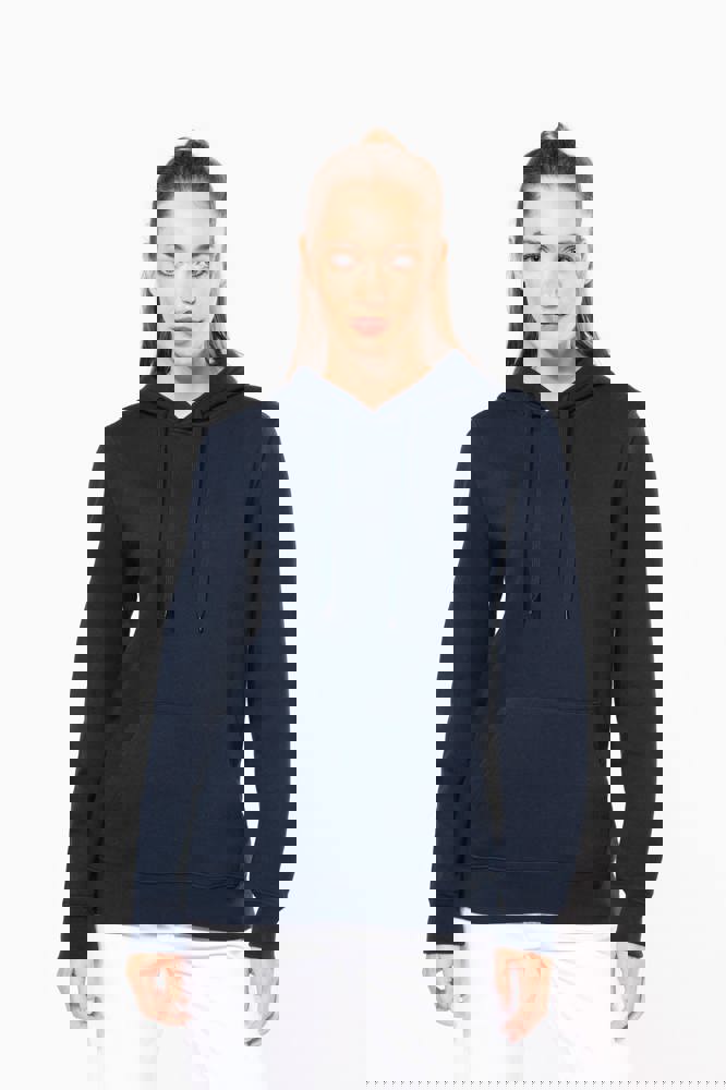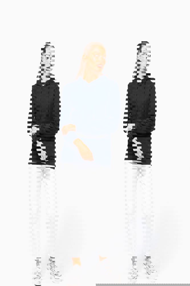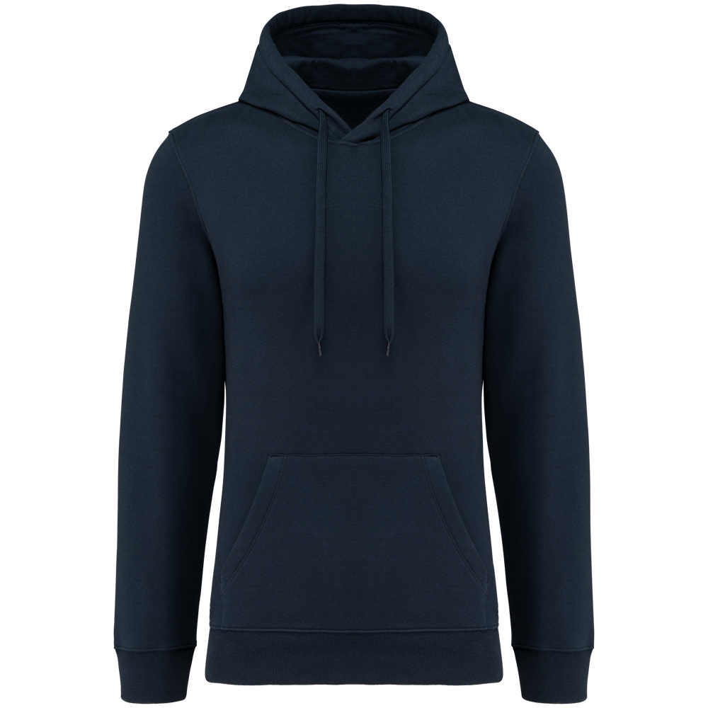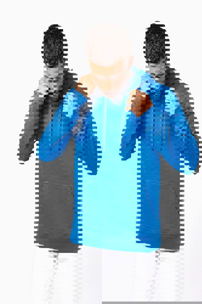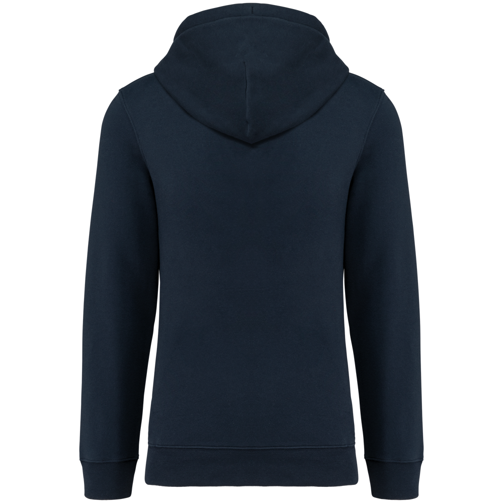 80% cotone / 20% poliestere. Tessuto in felpa garzata LSF 3 fili (Low Shrinkage Fleece) con trattamento antipilling. Capo fabbricato in Portogallo. Taglio straight. Struttura tagliata e cucita. Costina 1x1 a struttura tubolare per una migliore finitura a fondo manica e fondo capo. Tasca a canguro. Cappuccio foderato 100% in cotone jersey con coulisse piatta e occhielli ad asola. Finitura a mezzaluna all'interno del collo. Finitura a doppia impuntura a fondo manica e fondo capo. Nessuna etichetta con il nome del marchio sul collo; solo una piccola etichetta con l'indicazione della taglia per semplificare la personalizzazione.