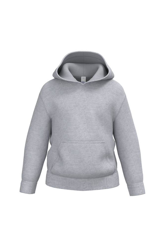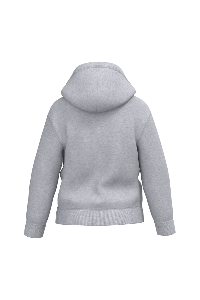 50% cotone / 50% poliestere. Felpa garzata taglio-cucito. Taglio dritto. Fondo maniche e fondo capo in maglia a costine 1x1 con doppie impunture. Tasca a marsupio. Cappuccio foderato in jersey. Etichetta del marchio staccabile.