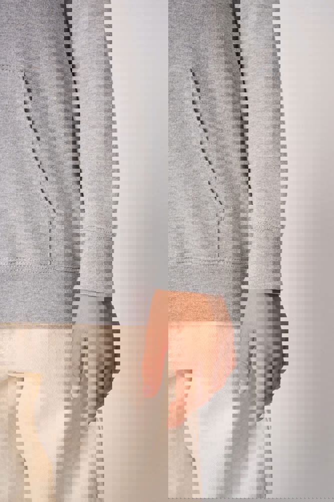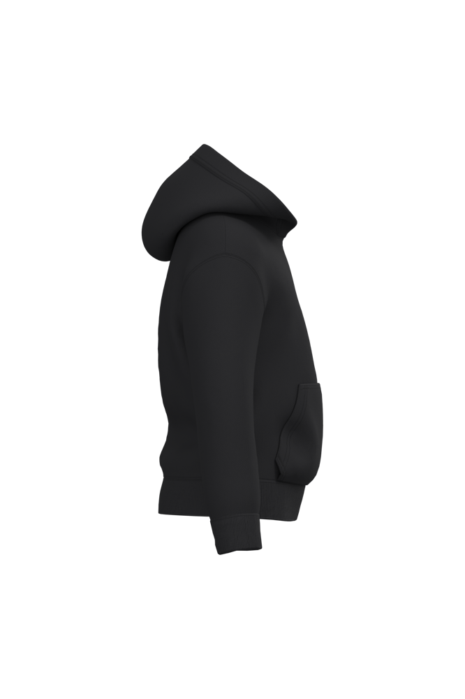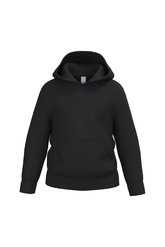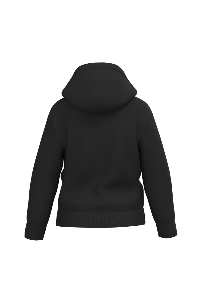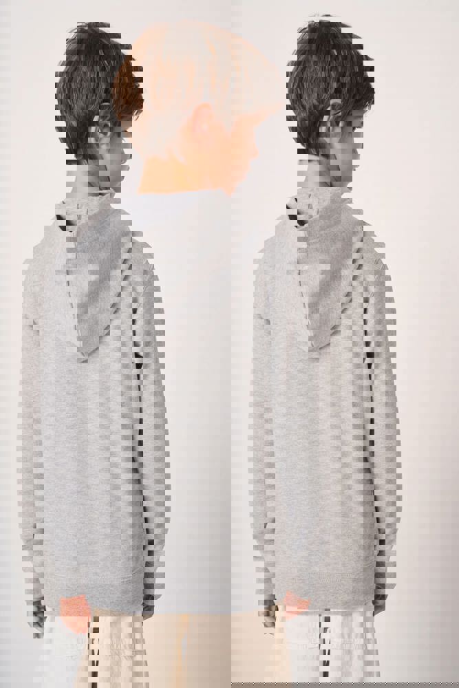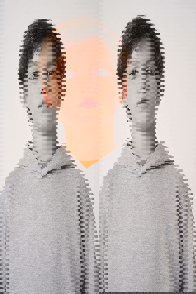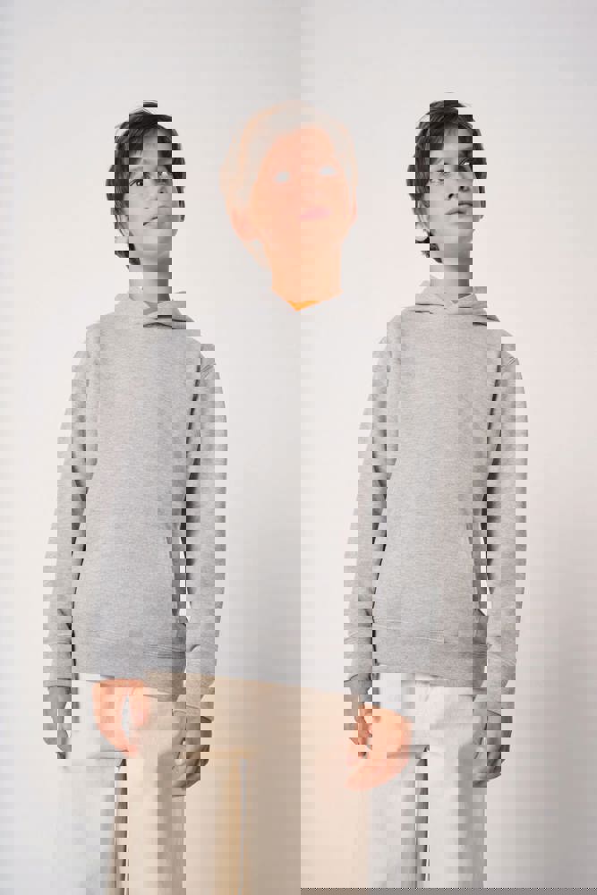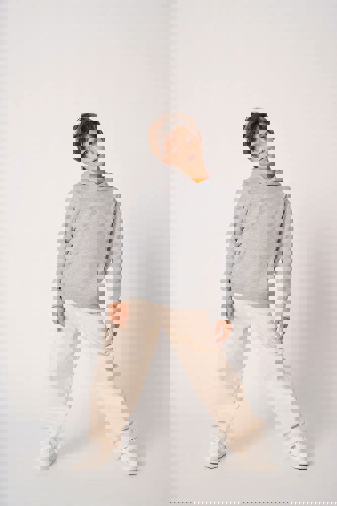 50% cotone / 50% poliestere. Felpa garzata taglio-cucito. Taglio dritto. Fondo maniche e fondo capo in maglia a costine 1x1 con doppie impunture. Tasca a marsupio. Cappuccio foderato in jersey. Etichetta del marchio staccabile.