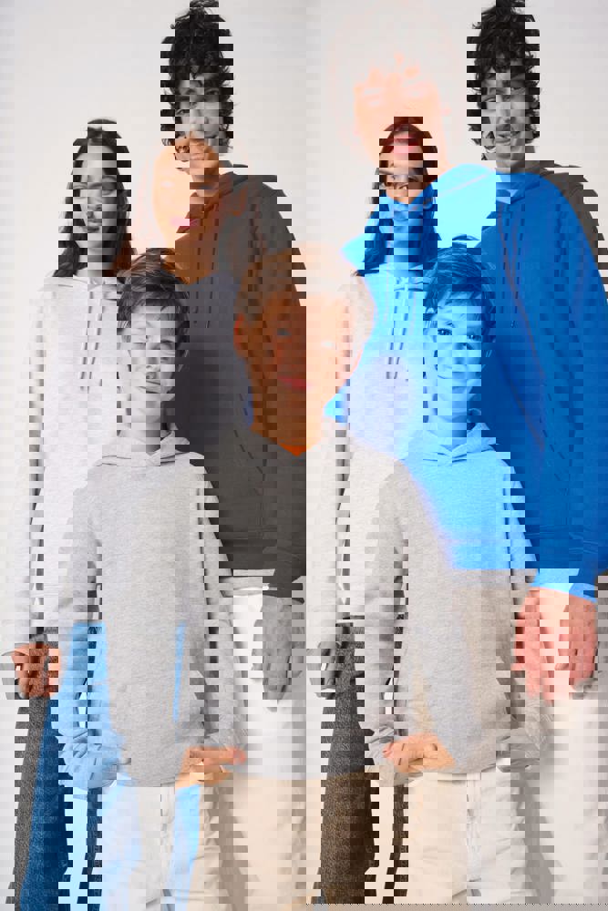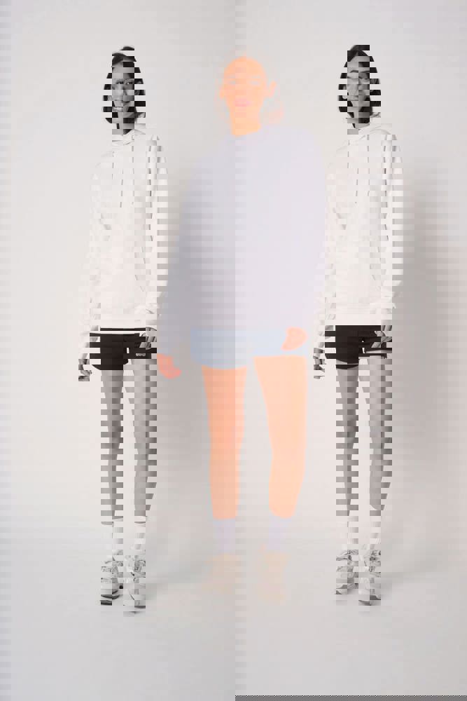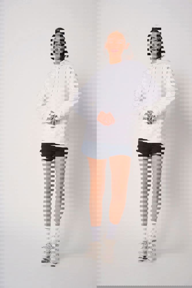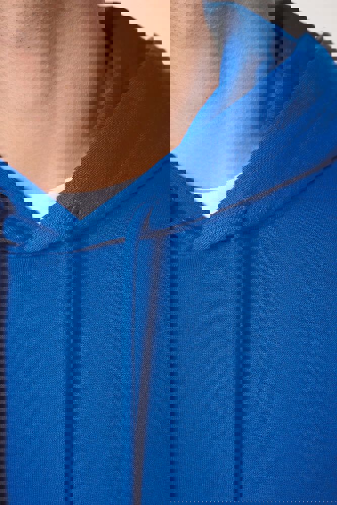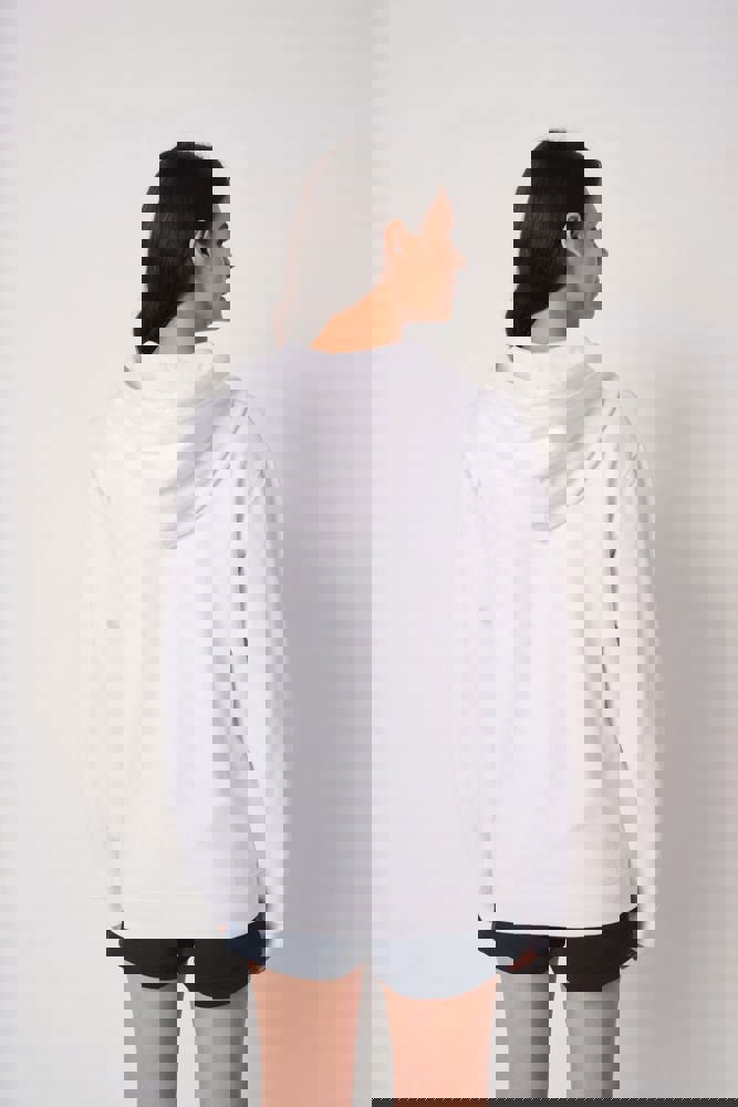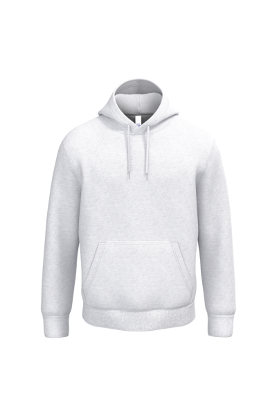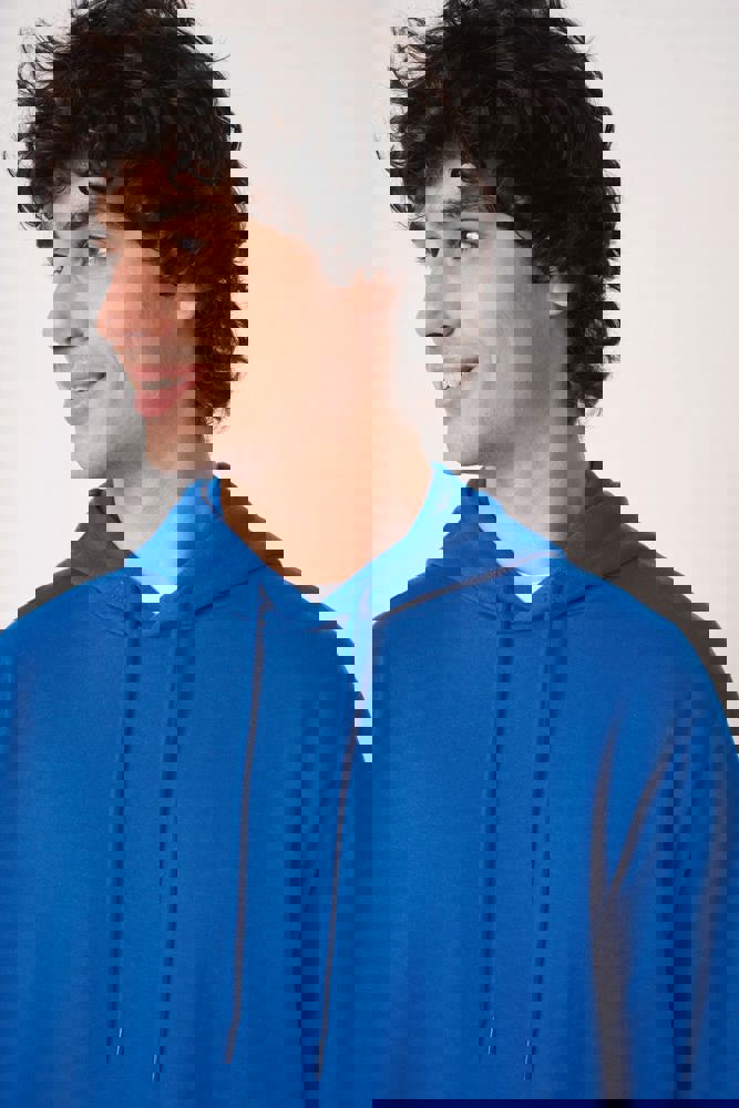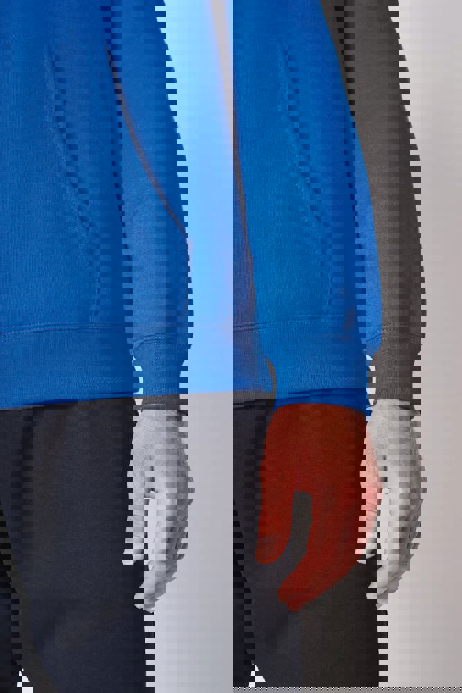 50% cotone / 50% poliestere. Felpa garzata tubolare. Taglio dritto. Fondo maniche e fondo capo in maglia a costine 1x1 con doppie impunture. Tasca a marsupio. Cappuccio foderato in jersey con cordino rotondo tono su tono. Etichetta del marchio staccabile.