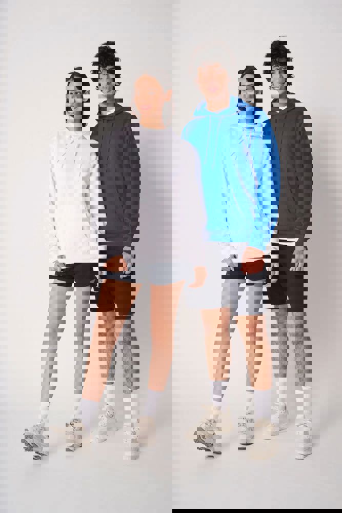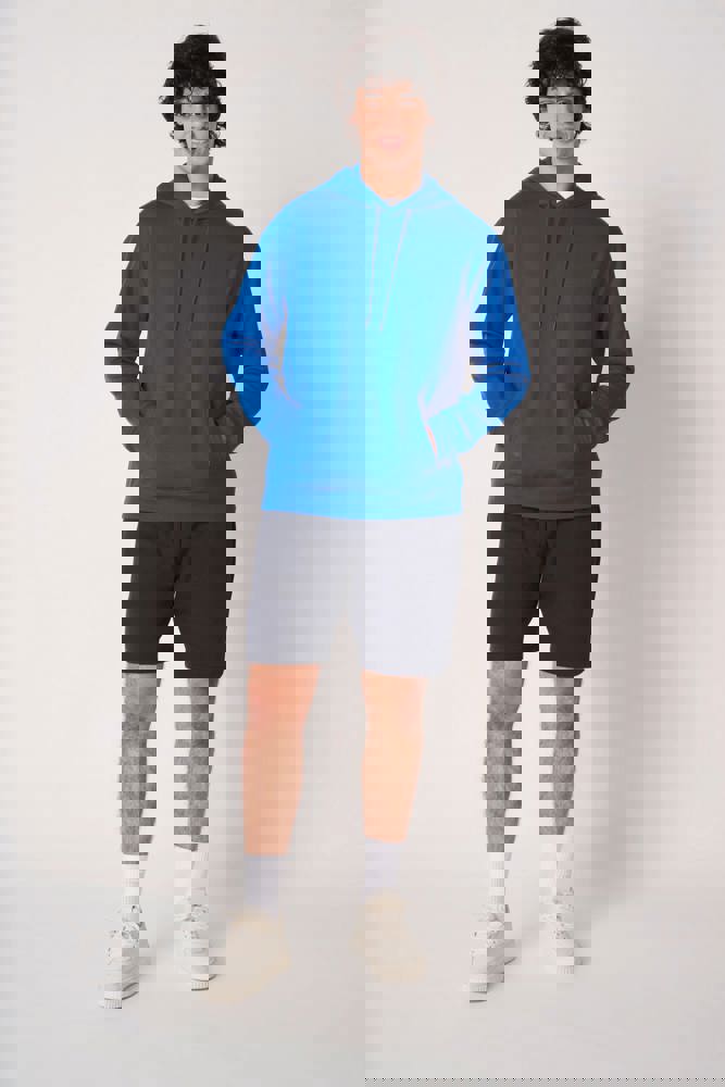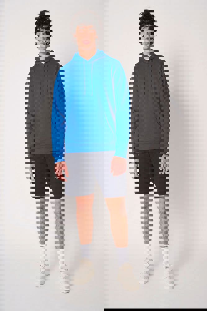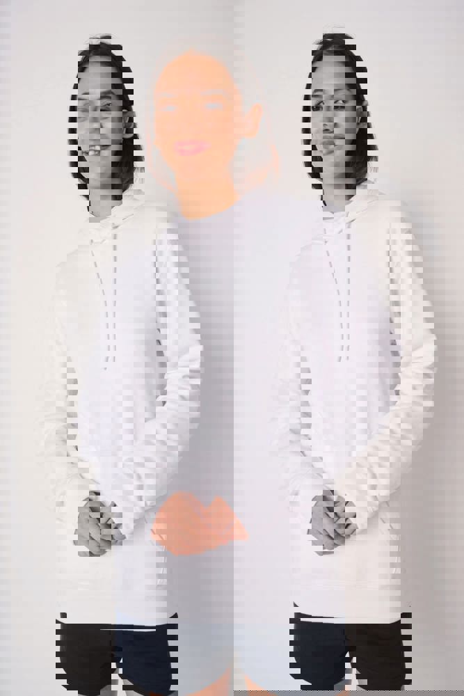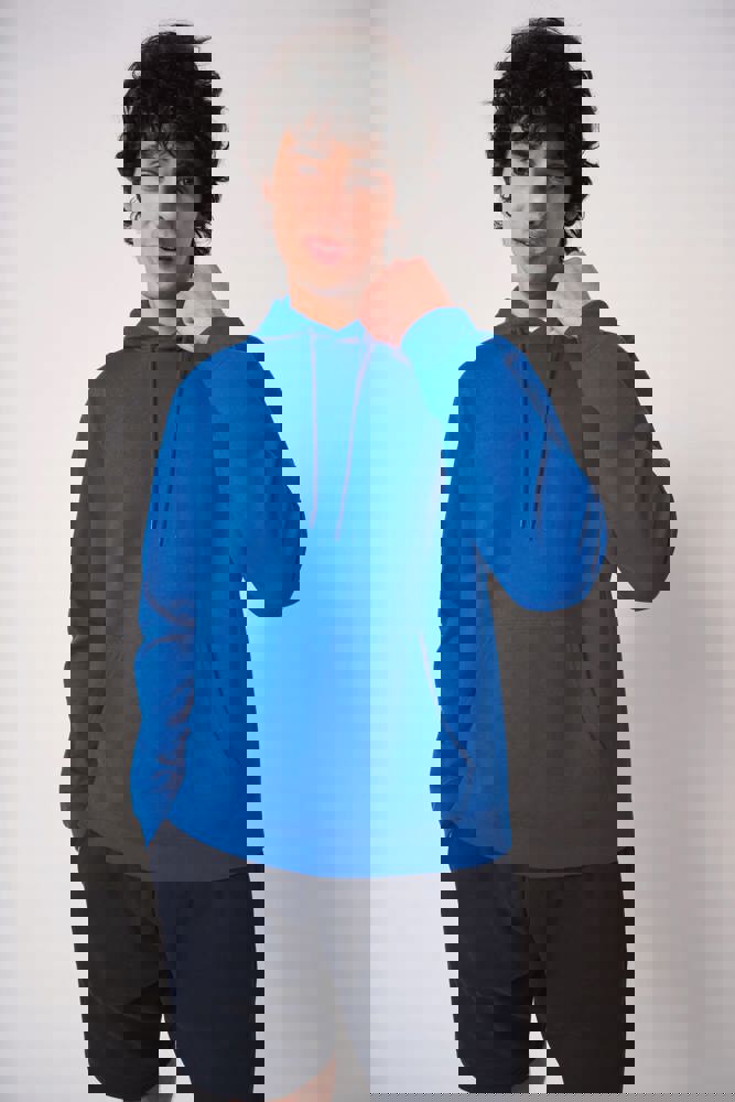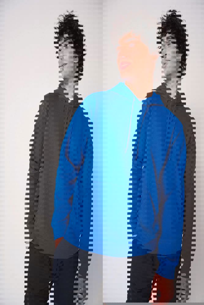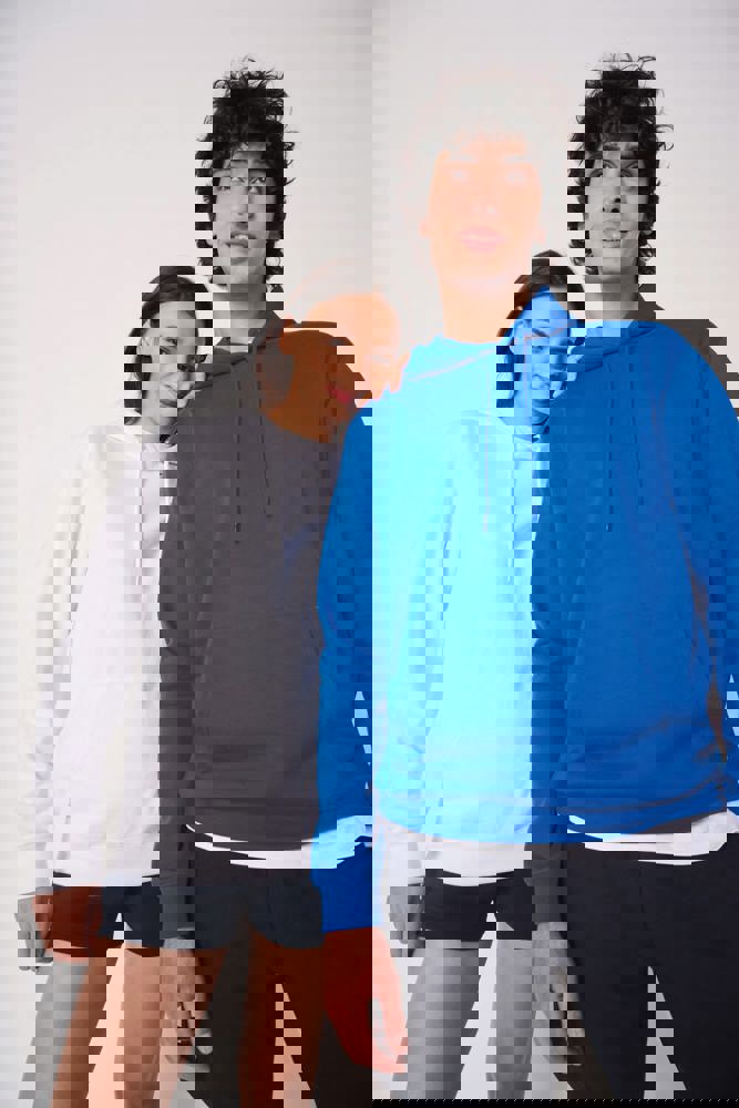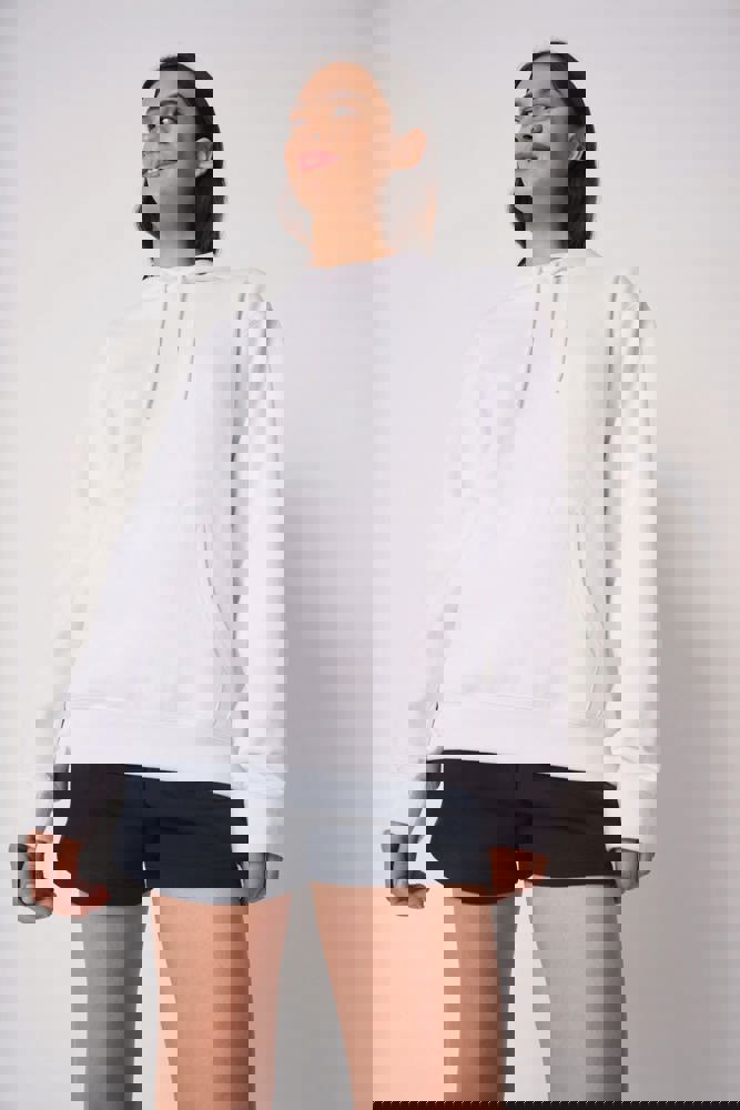 50% cotone / 50% poliestere. Felpa garzata tubolare. Taglio dritto. Fondo maniche e fondo capo in maglia a costine 1x1 con doppie impunture. Tasca a marsupio. Cappuccio foderato in jersey con cordino rotondo tono su tono. Etichetta del marchio staccabile.