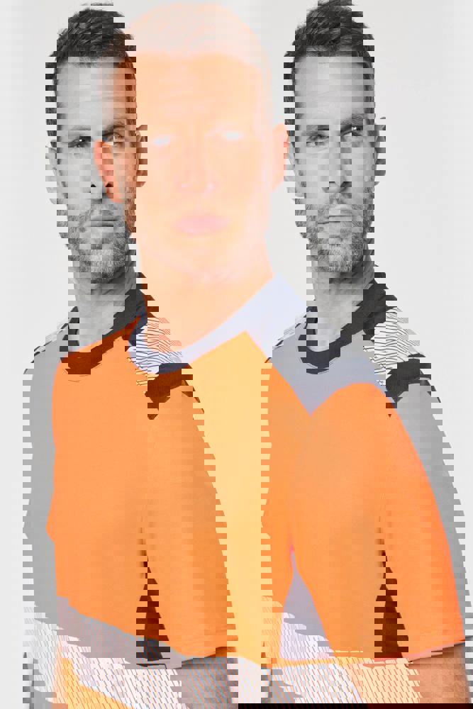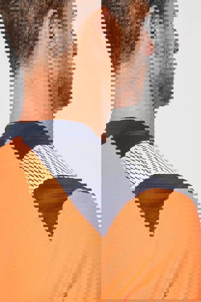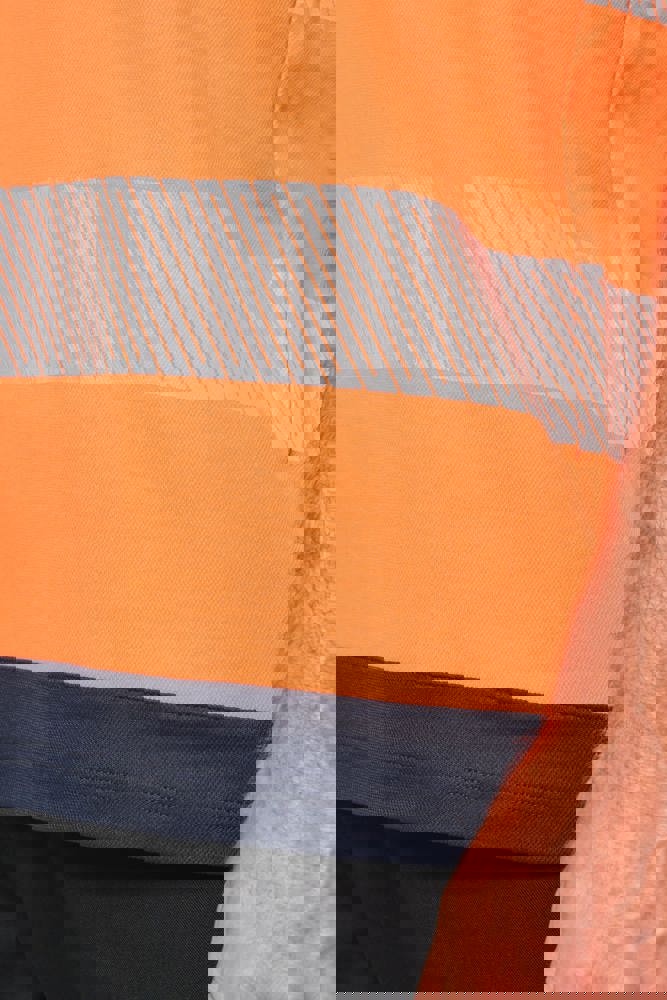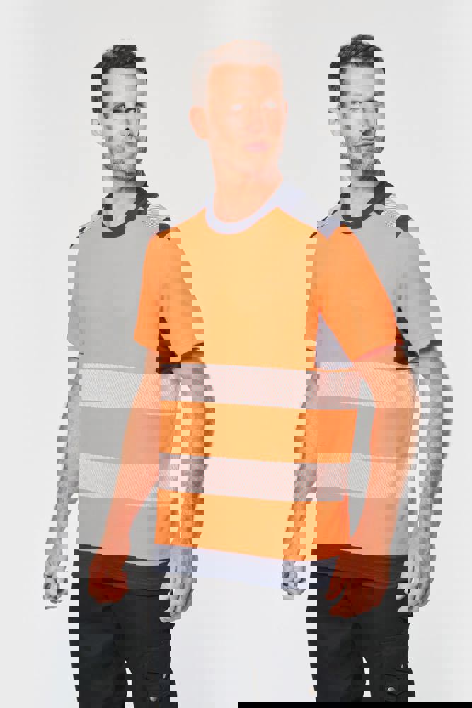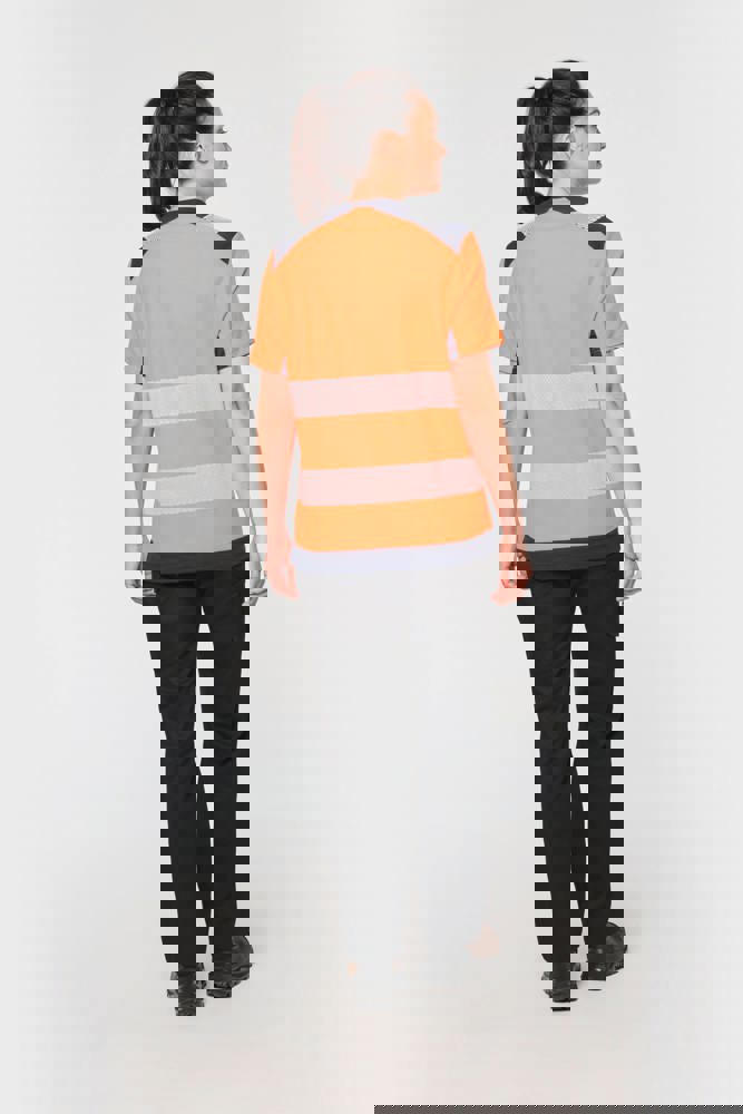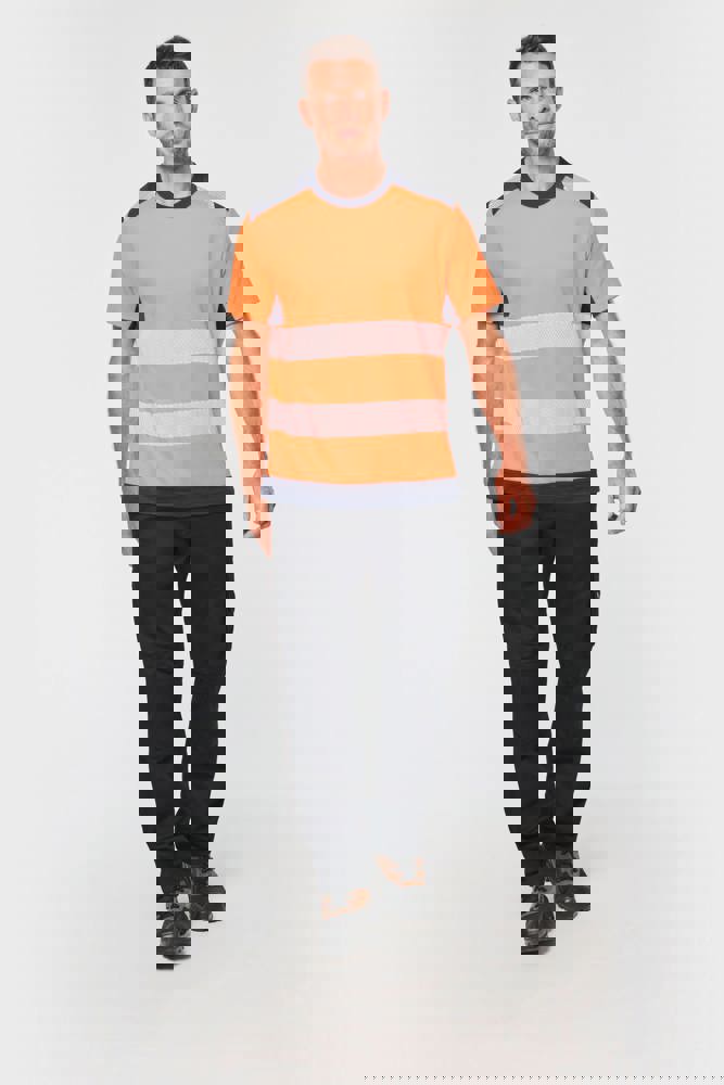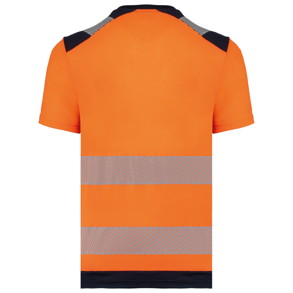 50% cotone / 50% poliestere riciclato. Cotone pettinato. Maglia piqué. Trattamento antipilling. Lavaggio a 60 °C (25 cicli). Taglio regolare. Inserti a contrasto sulle spalle con striscia segmentata riflettente di 7 cm. Collo a costine 1x1 foderato in 100% poliestere riciclato. Inserto a contrasto e micro-aerato nel sottomanica, in maglia Birdseye con il 100% di poliestere riciclato. 2 strisce segmentate riflettenti di 7 cm sul davanti e dietro. Fondo capo a contrasto. Finitura a doppia impuntura a fondo manica e fondo capo. DPI Classe II. Norme UNI EN 13758-1+A1:2007 + UNI EN 13758-2+A1:2007: Protezione UPF40+ (Proprietà di protezione contro i raggi solari UV), UNI EN ISO 13688:2013 + UNI EN ISO 13688/A1:2021 (Indumenti protettivi - Requisiti generali), UNI EN ISO 20471:2013 + UNI EN ISO 20471/A1:2017: Classe 1 per la taglia XS - Classe 2 dalla taglia S alla 6XL (Indumenti ad alta visibilità - Metodi di prova e requisiti), RIS-3279-TOM Edizione 2:2019 solo per il colore Hi Viz Orange/Navy Classe 2 (Standard del settore ferroviario). Etichetta con il nome della marca rimovibile.