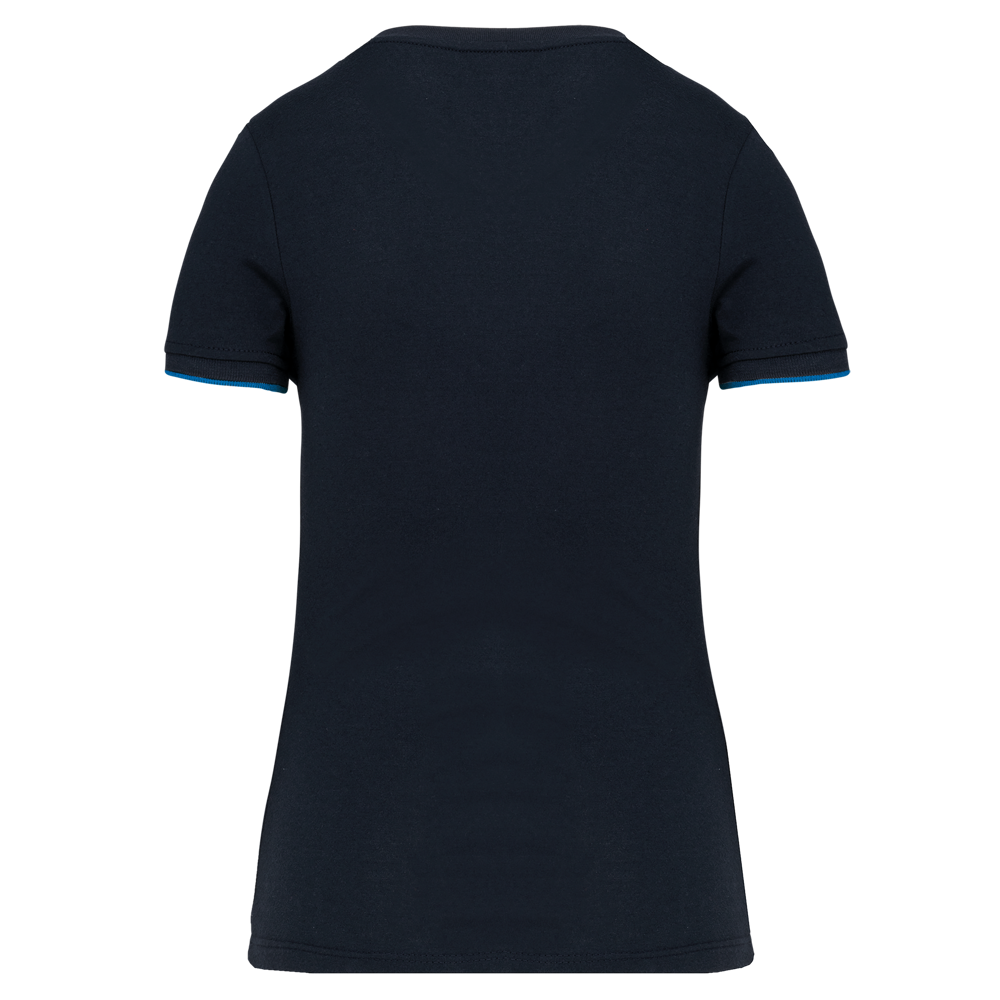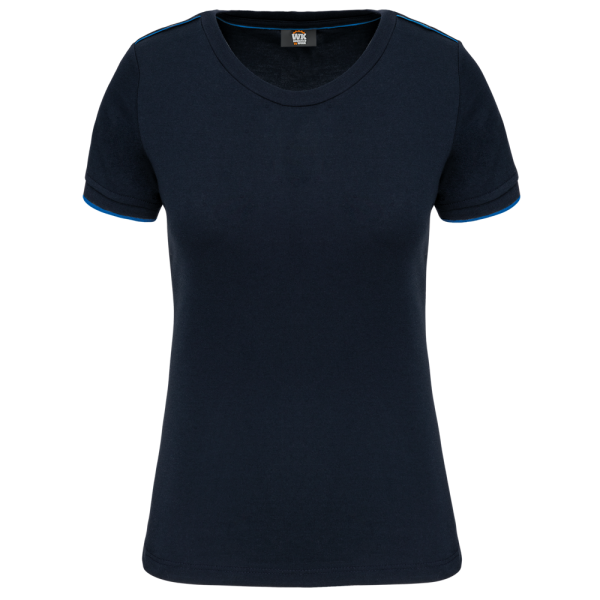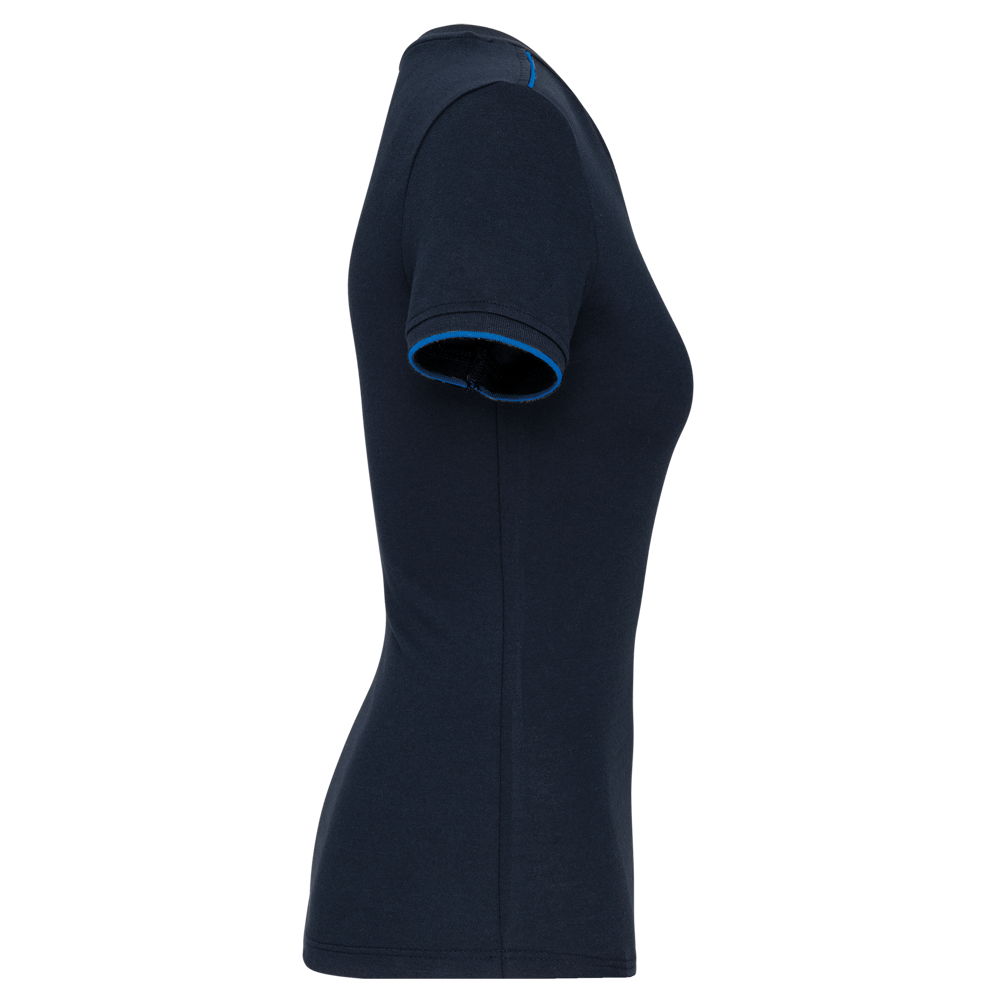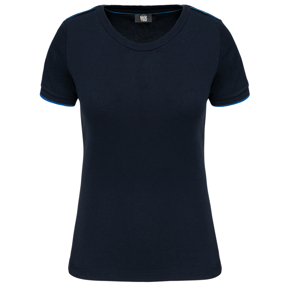65% poliestere / 35% cotone. Cotone pettinato tessuto jersey. Lavabile a 60 °C. Trattamento antipilling. Girocollo con elastan. Dettaglio a contrasto su interno collo e spalle. Fondo manica a costine con bordino rigato a contrasto. Finitura a doppia impuntura a fondo capo. Ideale per un uso quotidiano.