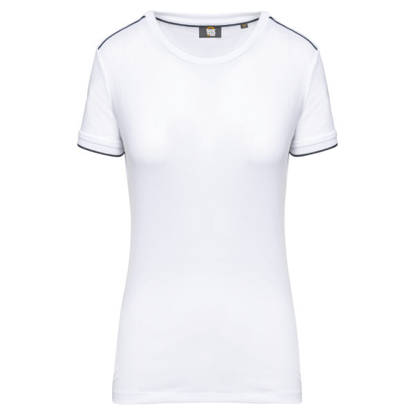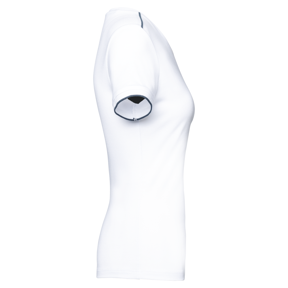65% poliestere / 35% cotone. Cotone pettinato tessuto jersey. Lavabile a 60 °C. Trattamento antipilling. Girocollo con elastan. Dettaglio a contrasto su interno collo e spalle. Fondo manica a costine con bordino rigato a contrasto. Finitura a doppia impuntura a fondo capo. Ideale per un uso quotidiano.
