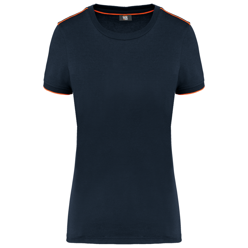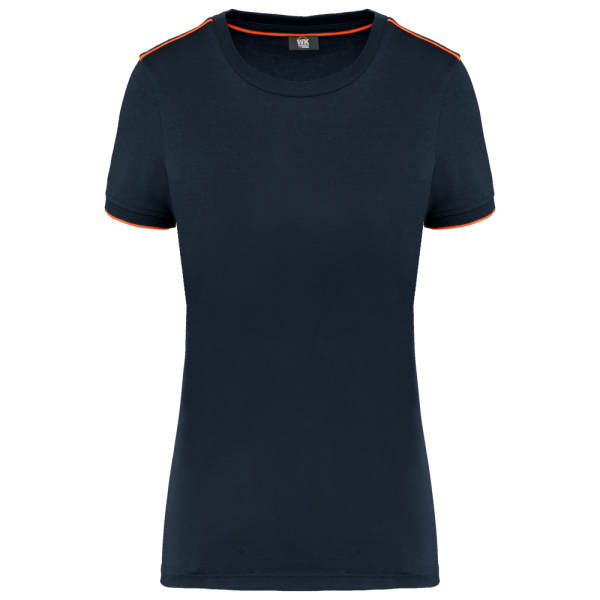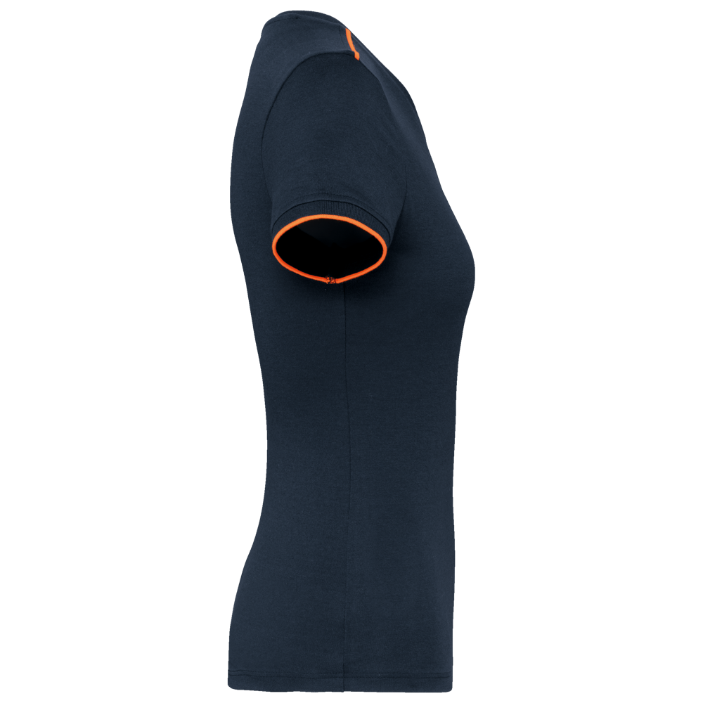 65% poliestere / 35% cotone. Cotone pettinato tessuto jersey. Lavabile a 60 °C. Trattamento antipilling. Girocollo con elastan. Dettaglio a contrasto su interno collo e spalle. Fondo manica a costine con bordino rigato a contrasto. Finitura a doppia impuntura a fondo capo. Ideale per un uso quotidiano.