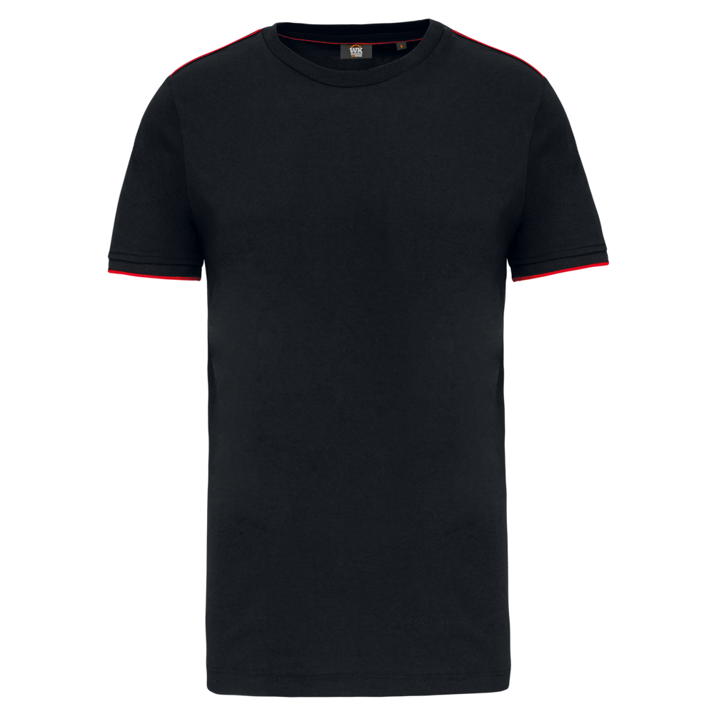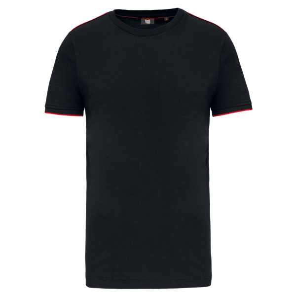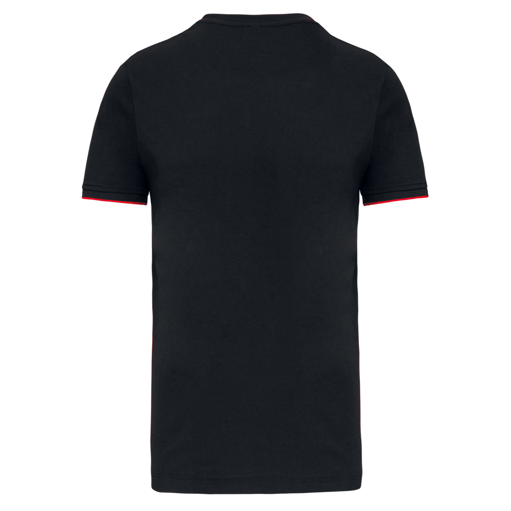 65% poliestere / 35% cotone. Cotone pettinato tessuto jersey. Lavabile a 60 °C. Trattamento antipilling. Girocollo con elastan. Dettaglio a contrasto su interno collo e spalle. Fondo manica a costine con bordino rigato a contrasto. Finitura a doppia impuntura a fondo capo. Ideale per un uso quotidiano.