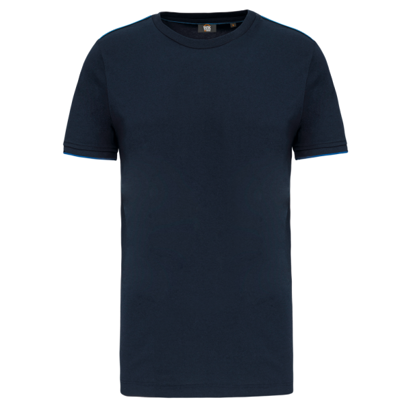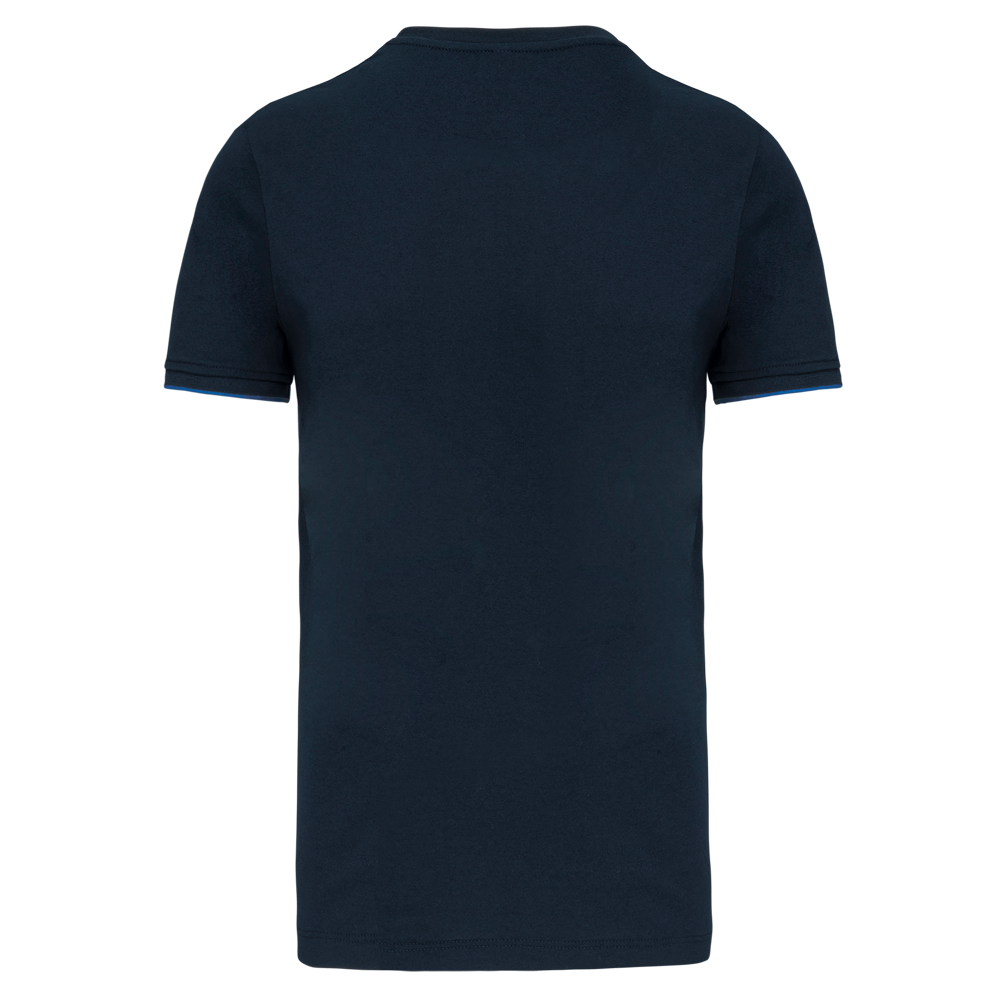 65% poliestere / 35% cotone. Cotone pettinato tessuto jersey. Lavabile a 60 °C. Trattamento antipilling. Girocollo con elastan. Dettaglio a contrasto su interno collo e spalle. Fondo manica a costine con bordino rigato a contrasto. Finitura a doppia impuntura a fondo capo. Ideale per un uso quotidiano.