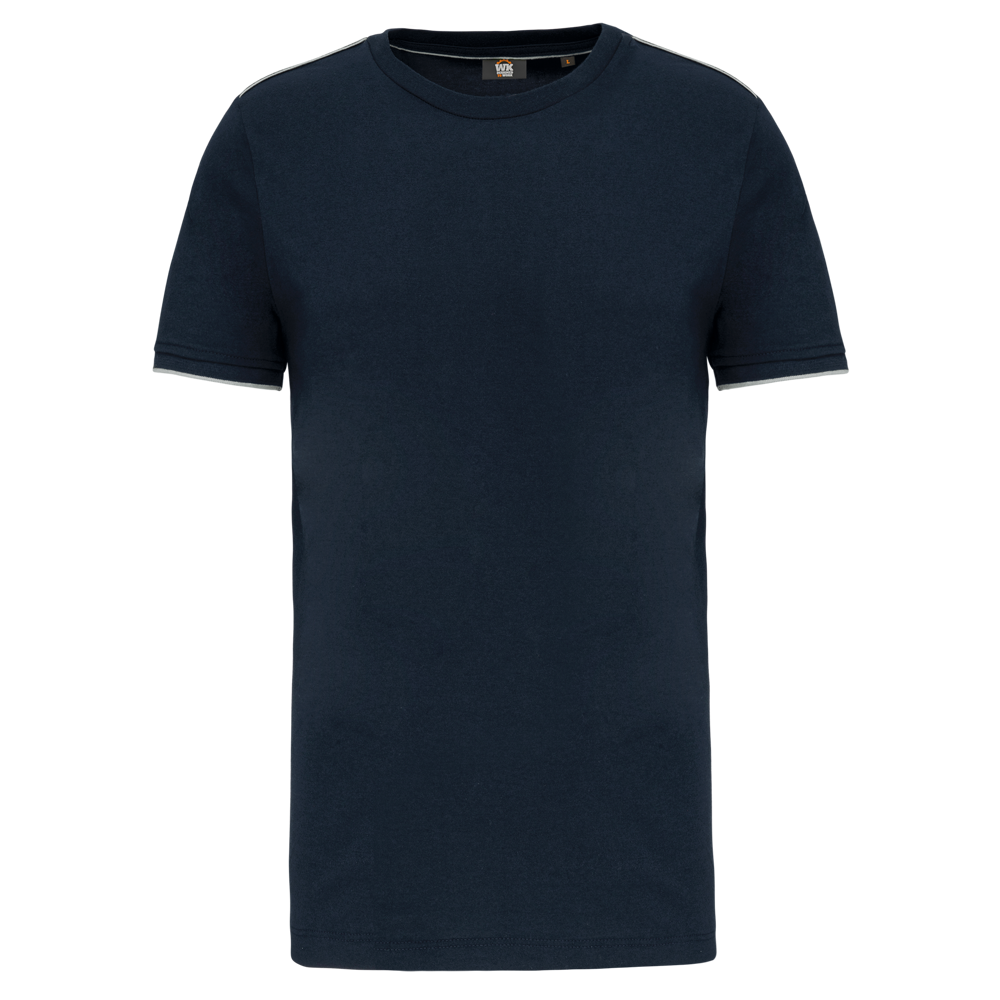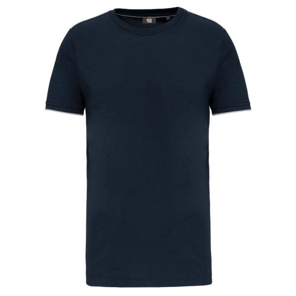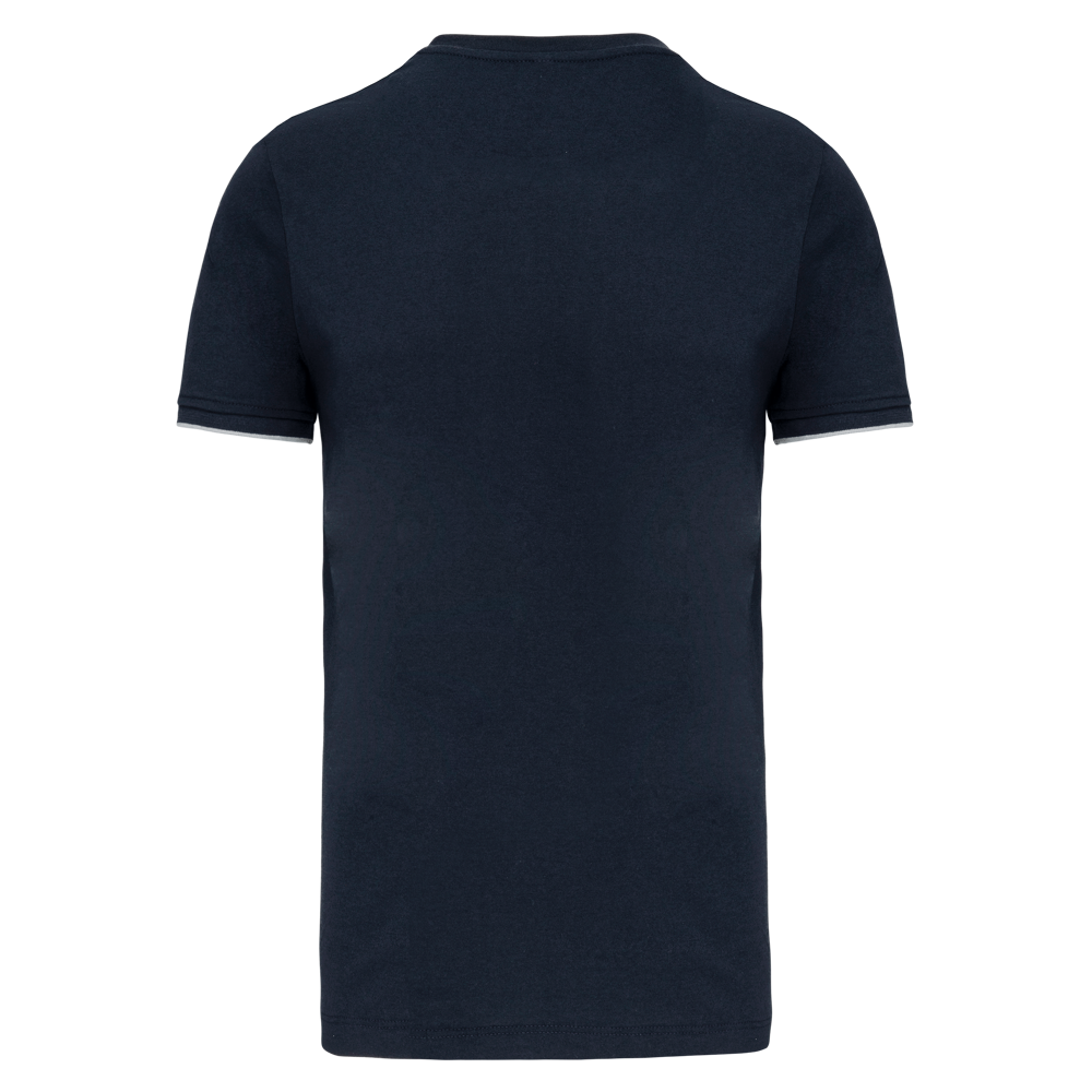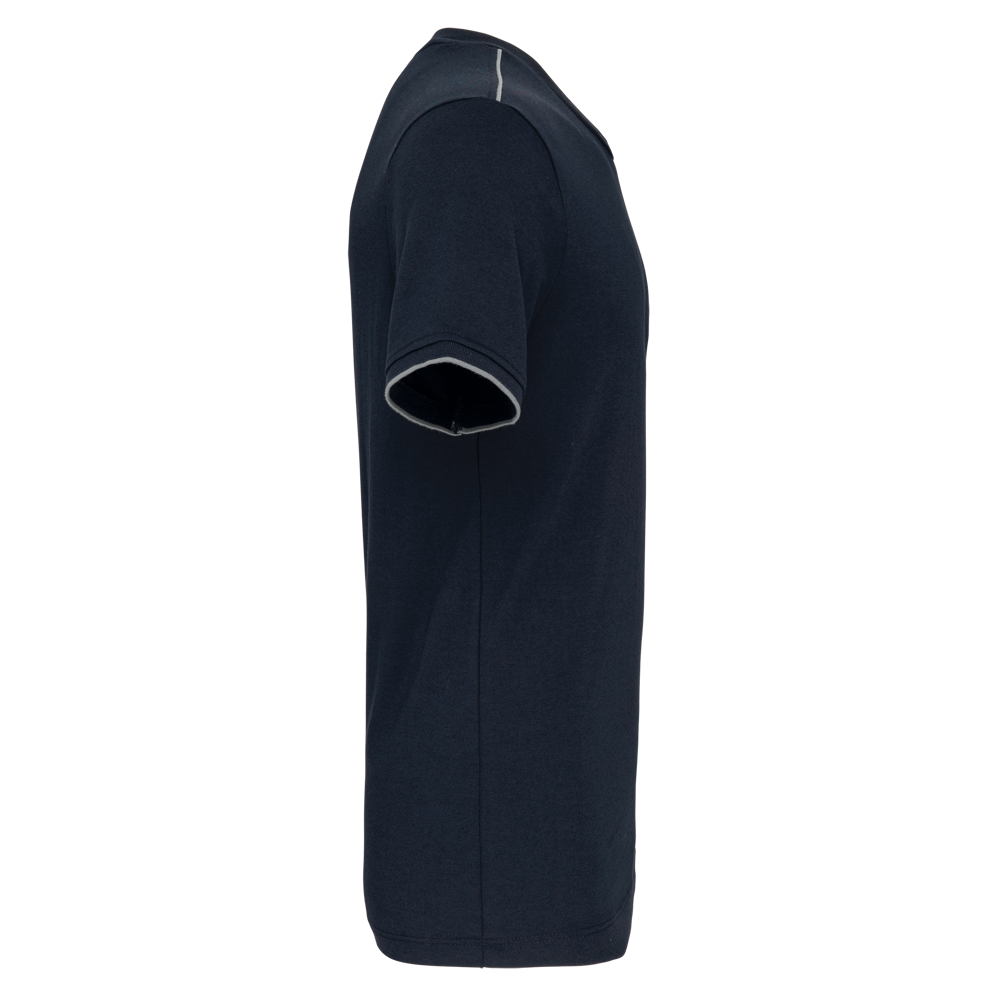 65% poliestere / 35% cotone. Cotone pettinato tessuto jersey. Lavabile a 60 °C. Trattamento antipilling. Girocollo con elastan. Dettaglio a contrasto su interno collo e spalle. Fondo manica a costine con bordino rigato a contrasto. Finitura a doppia impuntura a fondo capo. Ideale per un uso quotidiano.
